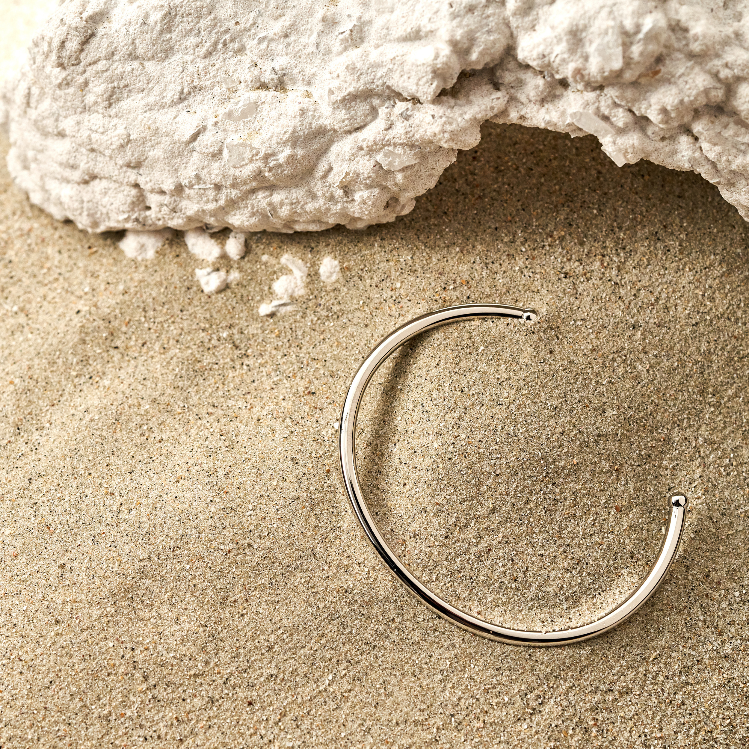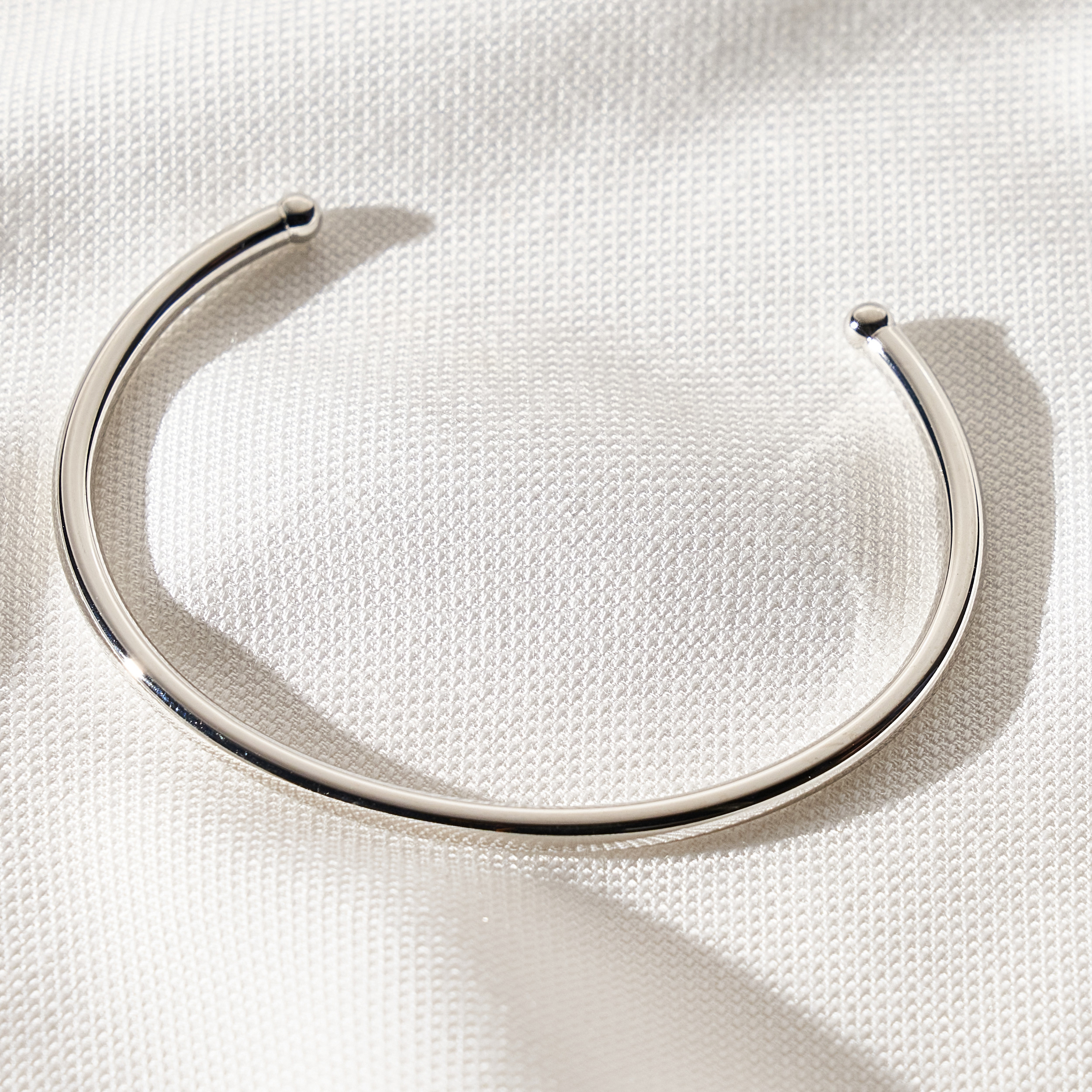 O bracelete Peyton é um modelo com tubo circular e pequenas esferas na pontas. Banhado em ródio branco, recebeu camada de verniz antialérgico e não possui níquel na composição.