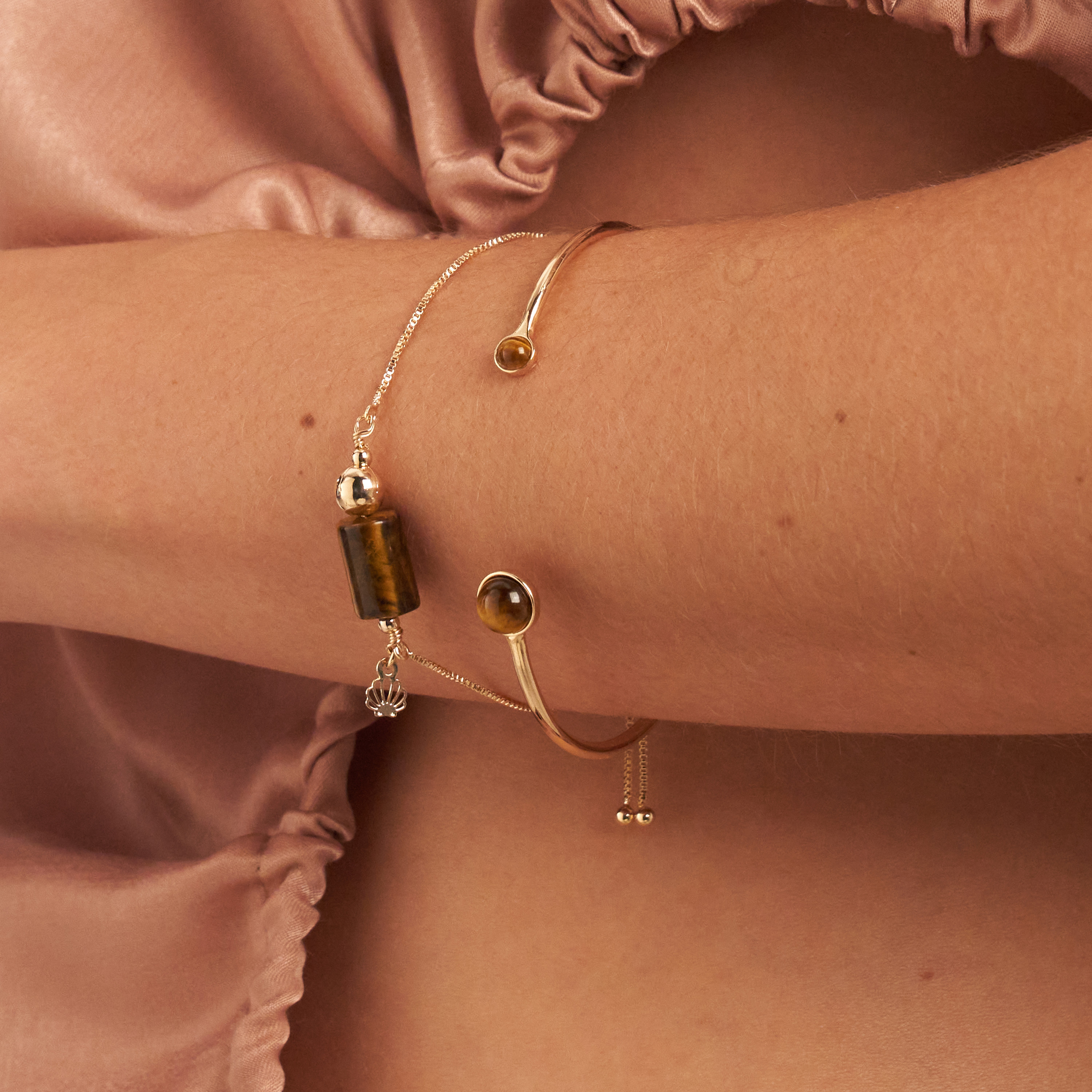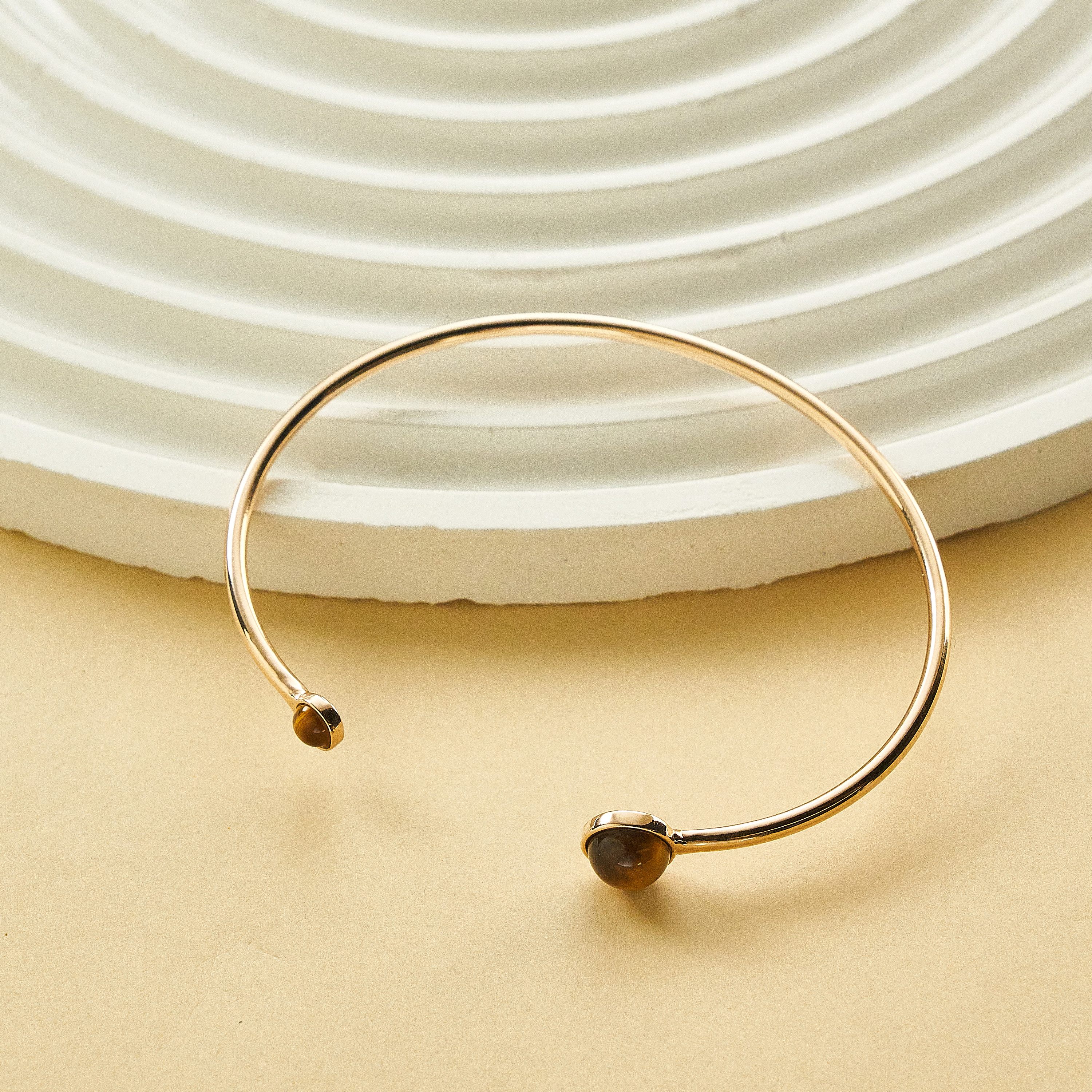 O bracelete Ramona é um modelo com tubo circular fino e duas pedras naturais de olho de tigre na pontas. Banhado em ouro 18k, recebeu camada de verniz antialérgico e não possui níquel na composição.
