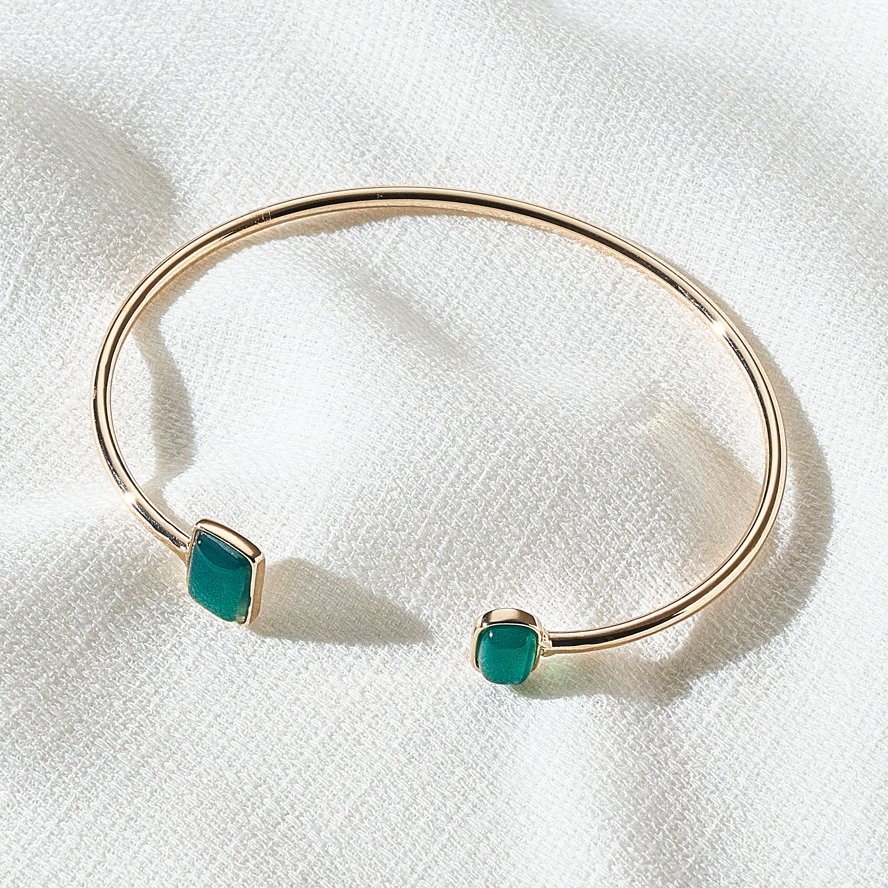 O bracelete Shantal é um modelo com tubo circular fino e duas pedras naturais de ágata verde na pontas. Peça banhada em ouro 18k, recebeu camada de verniz antialérgico e não possui níquel na composição.