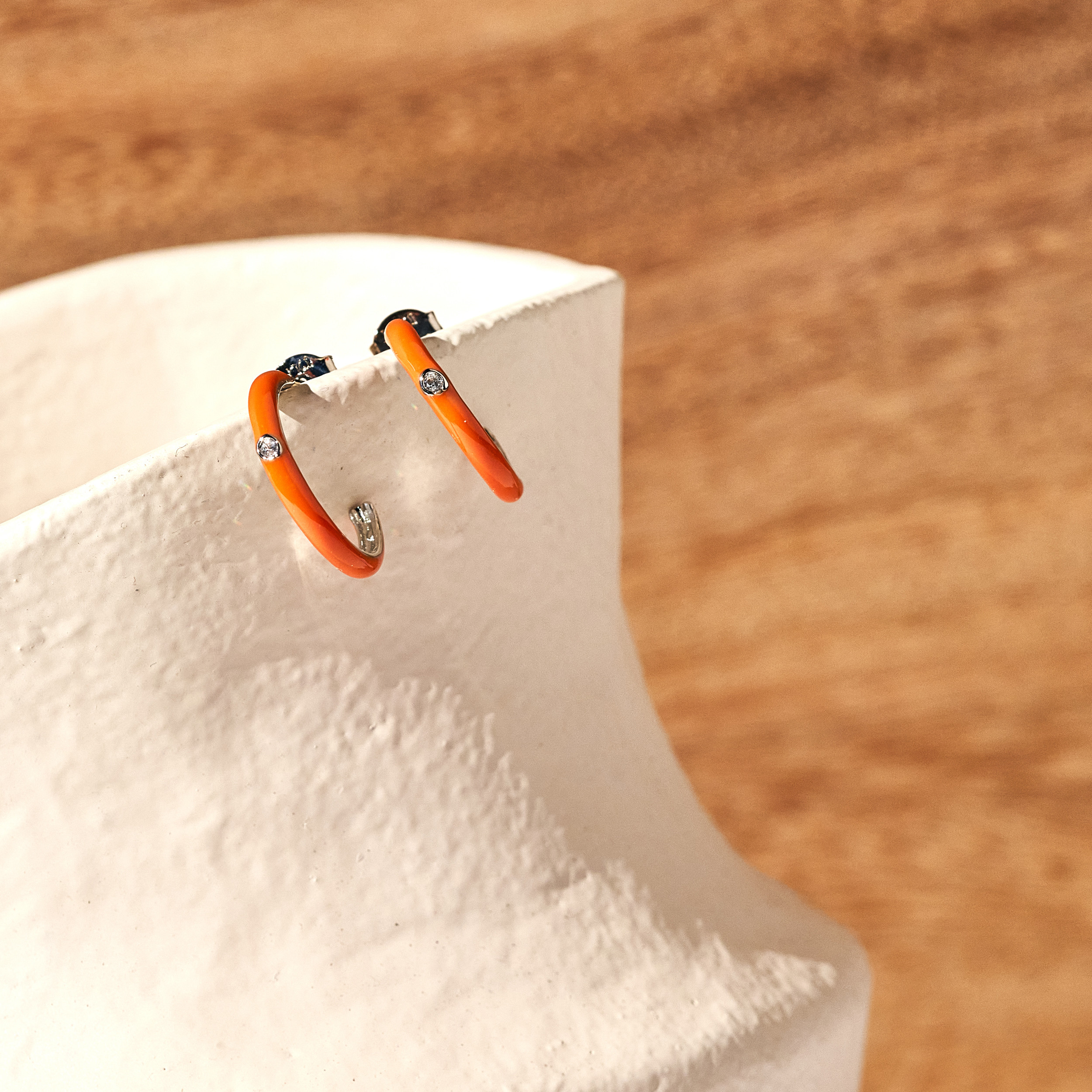 Brinco Ada moderno de argola com detalhe de ponto de luz de zircônia e resina laranja. Tarraxa personalizada (Una - Ps 139:14). Banhado em ródio branco, com verniz antialérgico e níquel free.