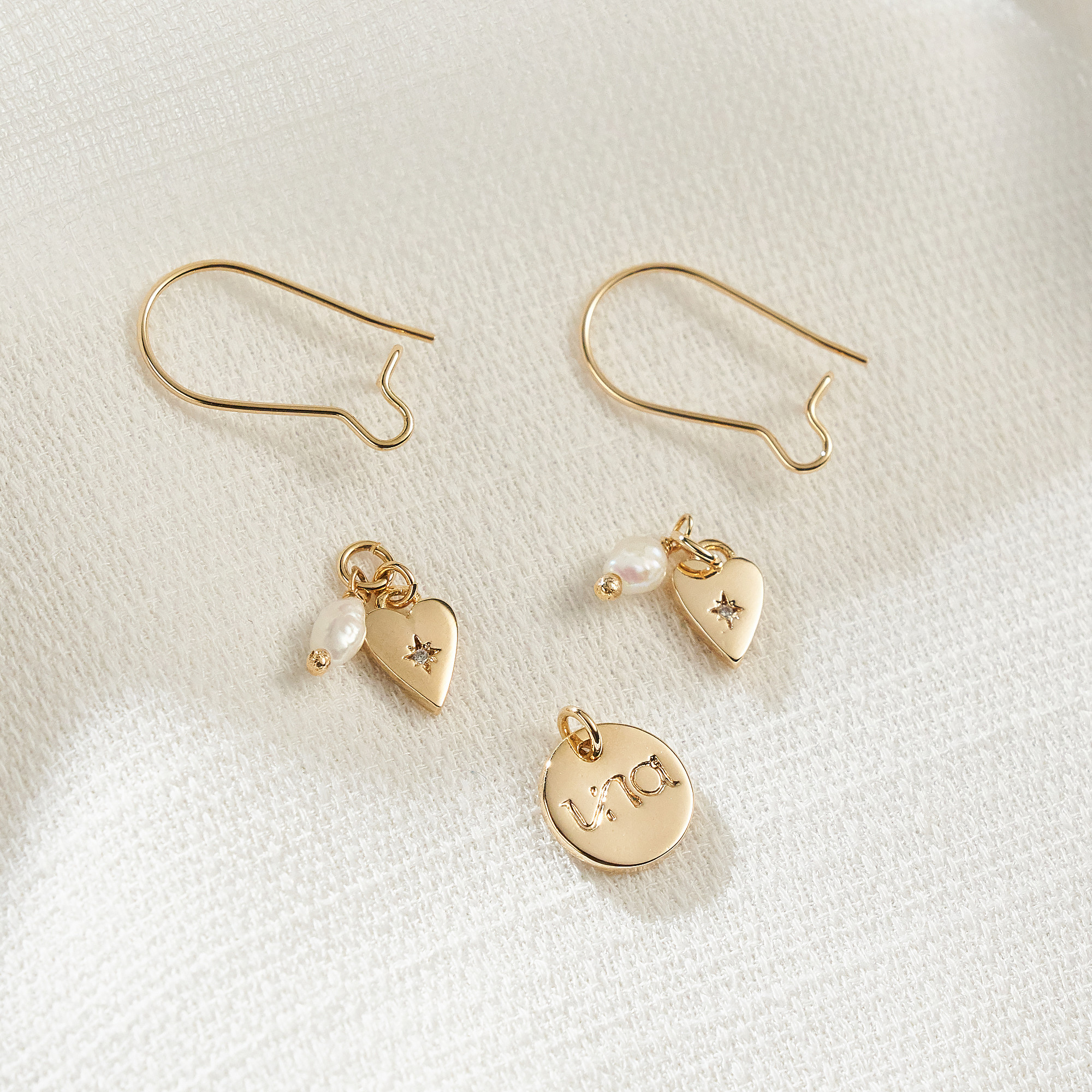 Brinco Ana Clara irregular de gancho, pingente removível de mini coração com ponto de luz de zircônia e mini pérola barroca arroz irregular.Fecho de encaixe. Mini placa redonda (Ps 139:14). Banhado em ouro 18k, com verniz antialérgico e níquel free. Podem ter variações no formato e cor da pérola.