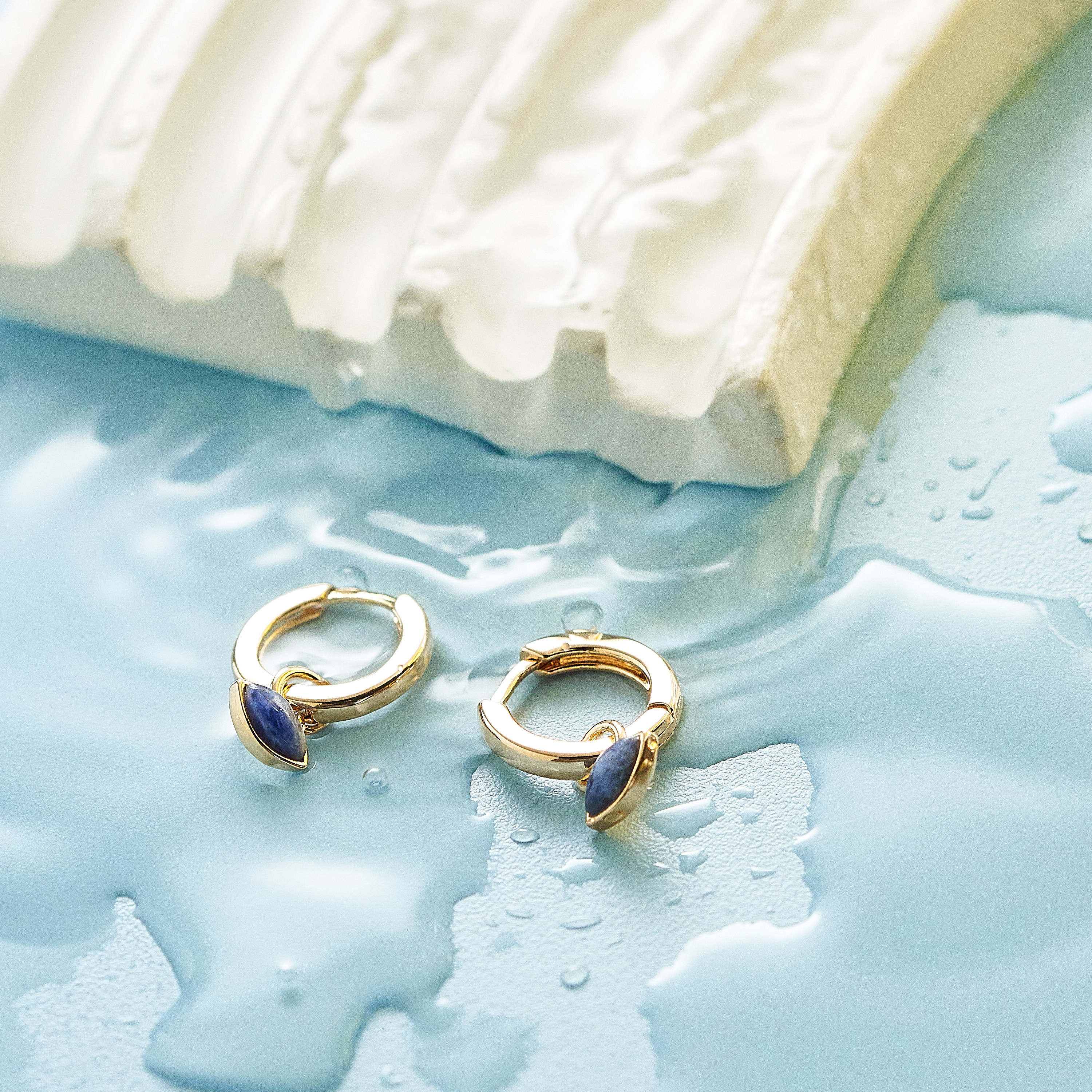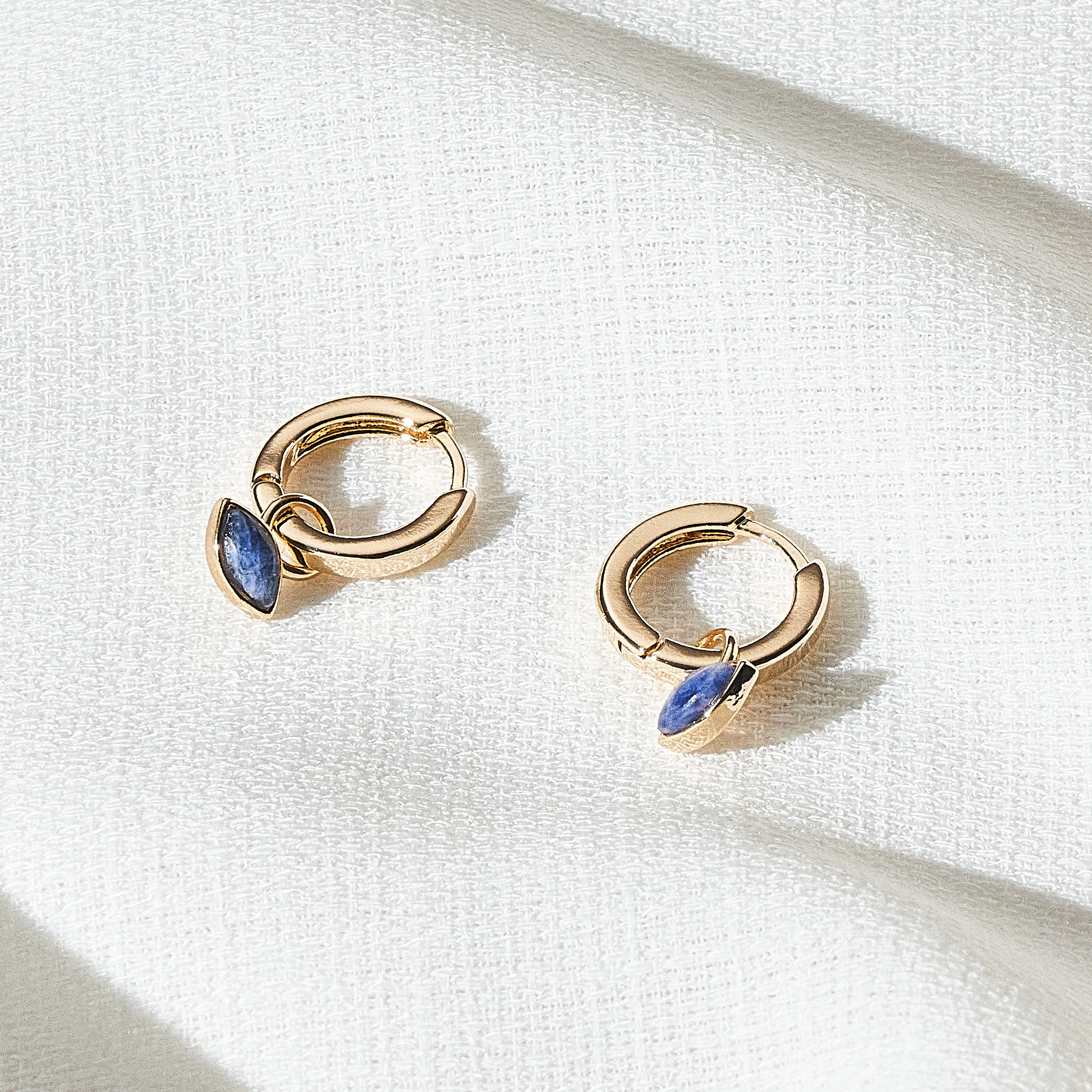 De argola com fecho clique e pingente de pedra sodalita, o brinco Ayanna traz modernidade para a composição, o pingente por ser removível torna o brinco dois em um, possibilitando a criação de looks diferenciados. Banhado em ouro 18k, com verniz antialérgico e níquel free.