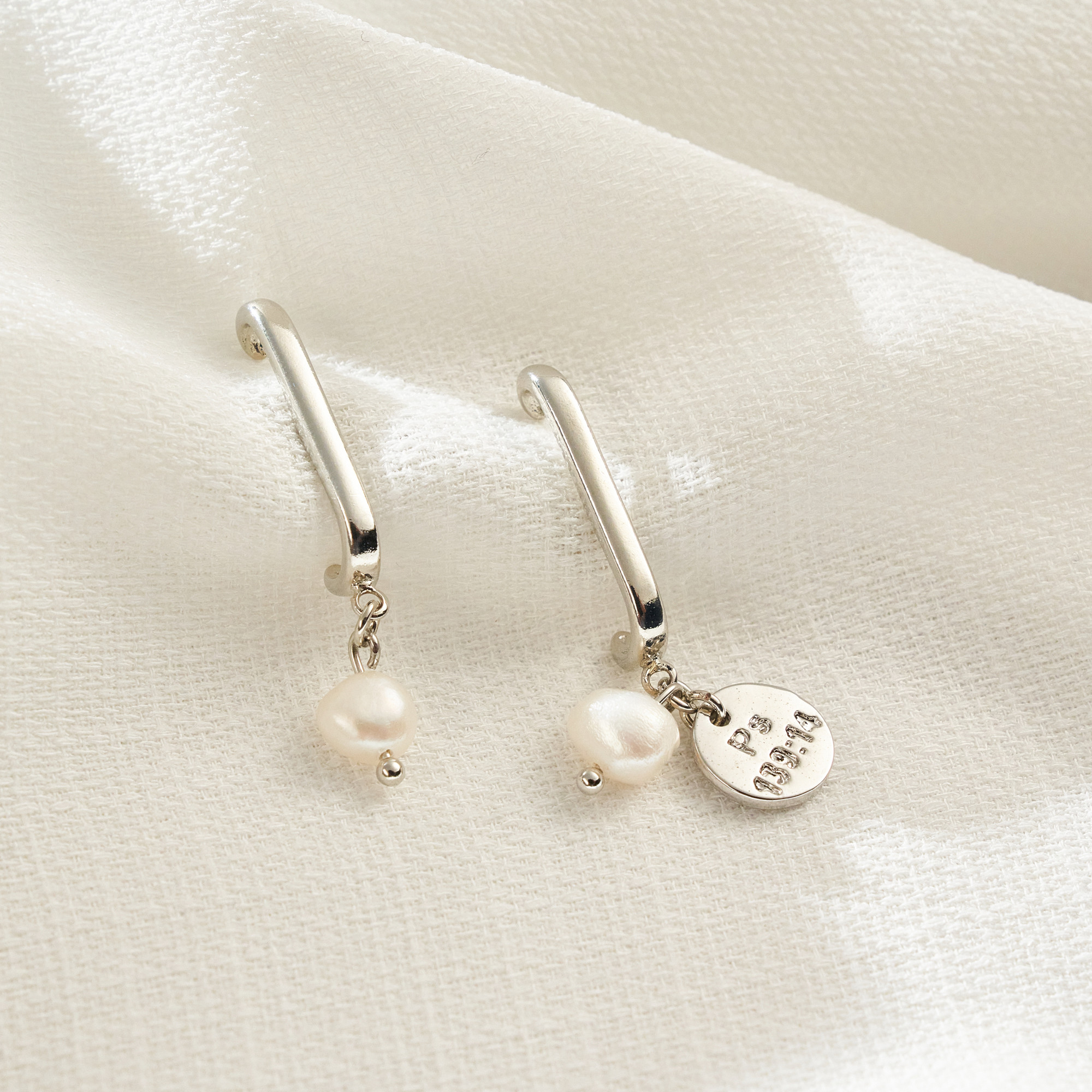 Brinco Brienne irregular moderno ear hook com pingente de pérola pão. Mini placa redonda (Ps139:14). Tarraxa borboleta. Banhado em ródio branco, com verniz antialérgico e níquel free. Pode ter variação no formato e cor das pérolas.