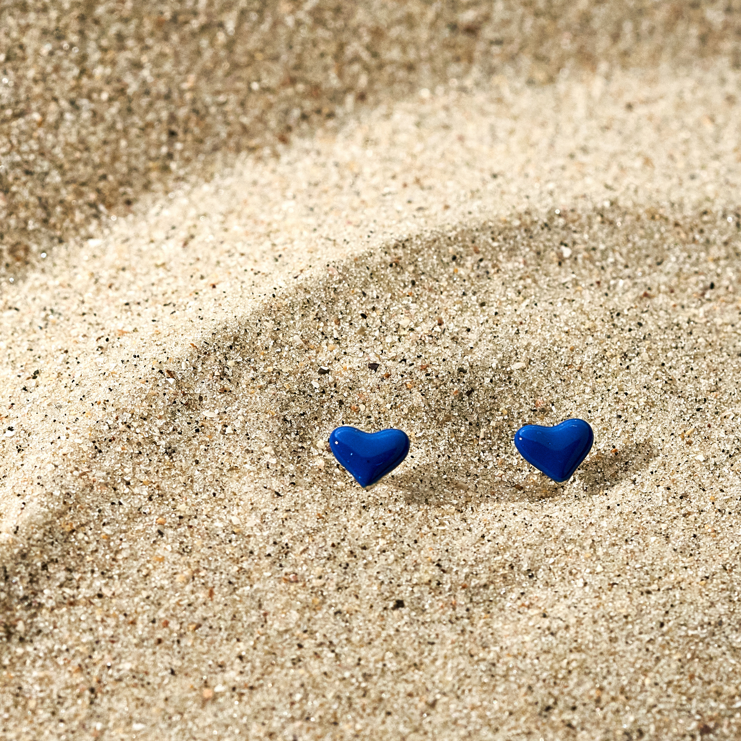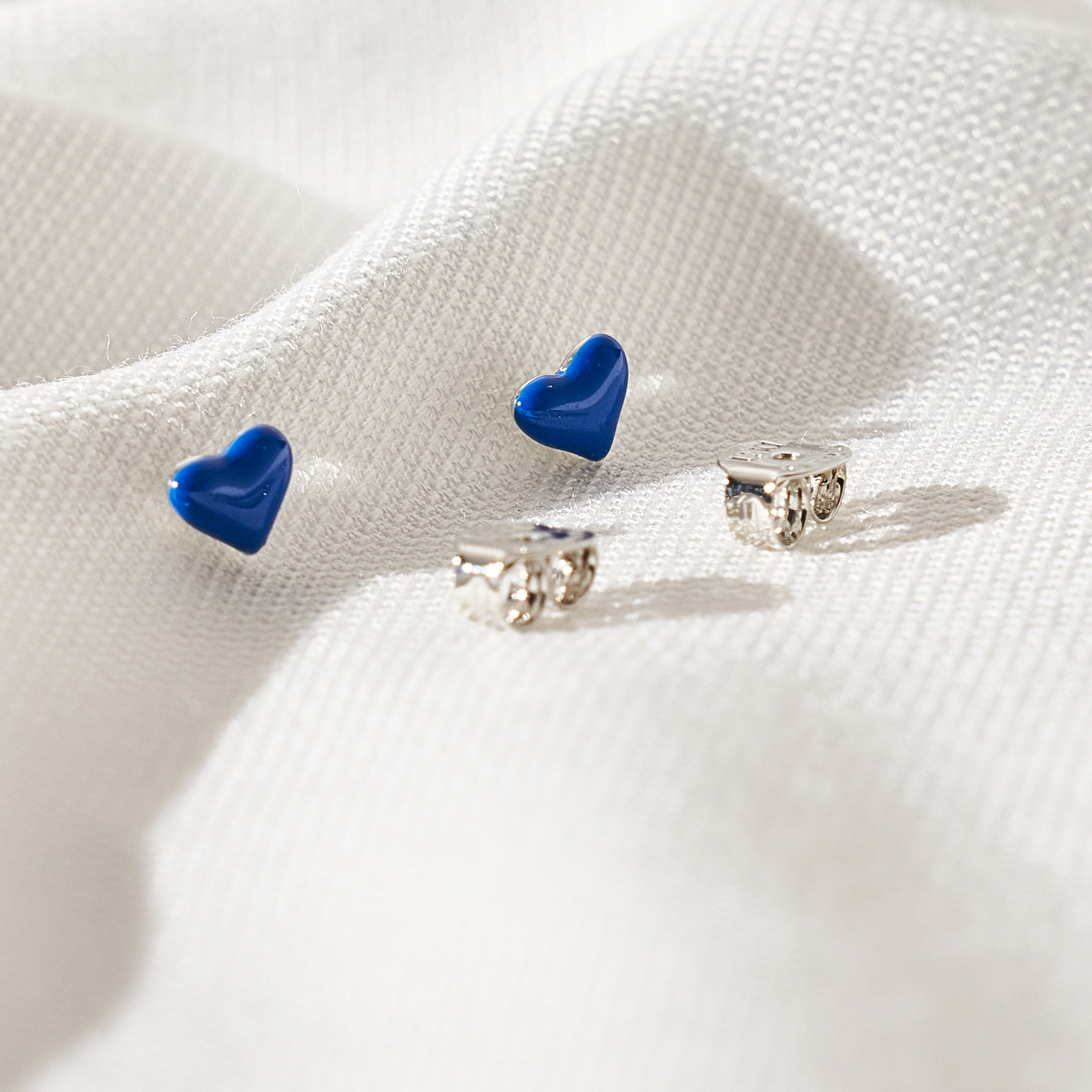 Brinco Caia delicado de mini coração menor com detalhe de resina azul. Ideal para ser usado no segundo furo. Tarraxas personalizadas (Una - Ps 139:14). Banhado em ródio branco, com verniz antialérgico e níquel free.