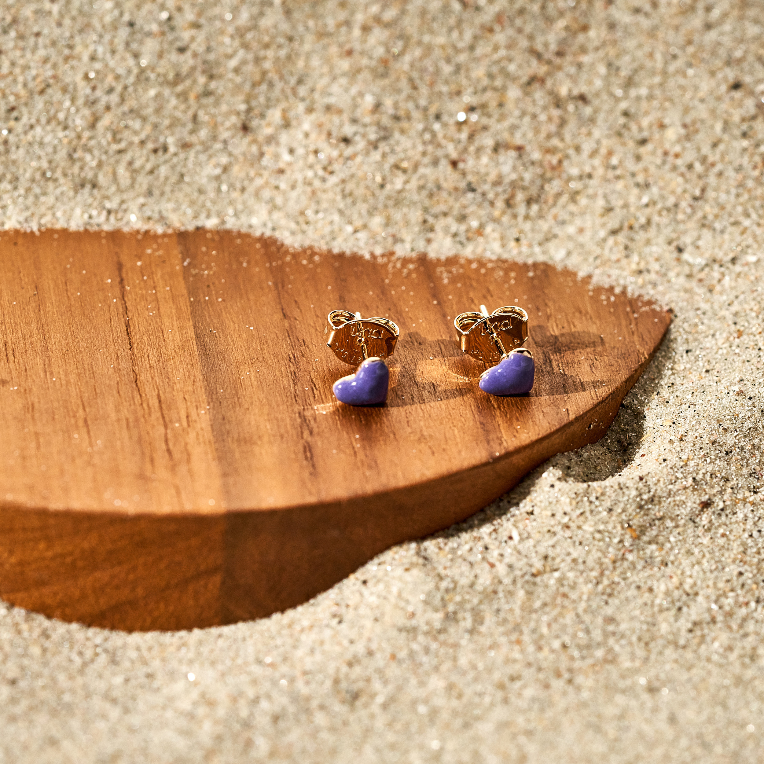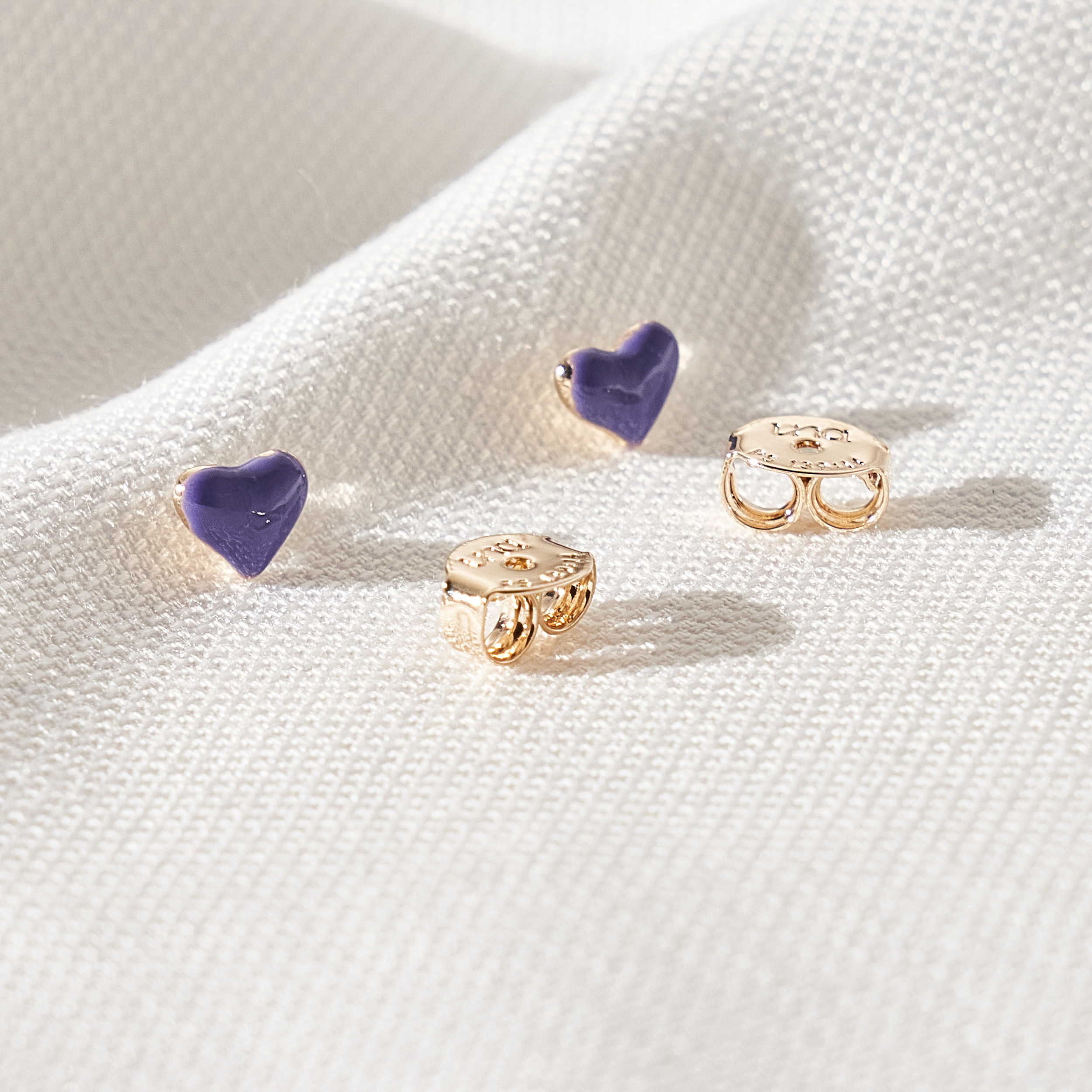 Brinco Caia delicado de mini coração menor com detalhe de resina violeta. Ideal para ser usado no segundo furo. Tarraxas personalizadas (Una - Ps 139:14). Banhado em ouro 18k, com verniz antialérgico e níquel free.