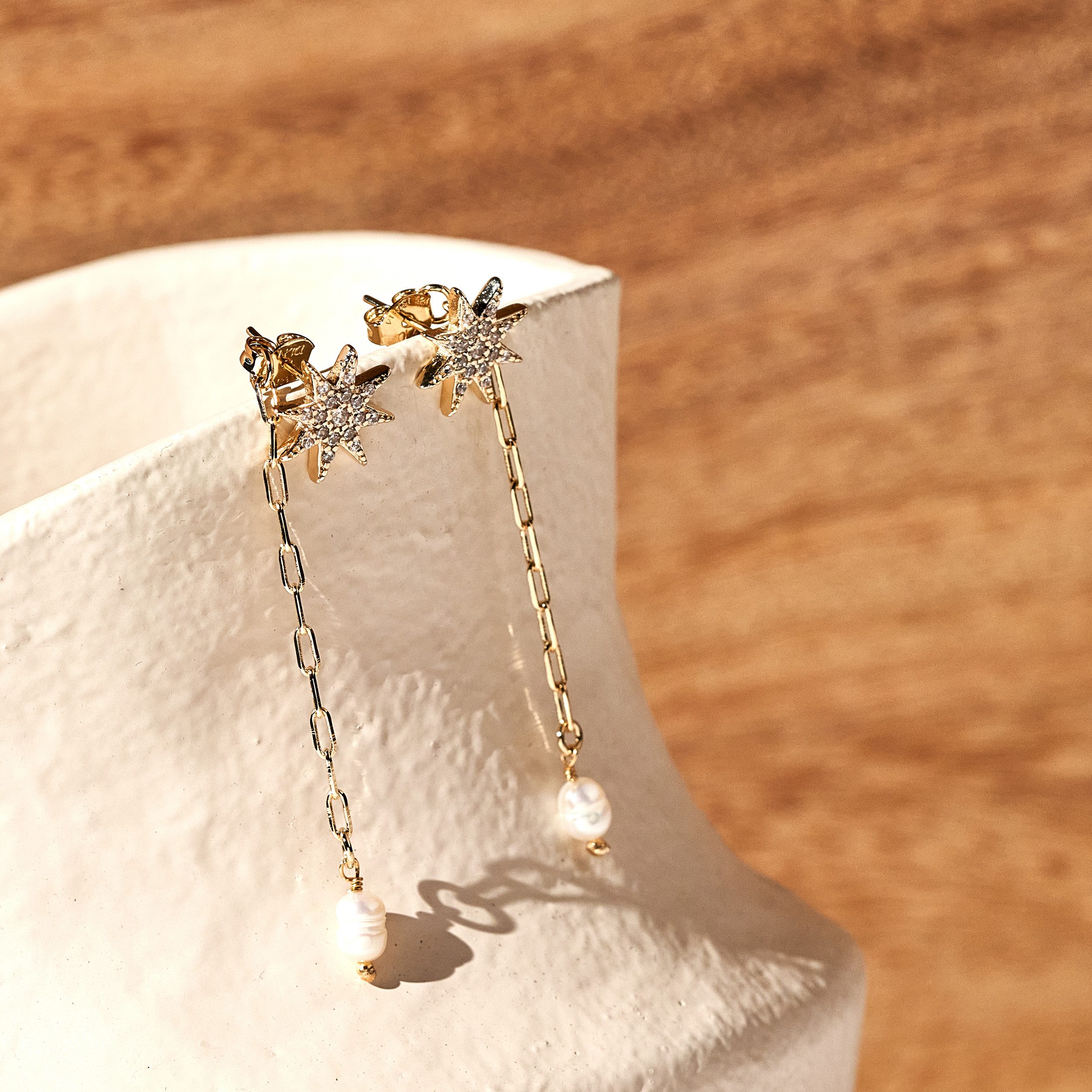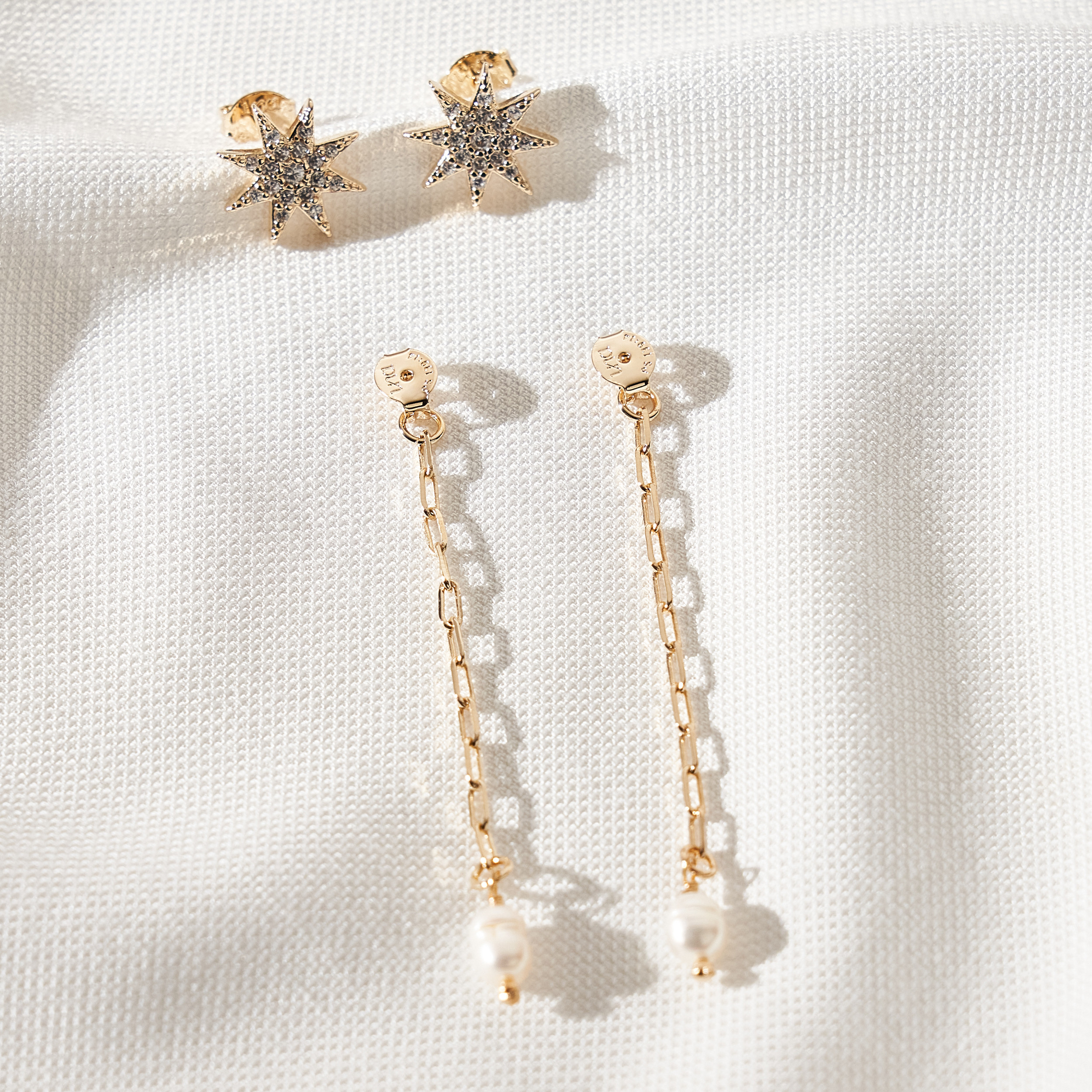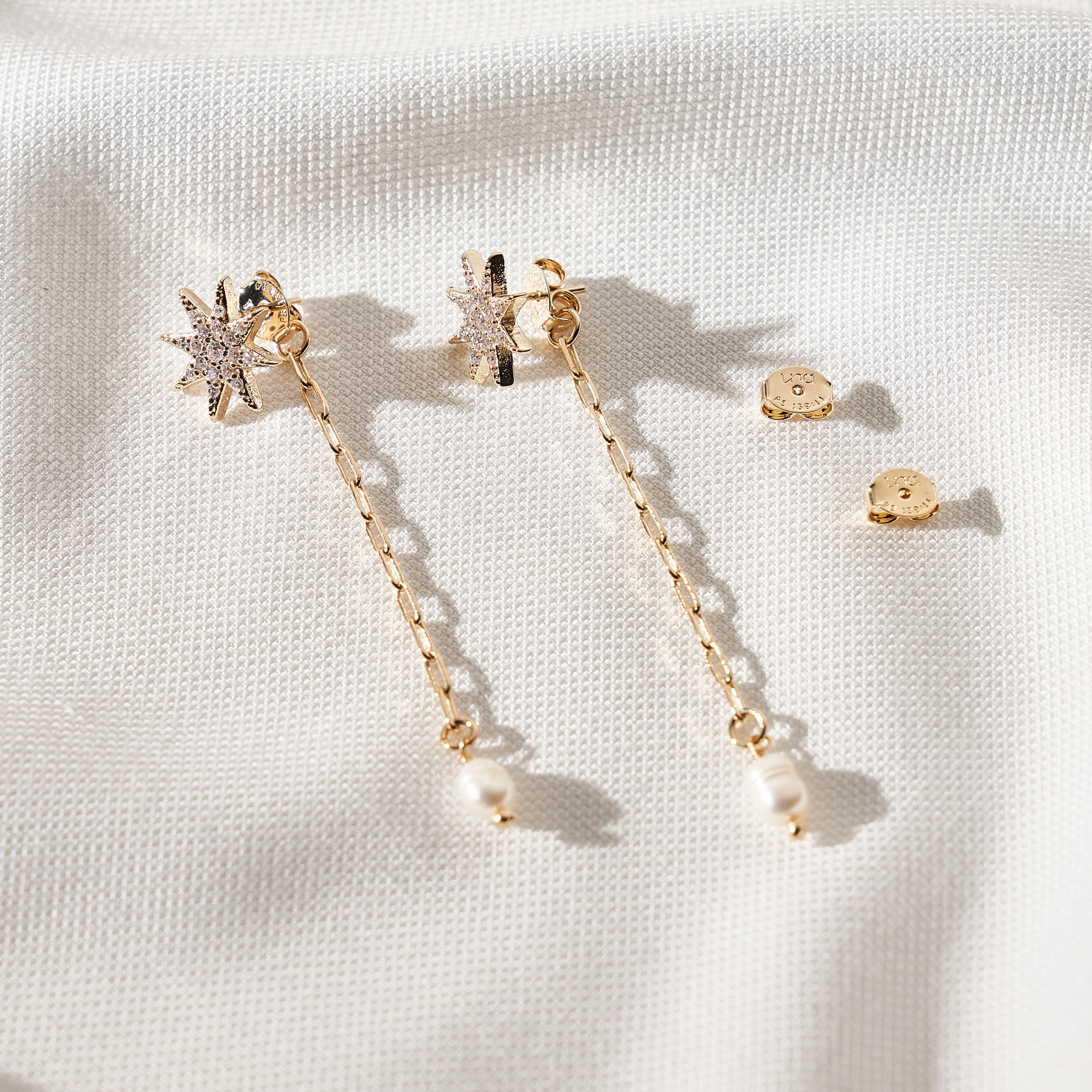 Brinco Cita minimal 2 em 1. Base de estrela cravejado de zircônias e detalhe de corrente de cartier com pérolas barrocas arroz de água doce. Pode ser usado na versão com corrente ou somente o brinco base. Tarraxas personalizadas (Una - Ps 139:14). Banhado em ouro 18k, com verniz antialérgico e níquel free. Pode ter variações no formato e cor das pérolas.