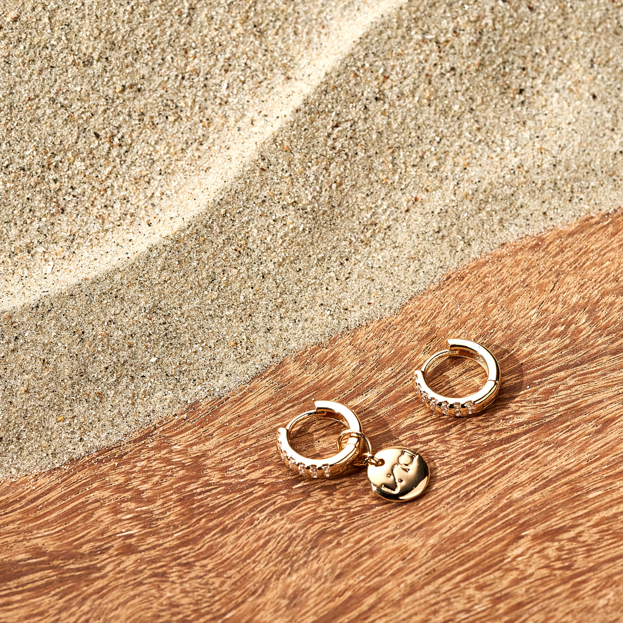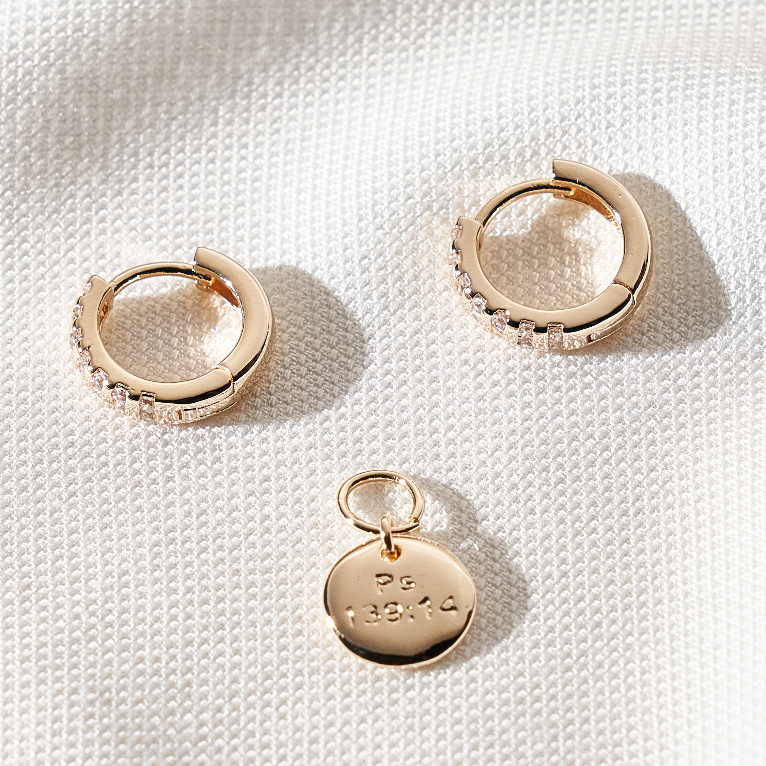 Brinco Consuelo clássico de base clique cravejado de zircônias e detalhe de pingente removível de mini placa (Una - Ps 139:14). Banhado em ouro 18k, com verniz antialérgico e níquel free.