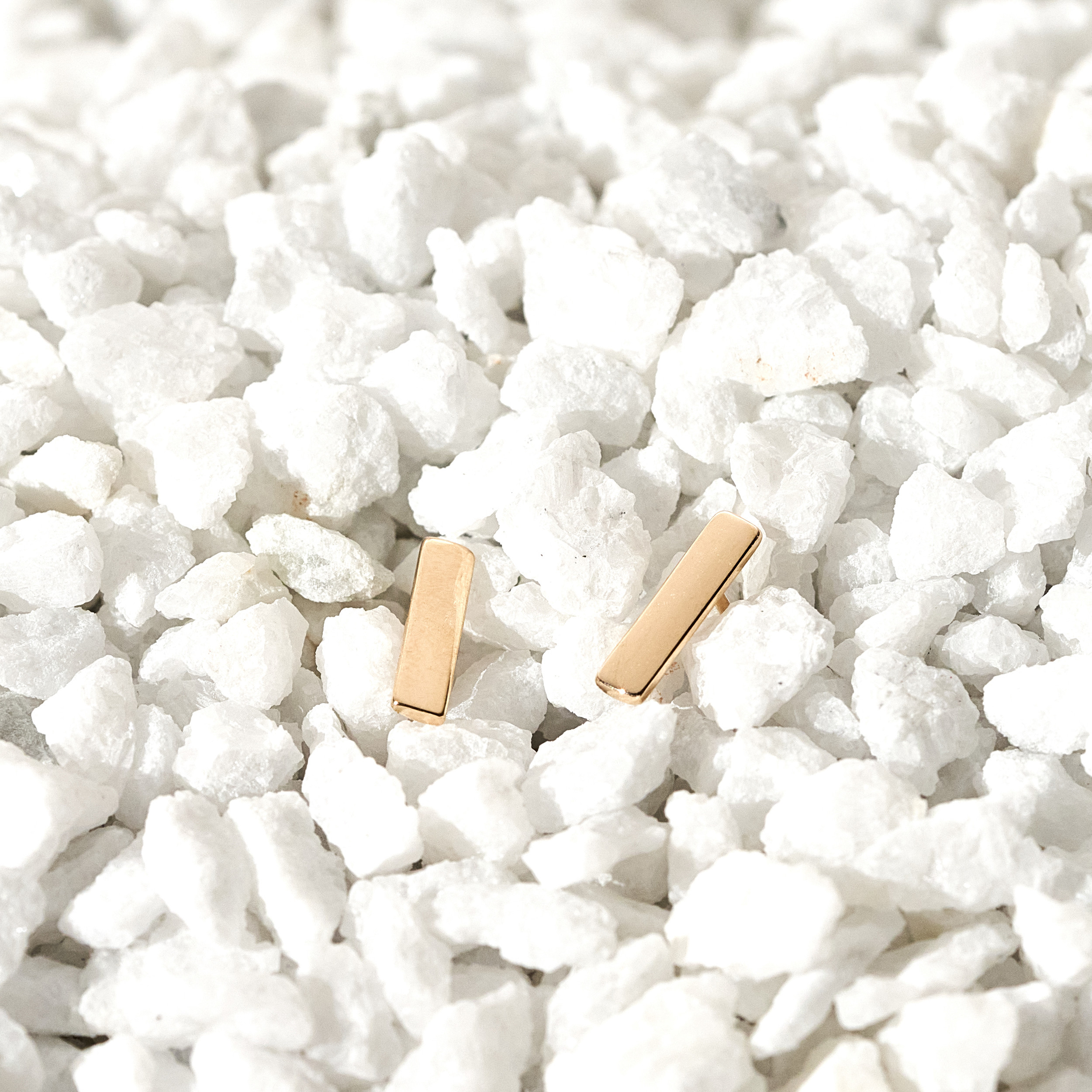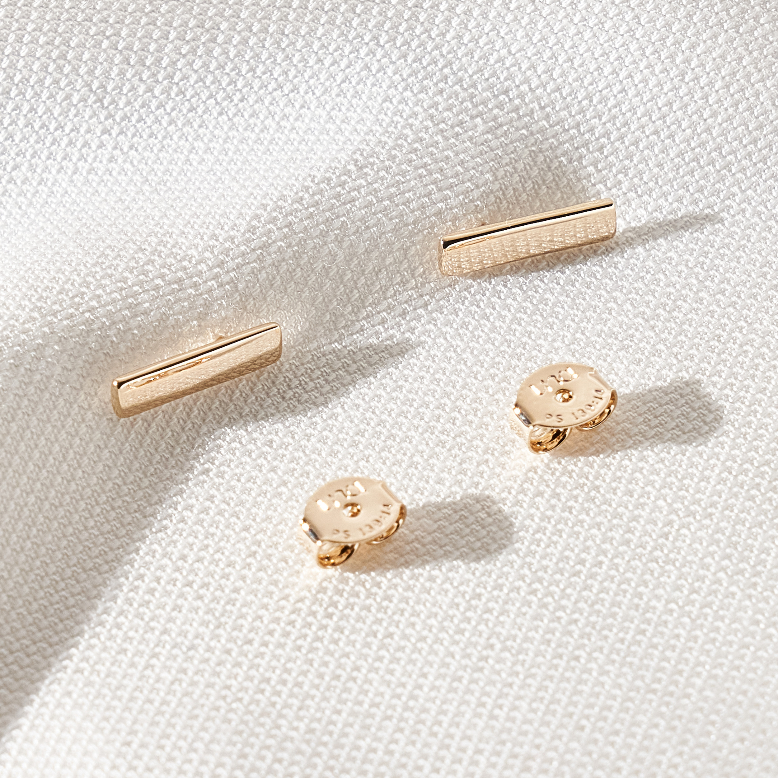 Brinco Corina elegante com base reta de metal. Tarraxa personalizada (Una - Ps 139:14). Banhado em ouro 18k, com verniz antialérgico e níquel free.