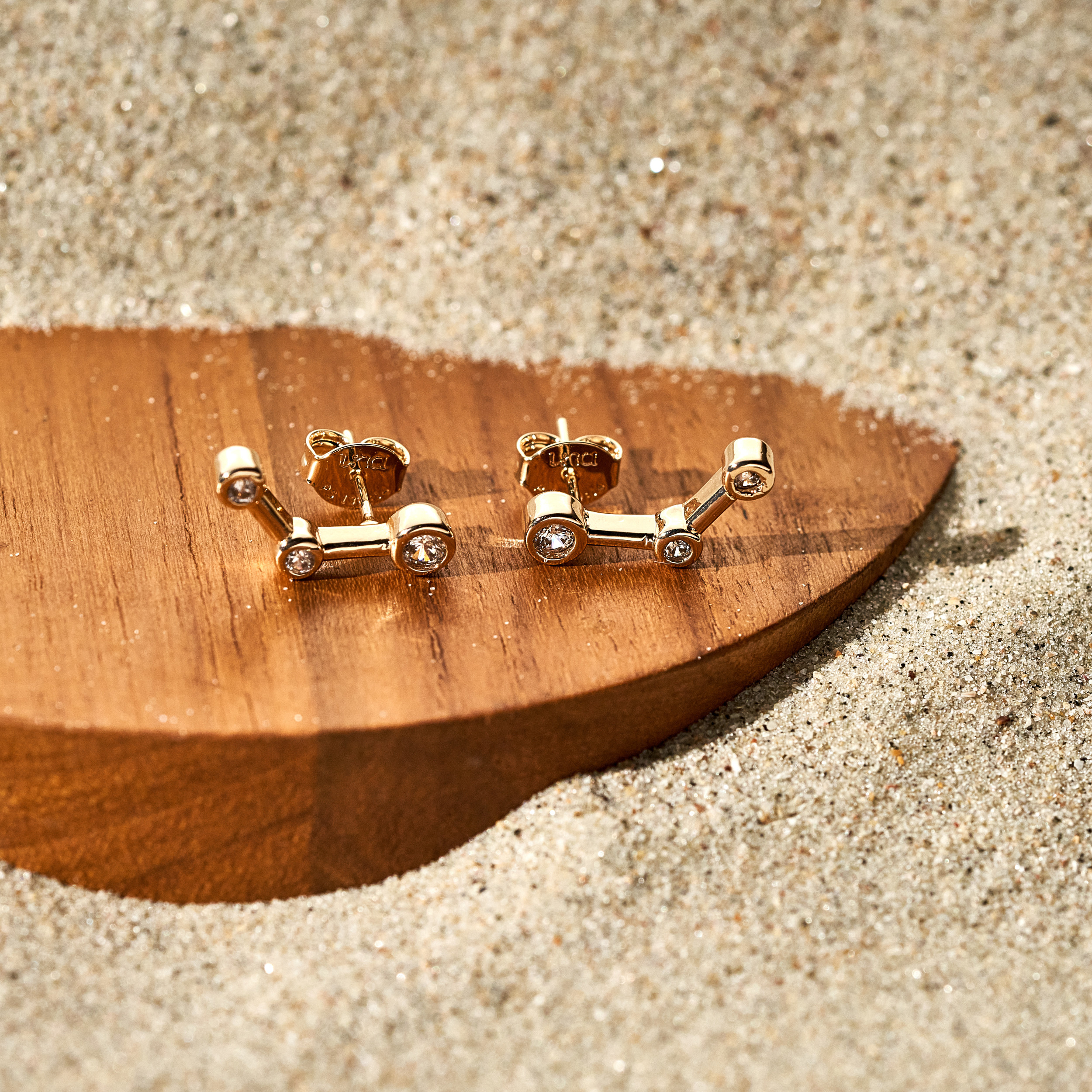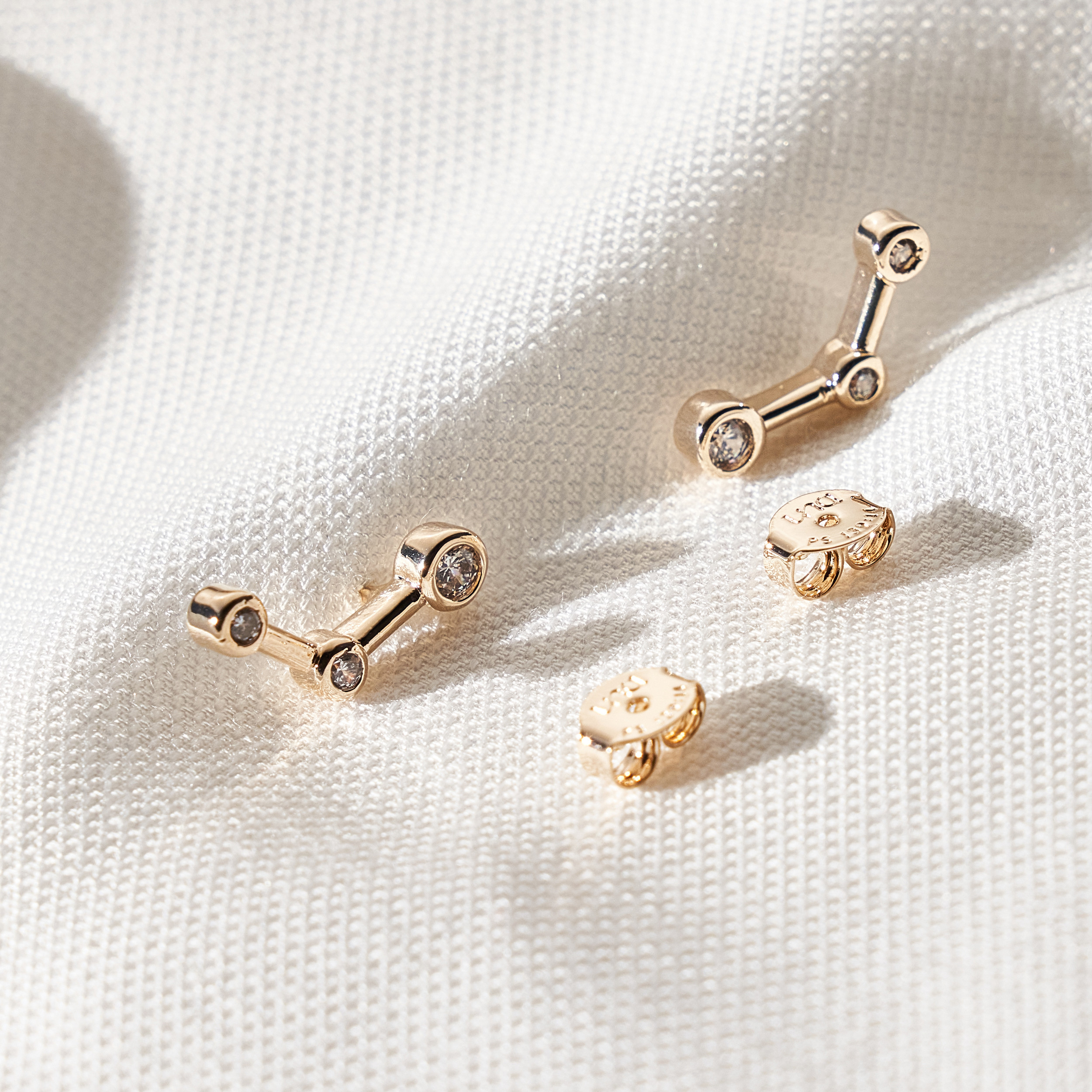 Brinco Diara minimal com base de três zircônias. Tarraxa personalizada (Una - Ps 139:14). Banhado em ouro 18k, com verniz antialérgico e níquel free.
