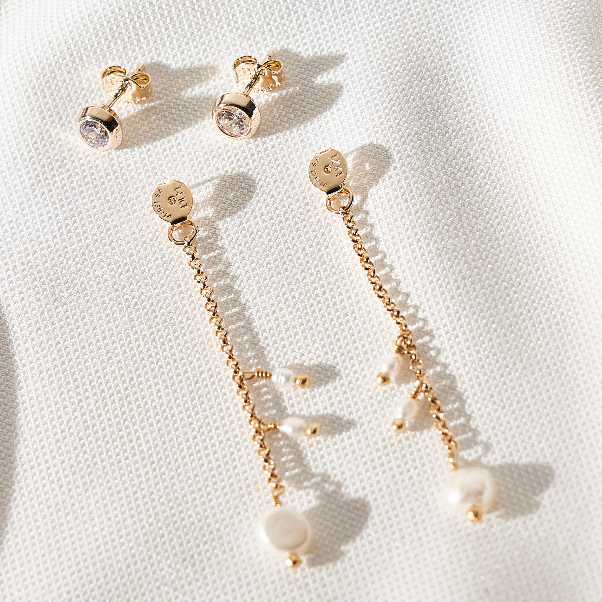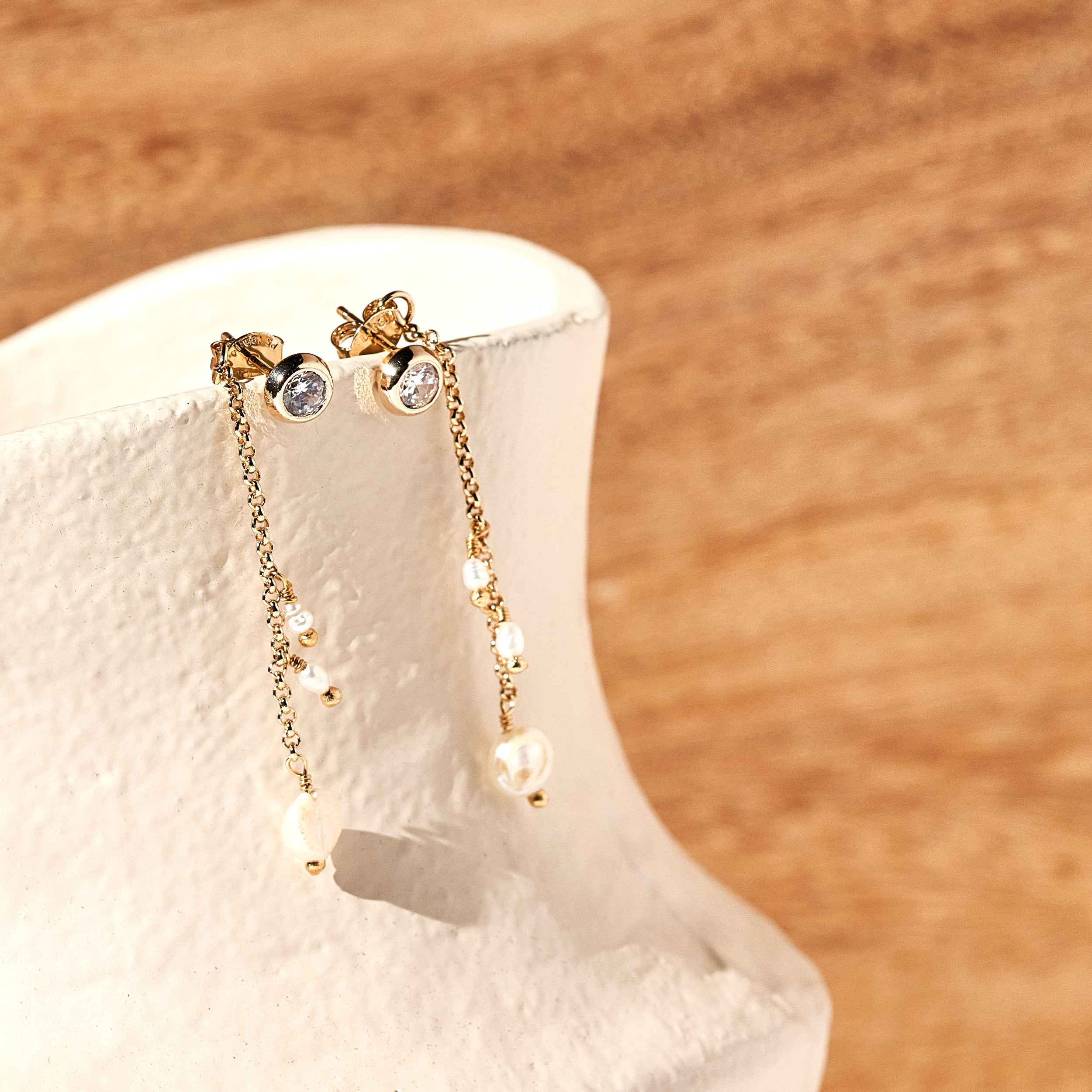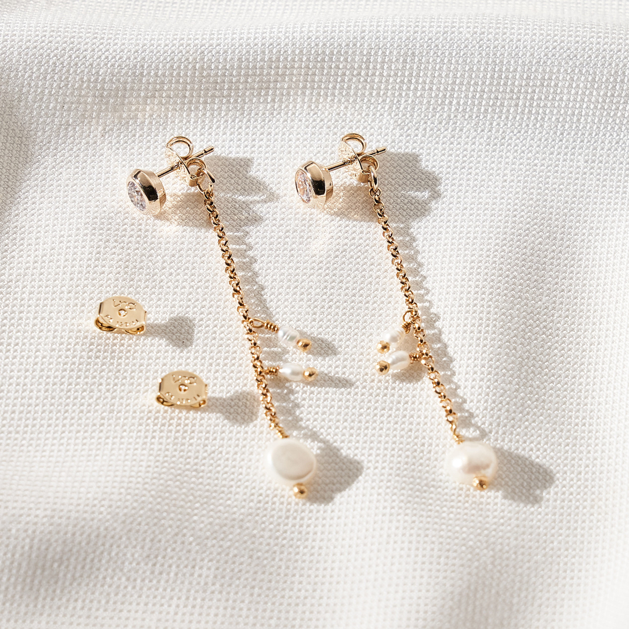 Brinco Eda minimal 2 em 1. Base de ponto de luz de zircônias e detalhe de corrente de elo português com mix pérolas barrocas de água doce. Pode ser usado na versão com corrente ou somente o brinco base. Tarraxas personalizadas (Una - Ps 139:14). Banhado em ouro 18k, com verniz antialérgico e níquel free. Pode ter variações no formato e cor das pérolas.