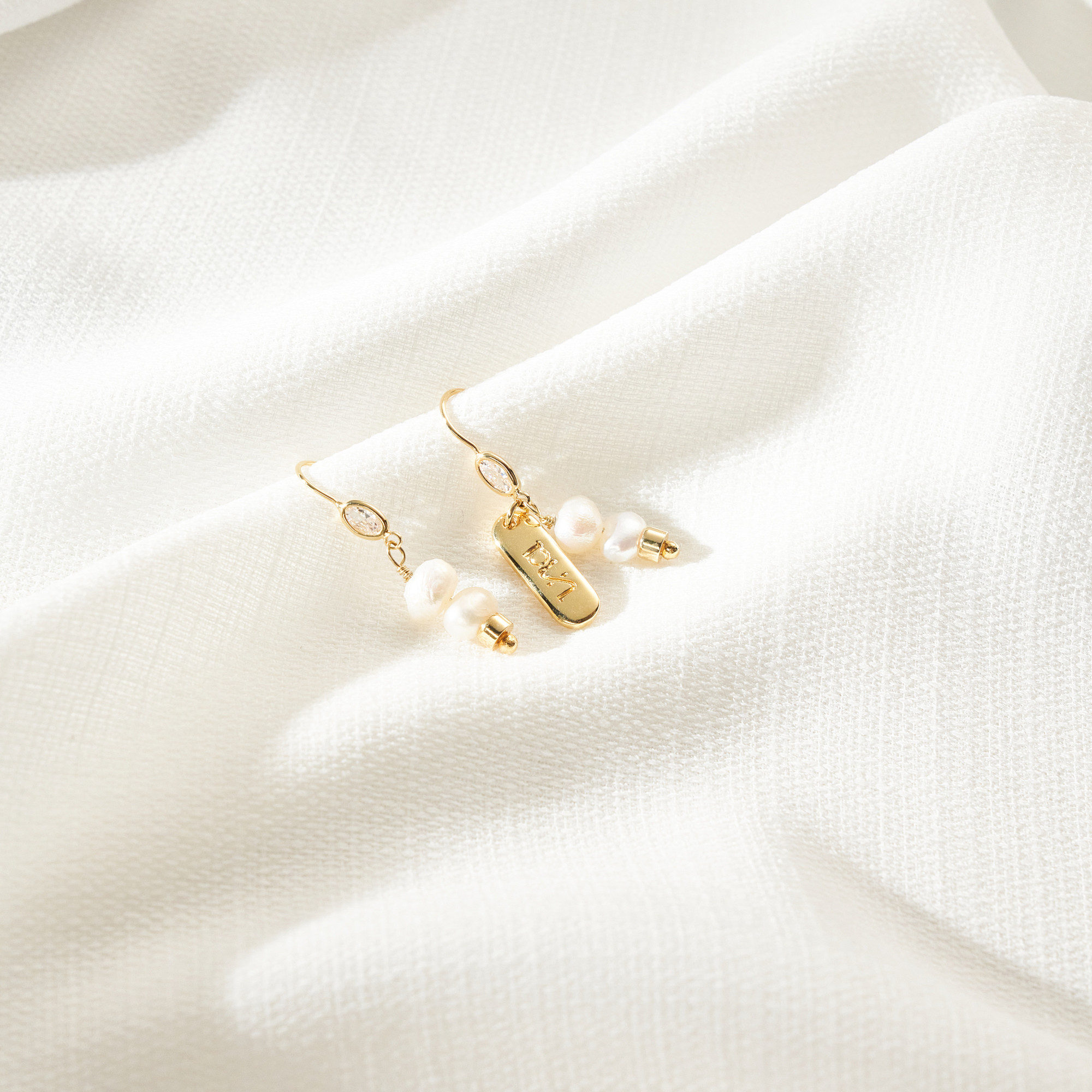 Brinco Eleonora básico irregular de gancho, com detalhe de zircônia oval e pingente de 2 pérolas barrocas irregulares. Mini placa (Ps139:14). Banhado em ouro 18k, com verniz antialérgico e níquel free. Podem ter variações no formato e cor da pérola.