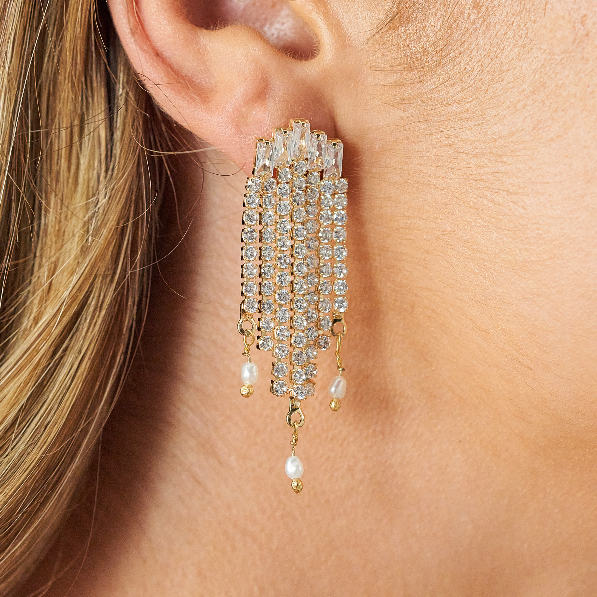 Brinco Gisele requintada com base de zircônia retangular com cascata de riviera de zircônias e mini pérolas arroz na ponta. Tarraxa borboleta. Banhado e ouro 18k. Níquel free com verniz antialérgico. Pode ter variação no formato e cor da pérola.