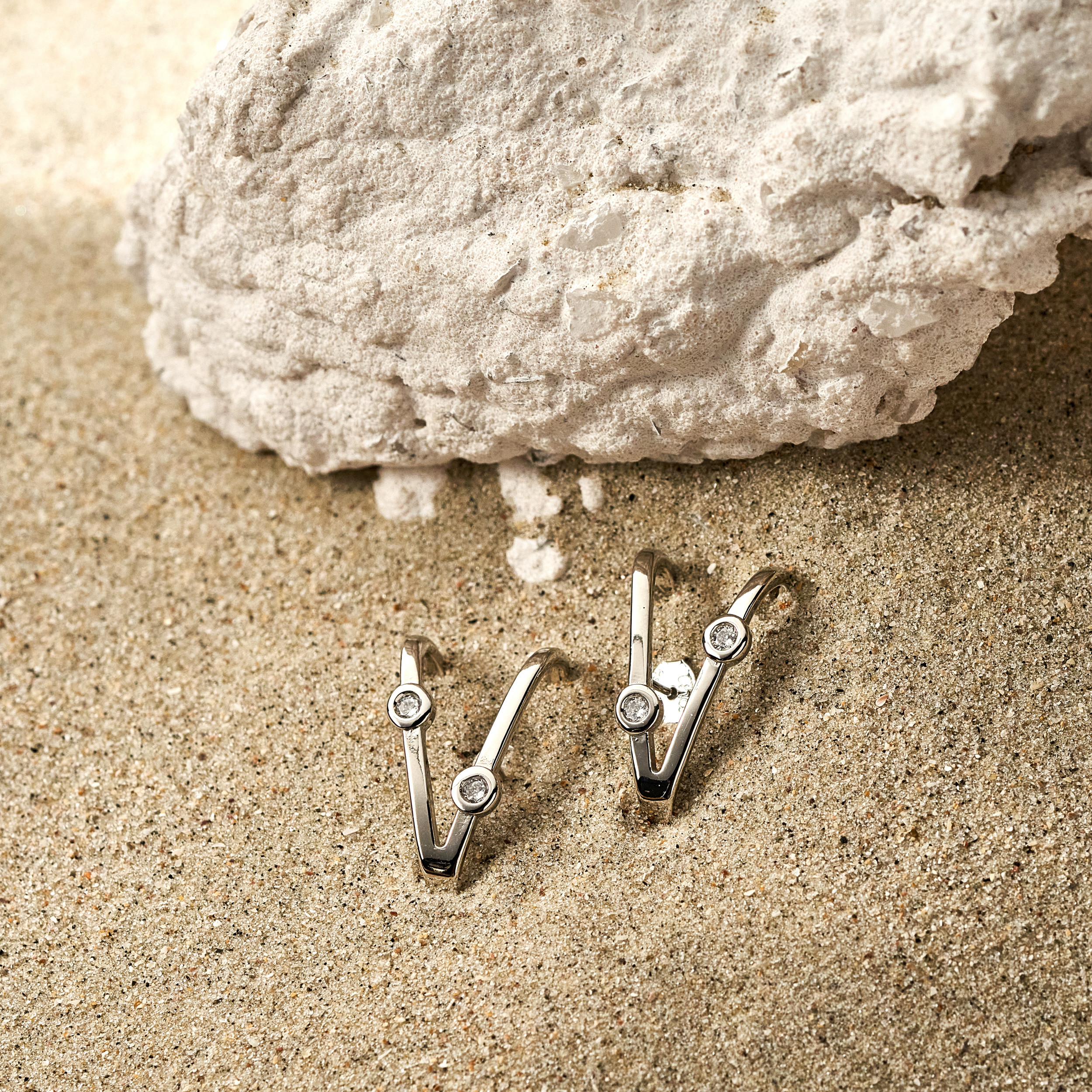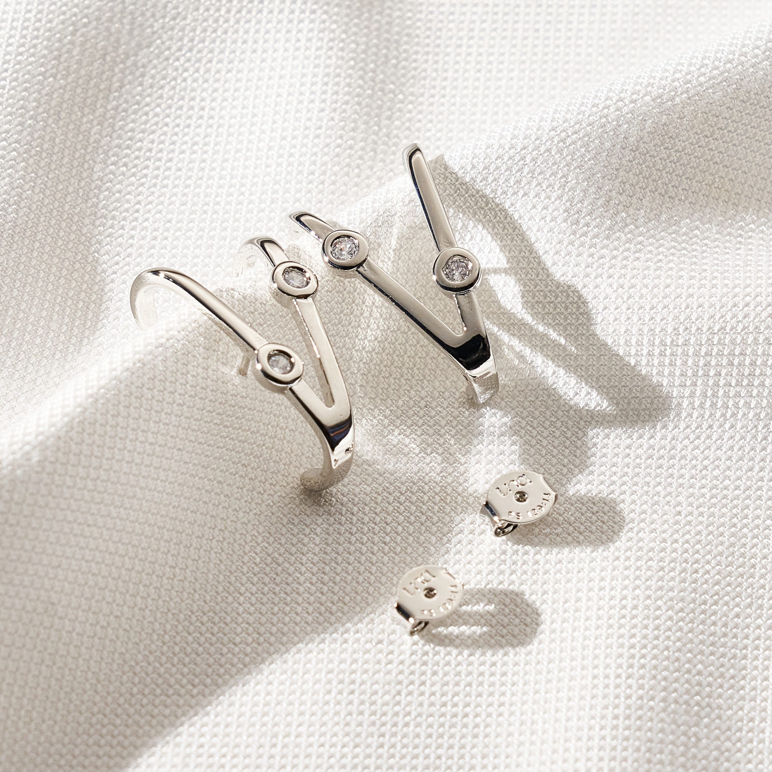 Brinco Heda moderno com base dupla anatômica e detalhe de pontos de luz de zircônias. Tarraxa personalizada (Una - Ps 139:14). Banhado em ródio branco, com verniz antialérgico e níquel free.