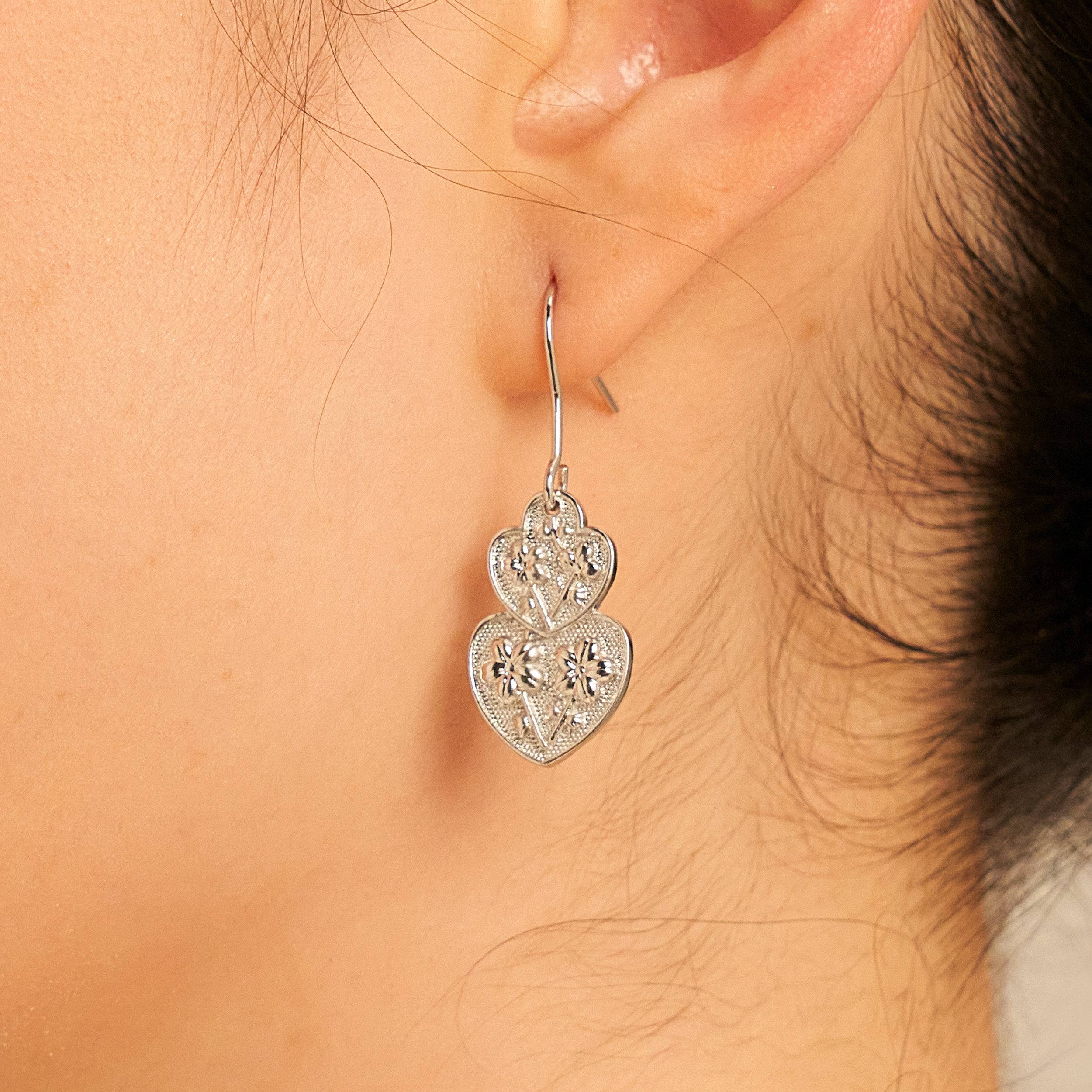 O brinco Hyun esbanja charme com seus delicados detalhes, a base é de coração duplo com pequenas flores em relevo, o diferencial está no encaixe de gancho que facilita a colocação da peça. Banhado em ródio branco, com verniz antialérgico e níquel free.