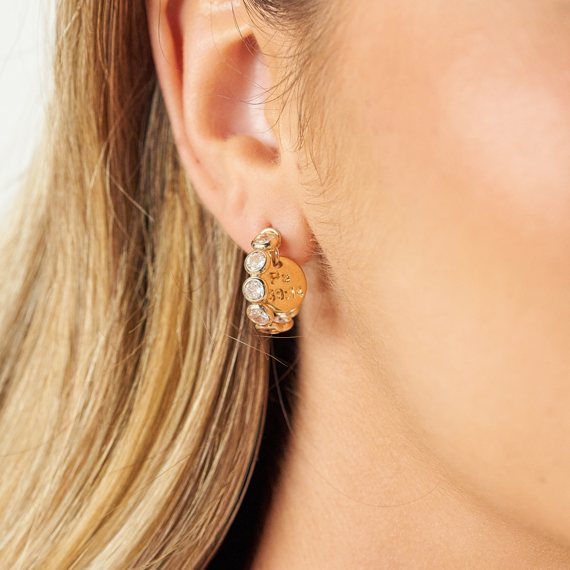 Brinco Iracema formosa de argola com zircônias. Tarraxa borboleta. Mini placa (Ps 139:14). Banhado em ouro 18k. Níquel free com verniz antialérgico.