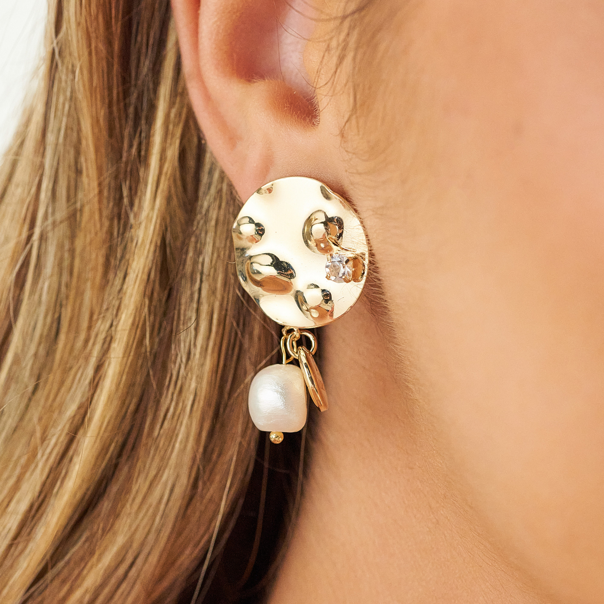 Brinco Janes moderno com base redonda irregular, detalhe em zircônia e pérola pão no balanço. Mini placa redonda (Ps 139:14) e tarraxa borboleta. Banhado em ouro 18k. Níquel free e com verniz antialérgico. Pode ter variação no formato e cor da pérola.