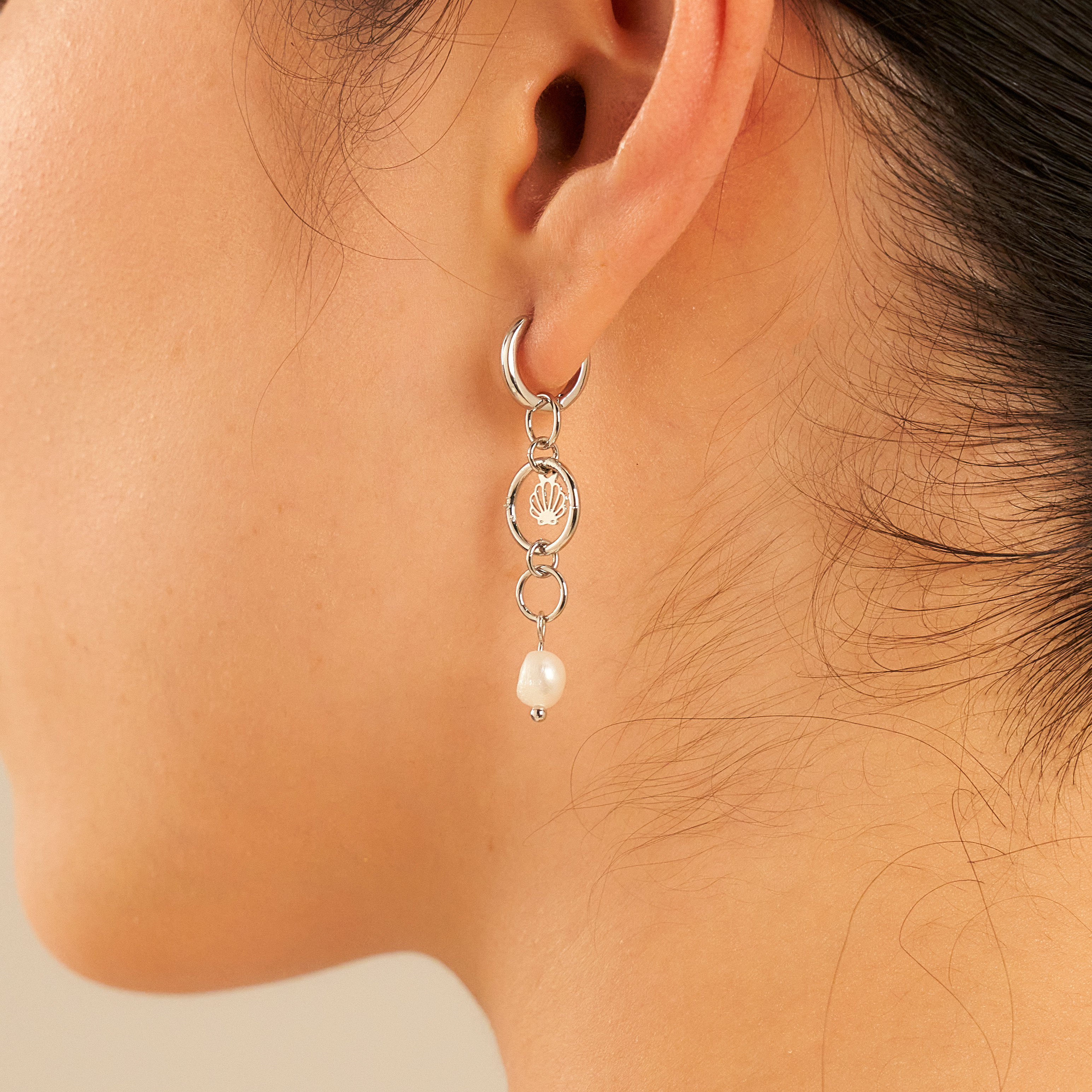 Delicado mas com um ar sofisticado, o brinco Jihye faz a brincadeira com três argolas, finalizando com o pingente de pérola pão. Ideal para qualquer ocasião, é aquela peça que vai bem com tudo. Peça banhada em ródio branco, com verniz antialérgico e níquel free. Pode ter variações no formato e cor da pérola. Possui fecho clique e detalhe da nossa concha Una.