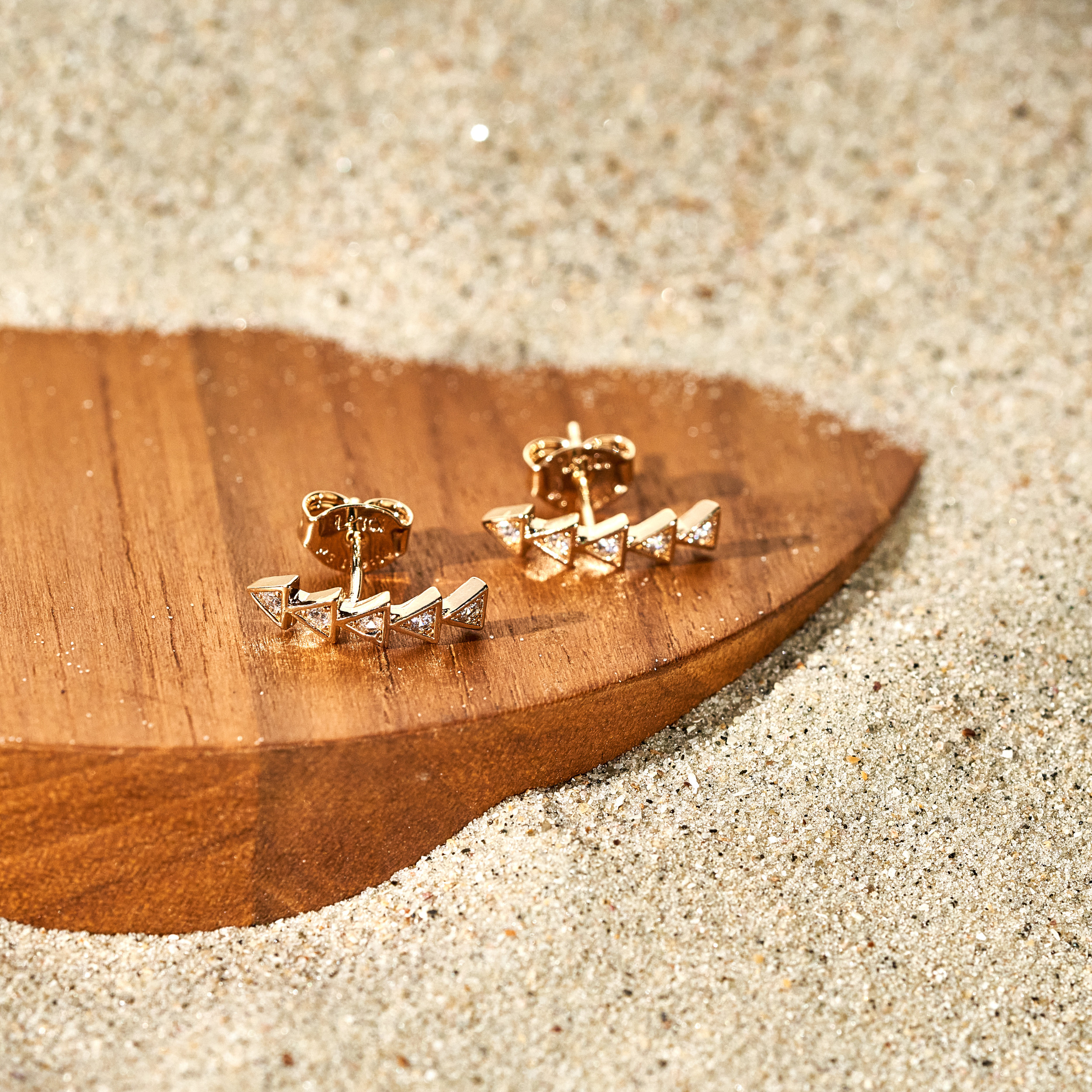 Brinco Joele moderno com base de triângulos cravejado de zircônias. Tarraxa personalizada (Una - Ps 139:14). Banhado em ouro 18k, com verniz antialérgico e níquel free.