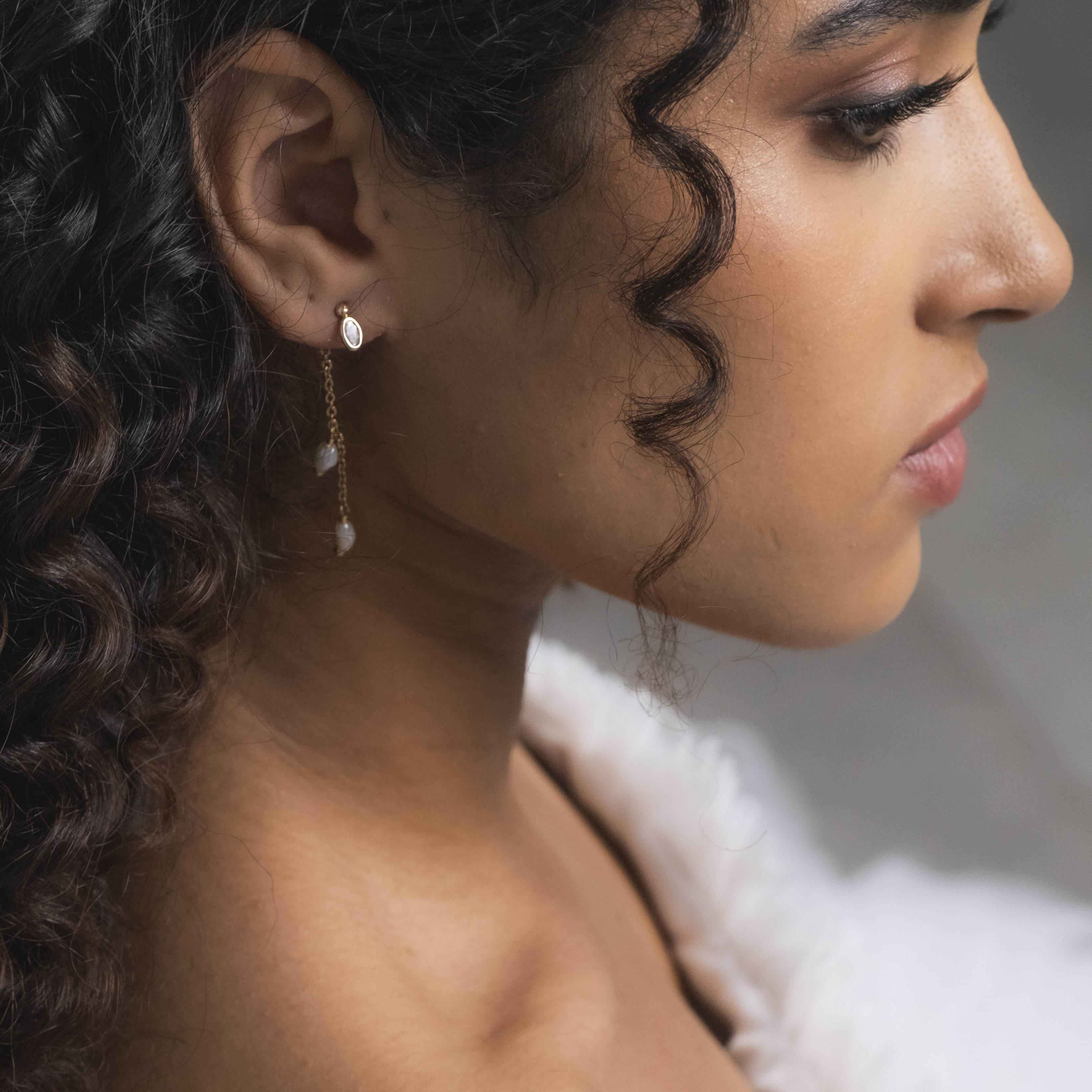 Brinco Liana irreverente com ponto de luz de zircônia na base, pingente fixo na tarraxa borboleta de corrente cadeado com duas mini pérolas arroz e mini placa redonda (Ps 139:14). Banhado em ouro 18k. Níquel free e verniz antialérgico. Pode ter variação no formato e cor da pérola.
