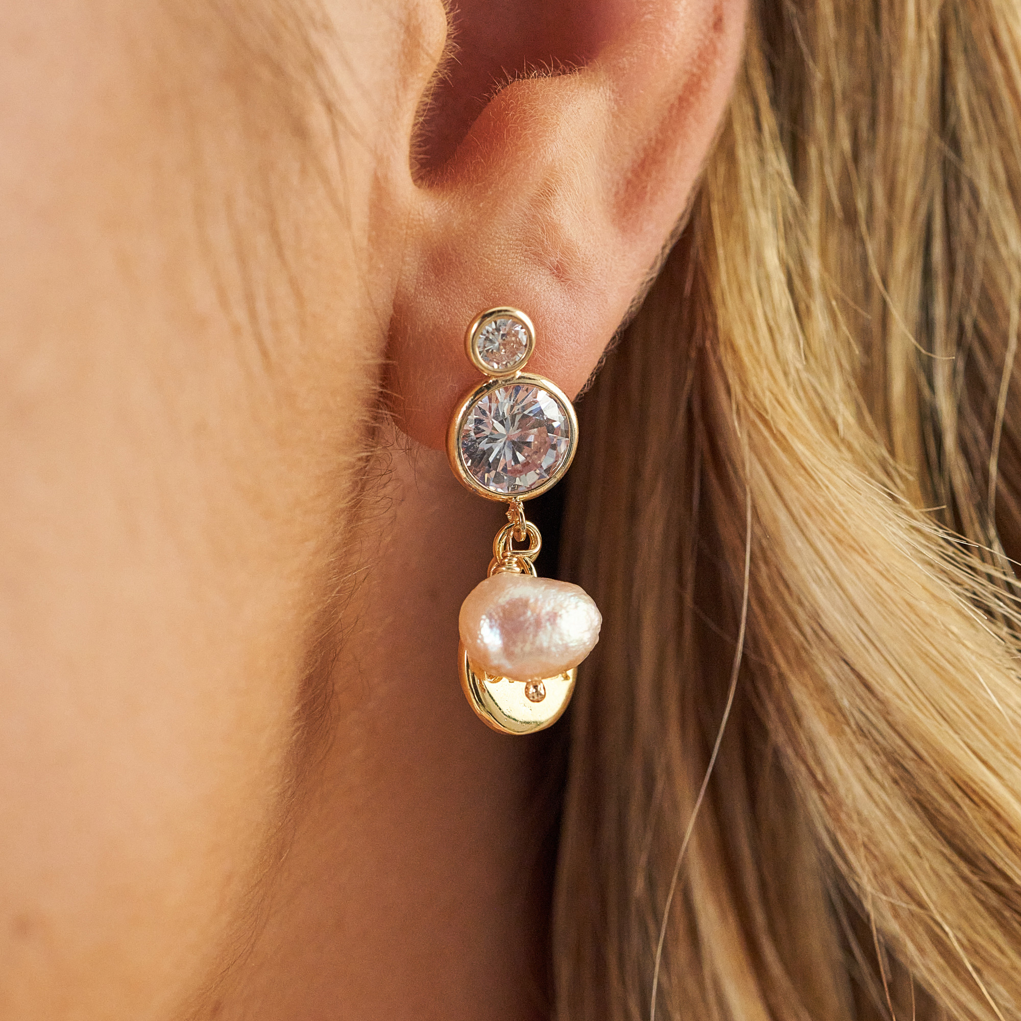 Brinco Mariah irregular brilhante base de ponto de luz duplo de zircônias com pérola barroca pão rosa no balanço. Mini placa redonda (Ps 139:14). Tarraxa borboleta. Banhado em ouro 18k. Níquel free com verniz antialérgico. Pode ter variação no formato e cor das pérolas.