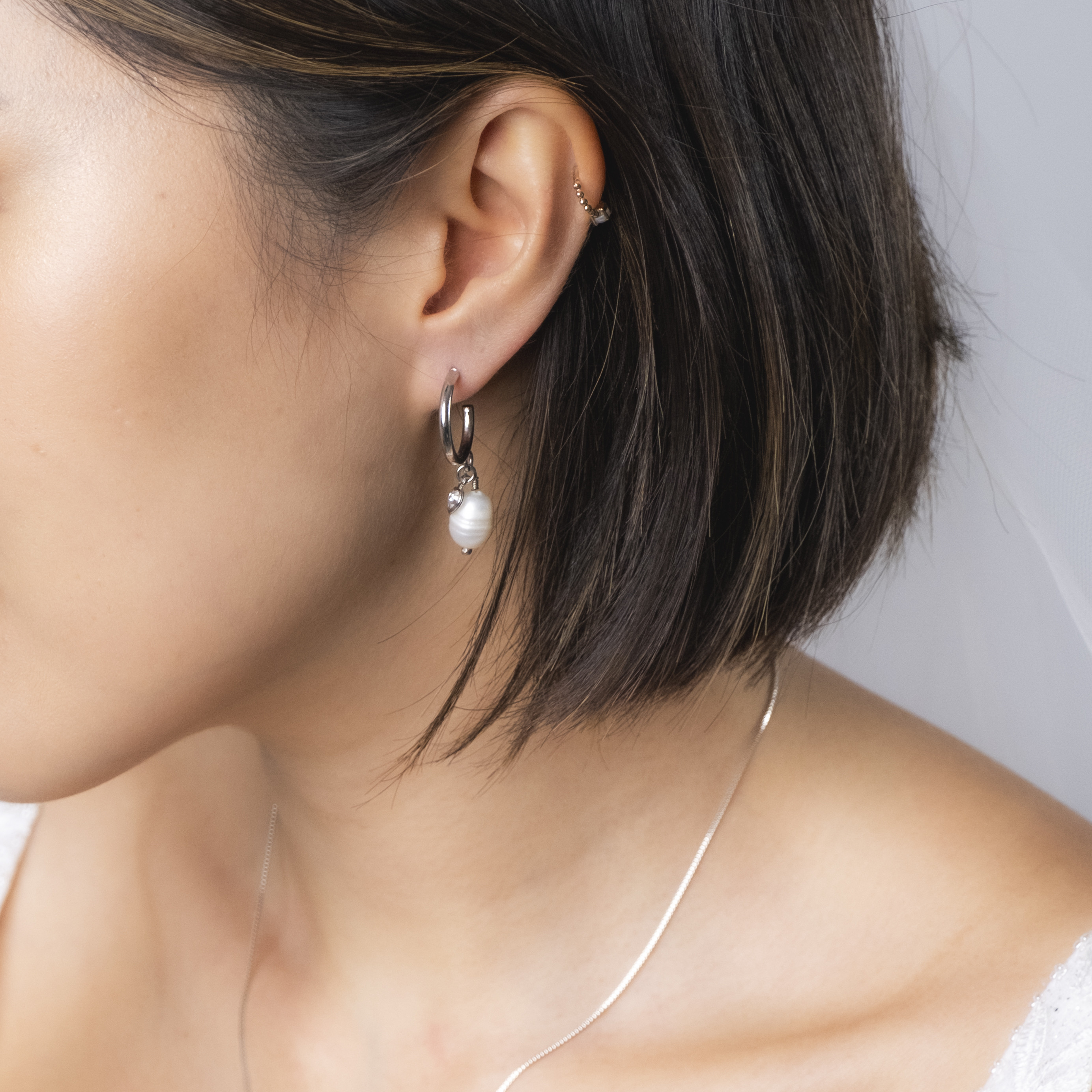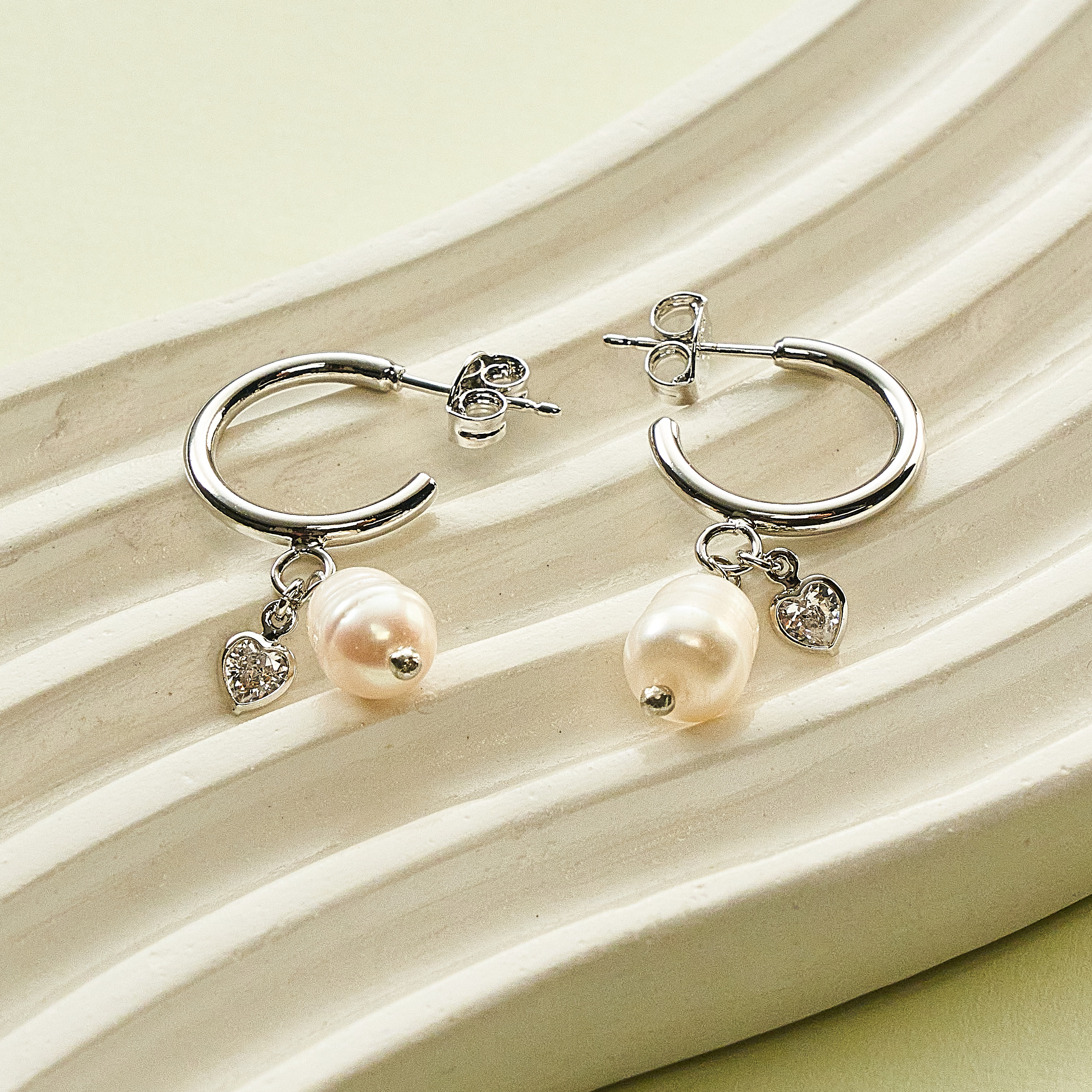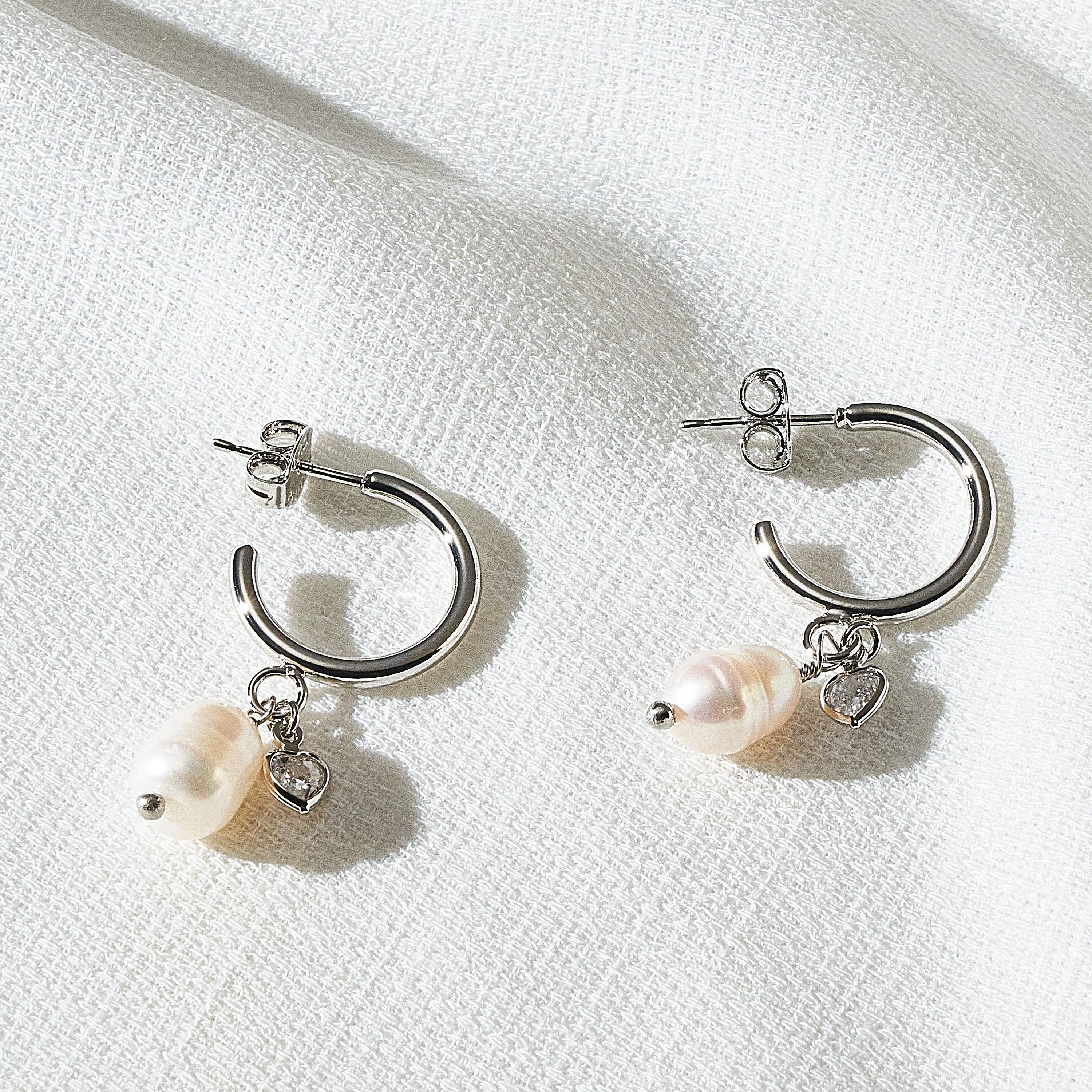 O brinco Mariane é um clássico de argola, por ser atemporal pode ser usado em qualquer ocasião sem medo de errar. O diferencial fica por conta do pingente de zircônia em formato de coração e do pingente de pérola barroca. Tarraxas personalizadas (Una - Ps 139:14). Banhado em ródio branco, com verniz antialérgico e níquel free. Pode ter variações no formato e cor da pérola.