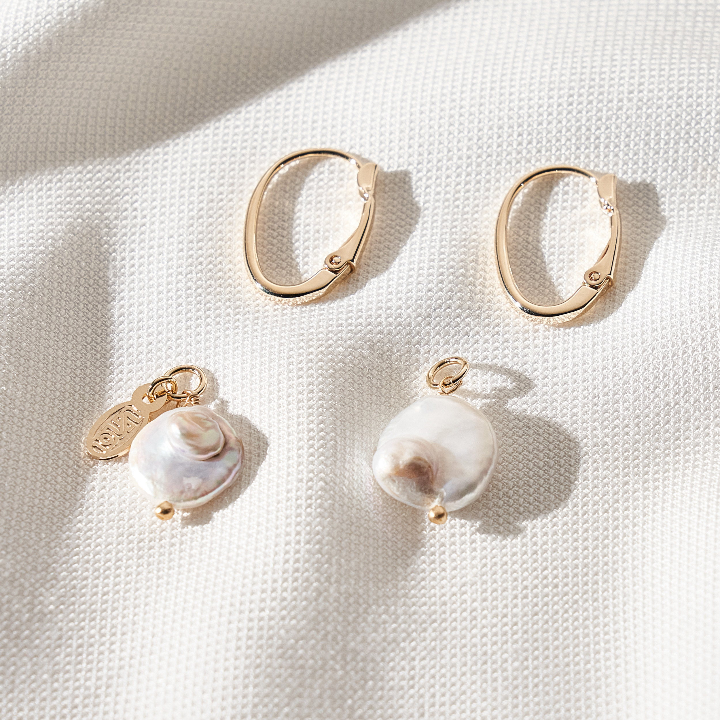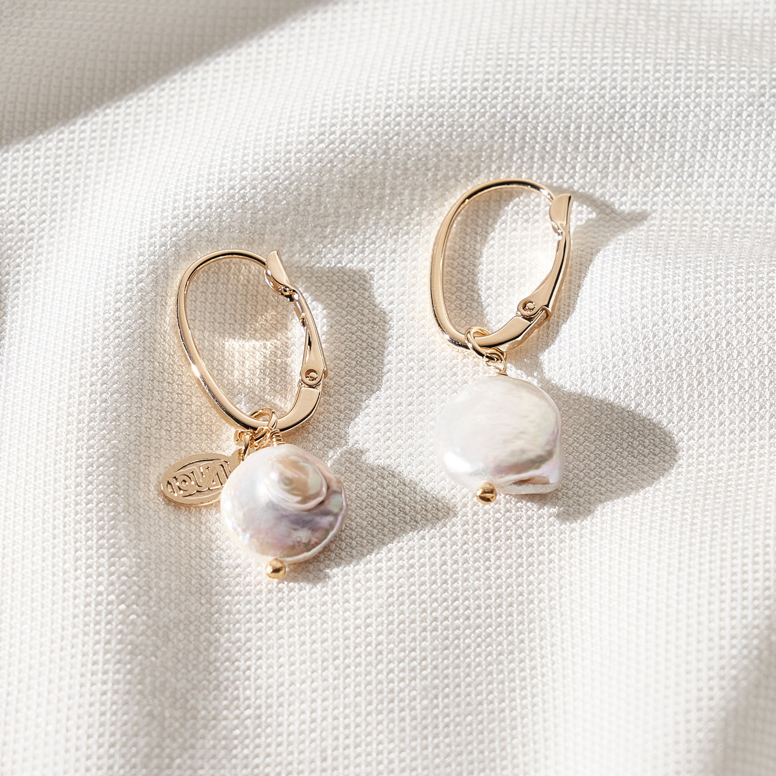 Brinco Matilda clássico com base de clique e pingentes removíveis de mini pérolas barrocas em formato de moeda. Detalhe de mini placa oval (Una - Ps 139:14). Banhado em ouro 18k, com verniz antialérgico e níquel free. Pode ter variações no formato e cor da pérola.