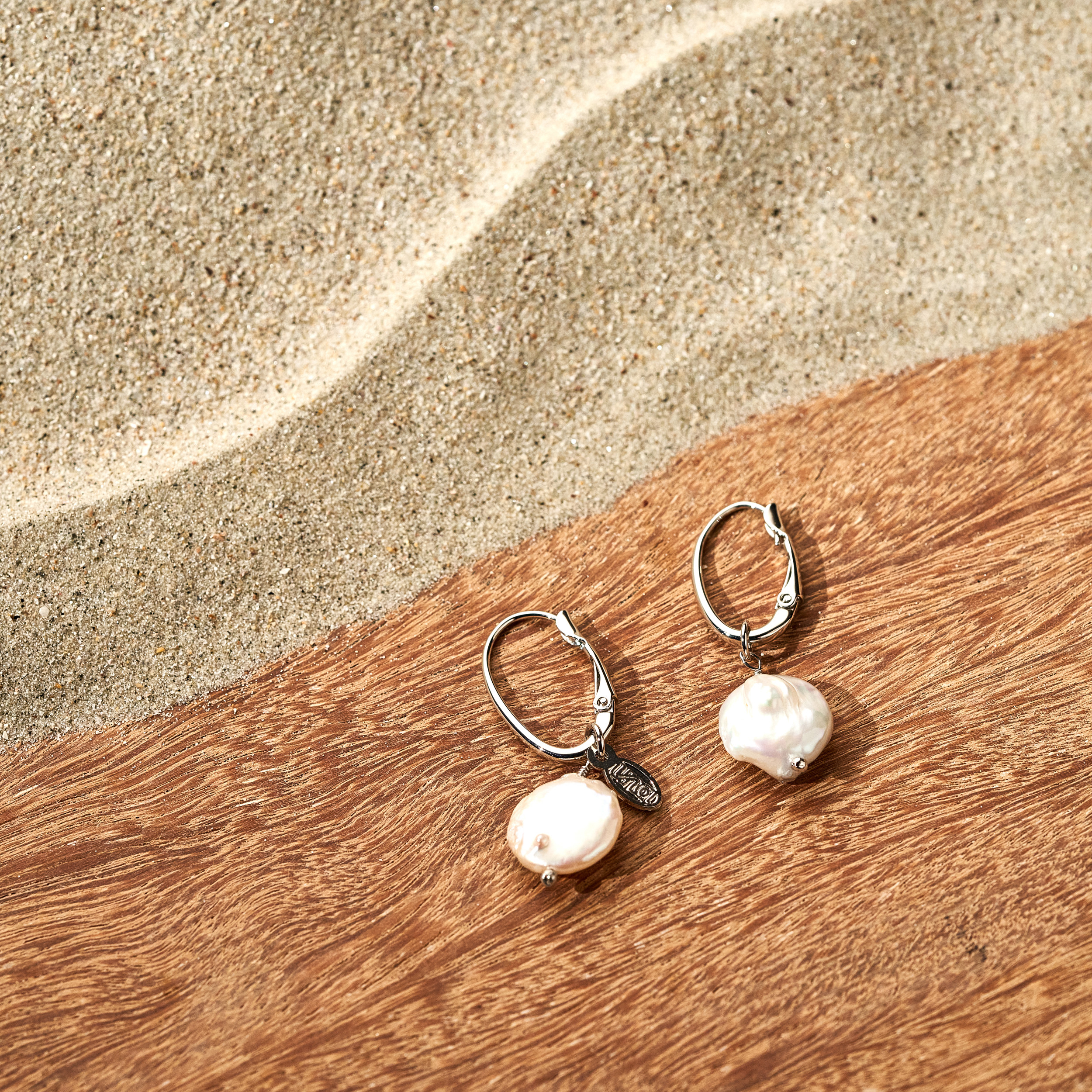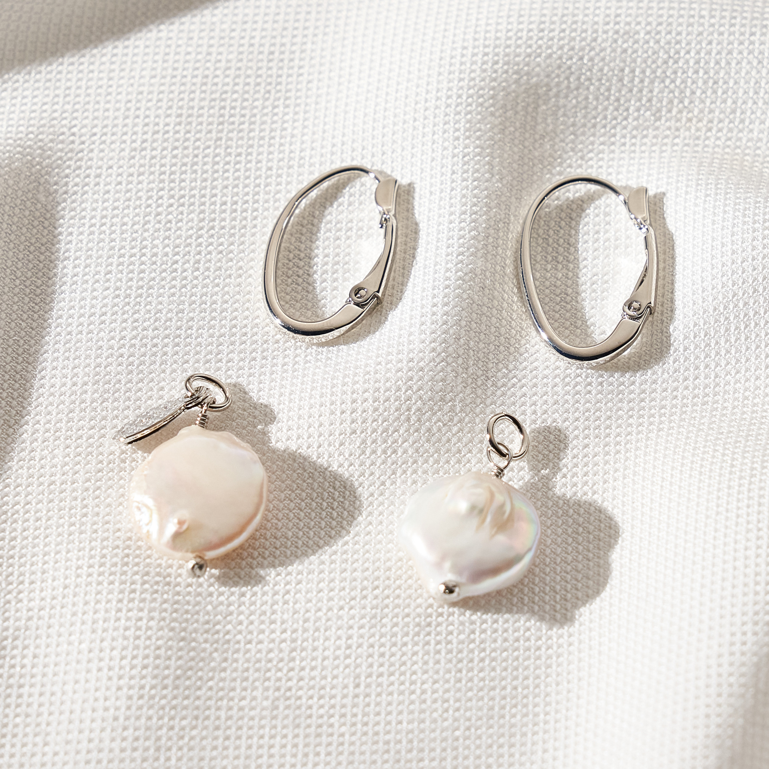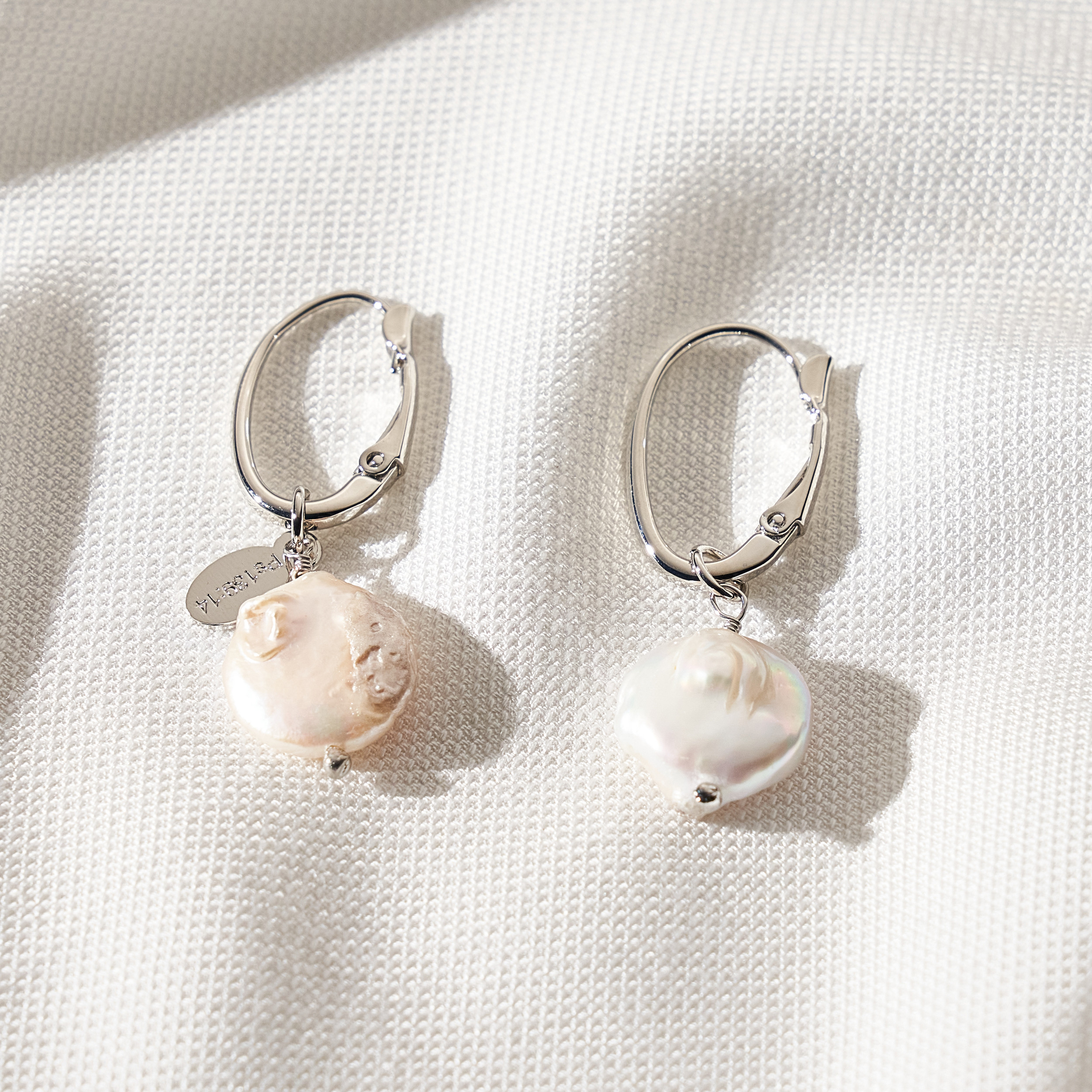 Brinco Matilda clássico com base de clique e pingentes removíveis de mini pérolas barrocas em formato de moeda. Detalhe de mini placa oval (Una - Ps 139:14). Banhado em ródio branco, com verniz antialérgico e níquel free. Pode ter variações no formato e cor da pérola.