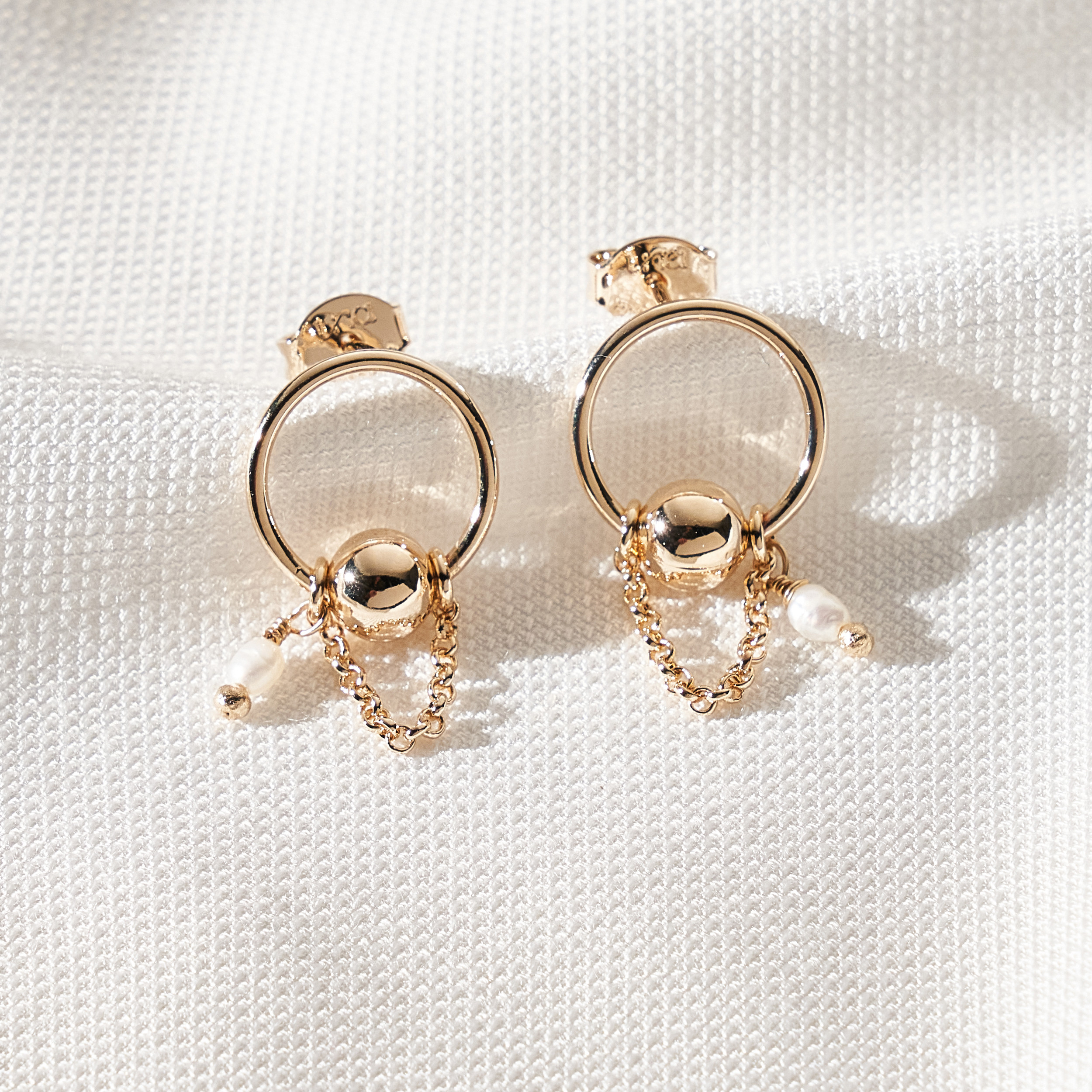 Brinco Naama moderno com base de círculo vazado e detalhe de esfera metálica com correntaria de elo português e mini pérola natural arroz de água doce. Tarraxa personalizada (Una - Ps 139:14). Banhado em ouro 18k, com verniz antialérgico e níquel free. Pode ter variações no formato e cor da pérola.