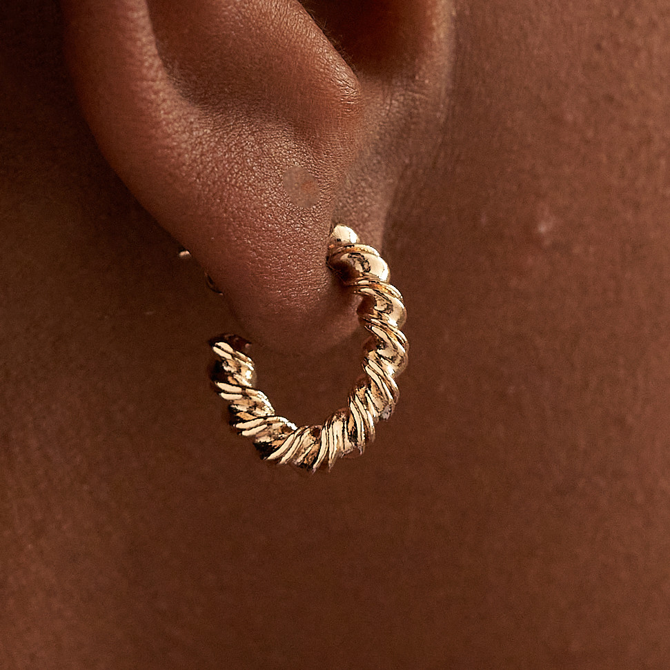Charmoso e sofisticado, são os adjetivos que descrevem perfeitamente o brinco Noemi. Sua base é uma argola oval torcida, ligeiramente achatada, ideal para compor looks casuais com elegância. Tarraxas personalizadas (Una - Ps 139:14). Banhado em ouro 18k, com verniz antialérgico e níquel free.