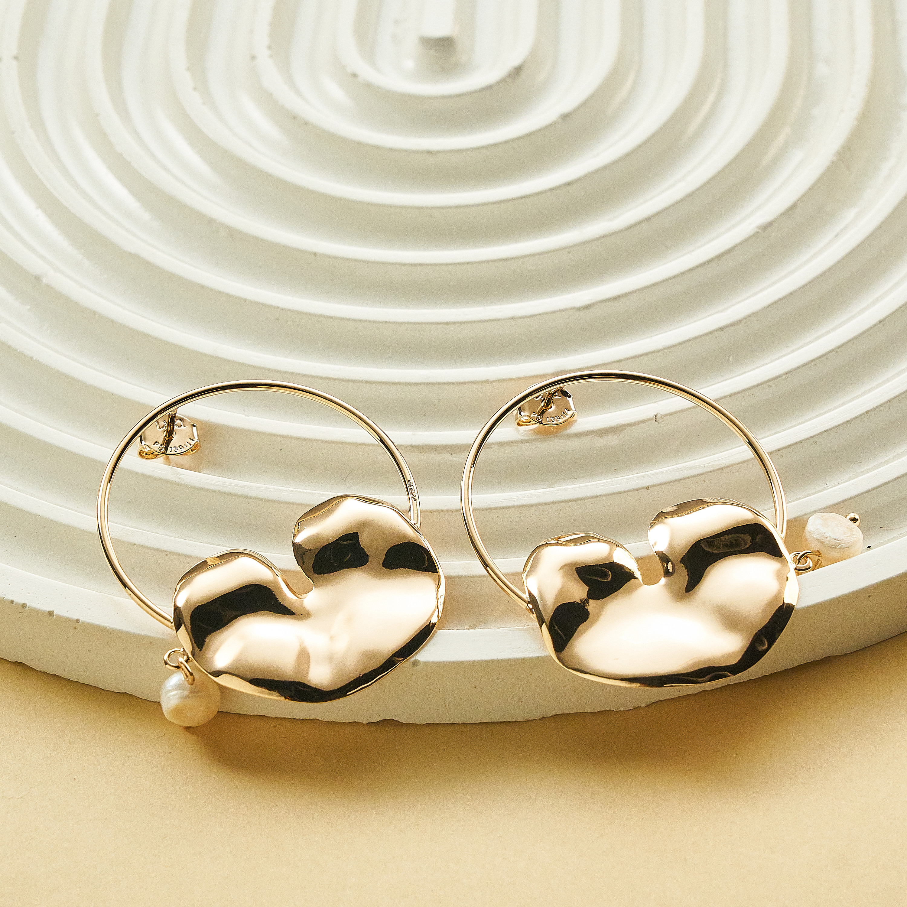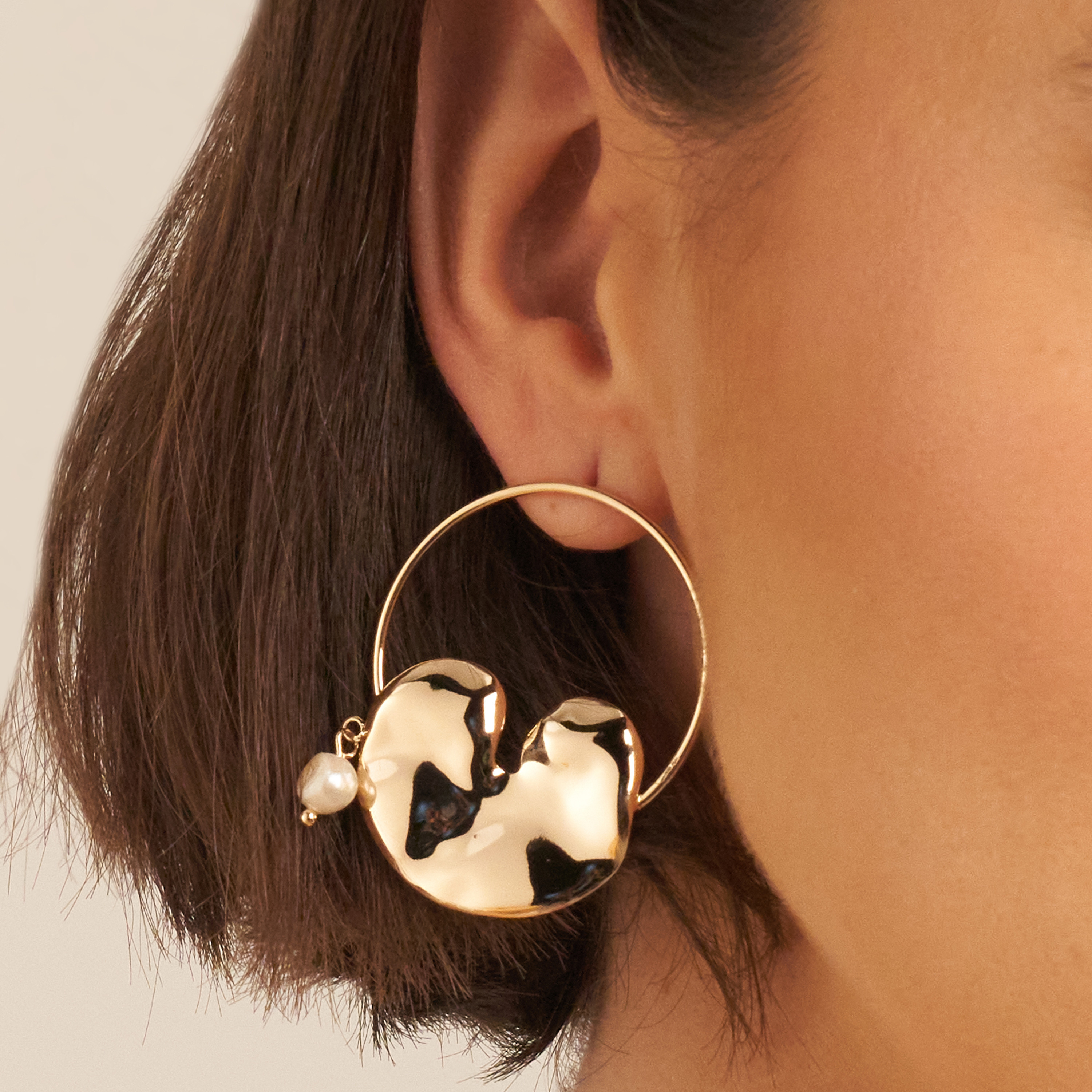 O brinco Quitéria é aquela peça para ser protagonista no look, a argola média possui pingente de forma orgânica que faz o charme da produção, e na lateral uma pérola barroca pão para dar o toque final. Tarraxas personalizadas (Una - Ps 139:14). Banhado em ouro 18k, com verniz antialérgico e níquel free. Pode ter variações no formato e cor da pérola.