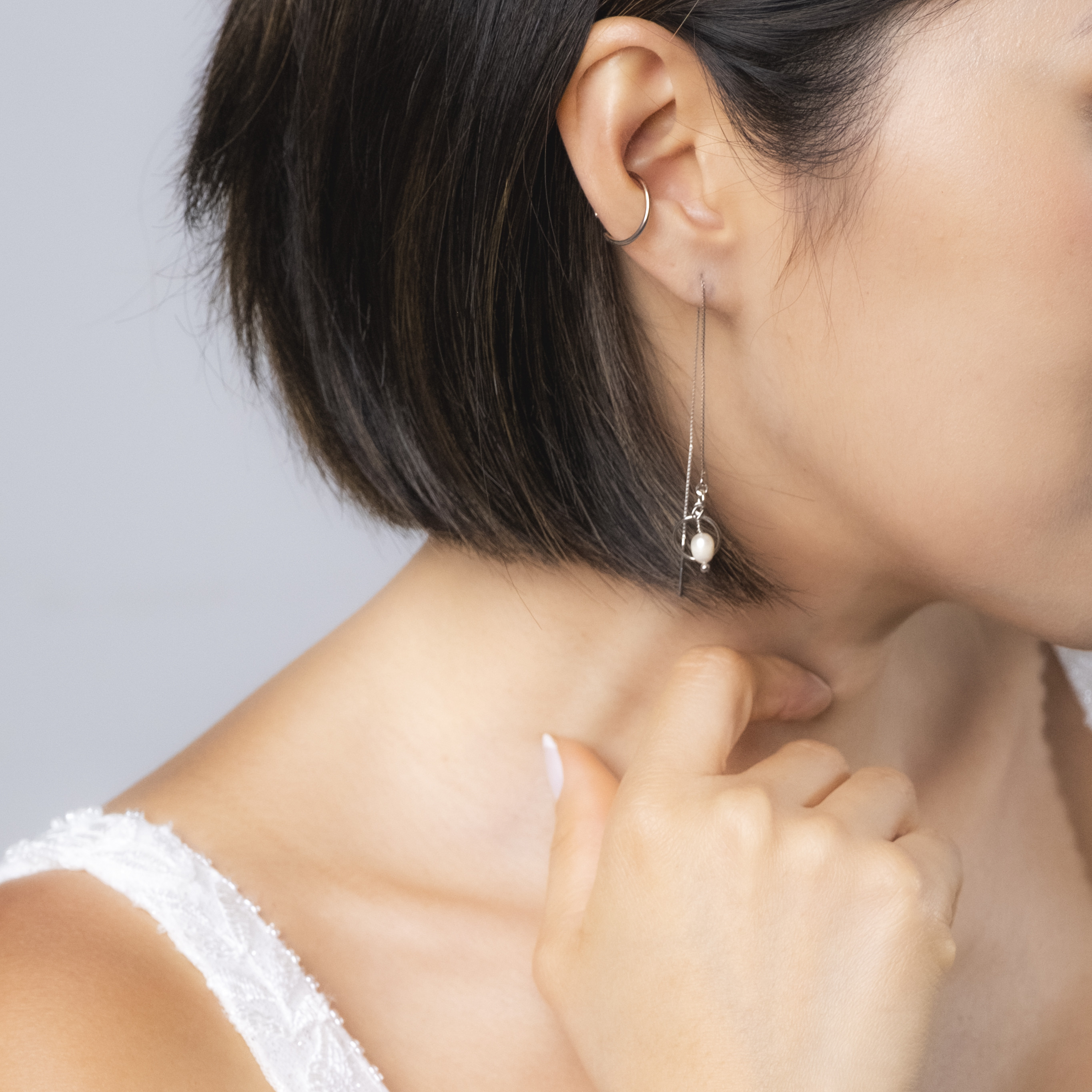 Brinco Stella irregular delicado de corrente veneziana com pino. Detalhe de argola com pérola arroz e mini placa redonda (Ps 139:14). Banhado em ródio branco, com verniz antialérgico e níquel free. Pode ter variações no formato e cor das pérolas.