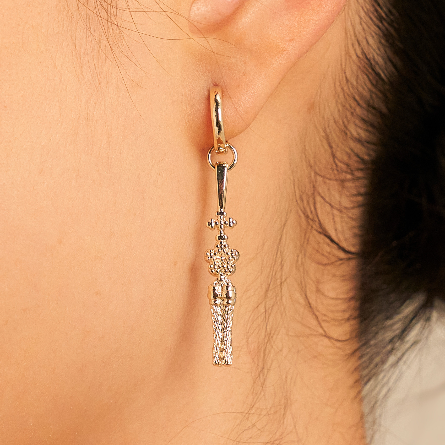 O brinco Sunmi possui o pingente de um item de decoração muito usado na cultura coreana, ele vem representado junto com uma delicada argola que deixa a peça perfeita para ser protagonista na produção. Peça banhada em ouro 18k, com verniz antialérgico e níquel free. Possui fecho clique e detalhe da nossa concha Una.