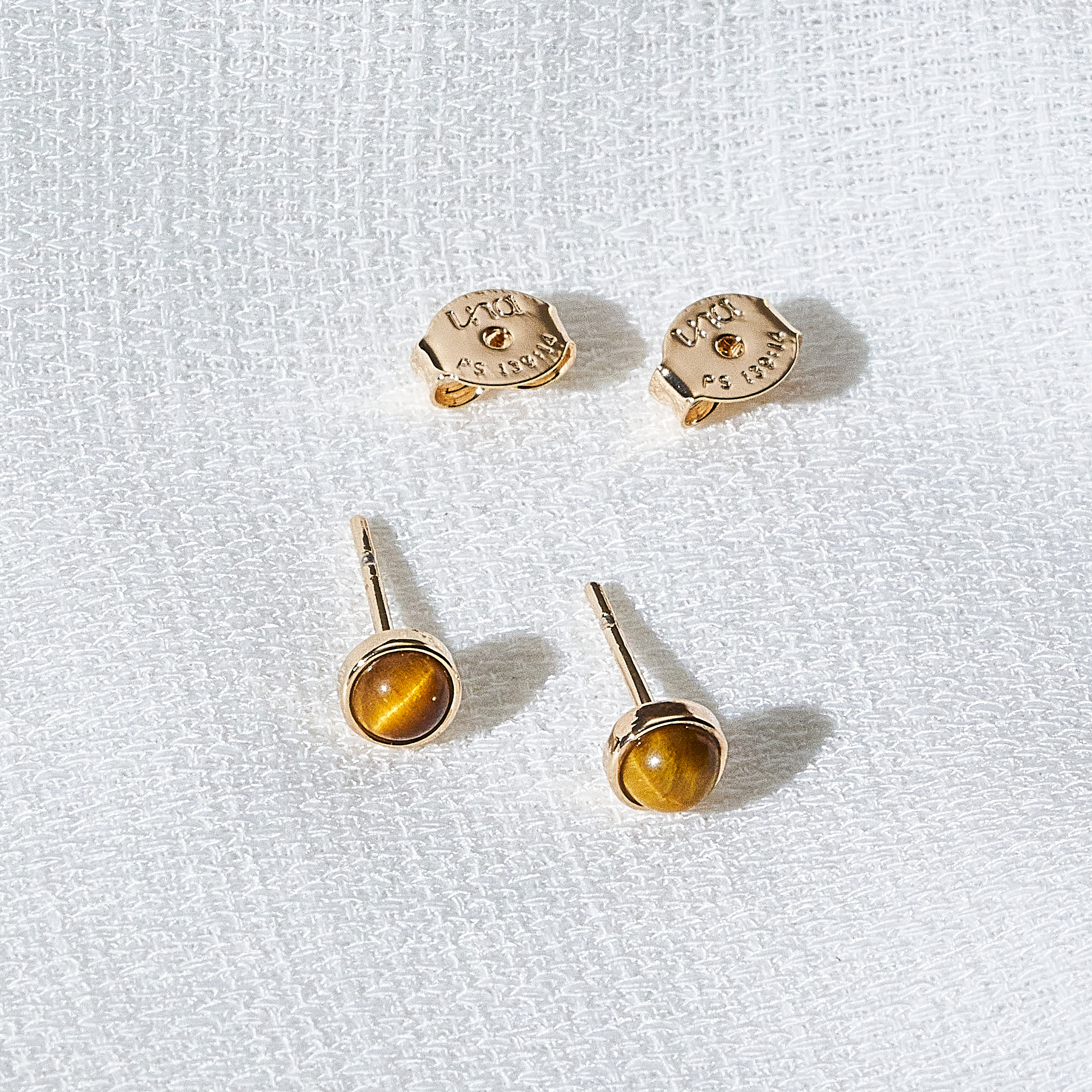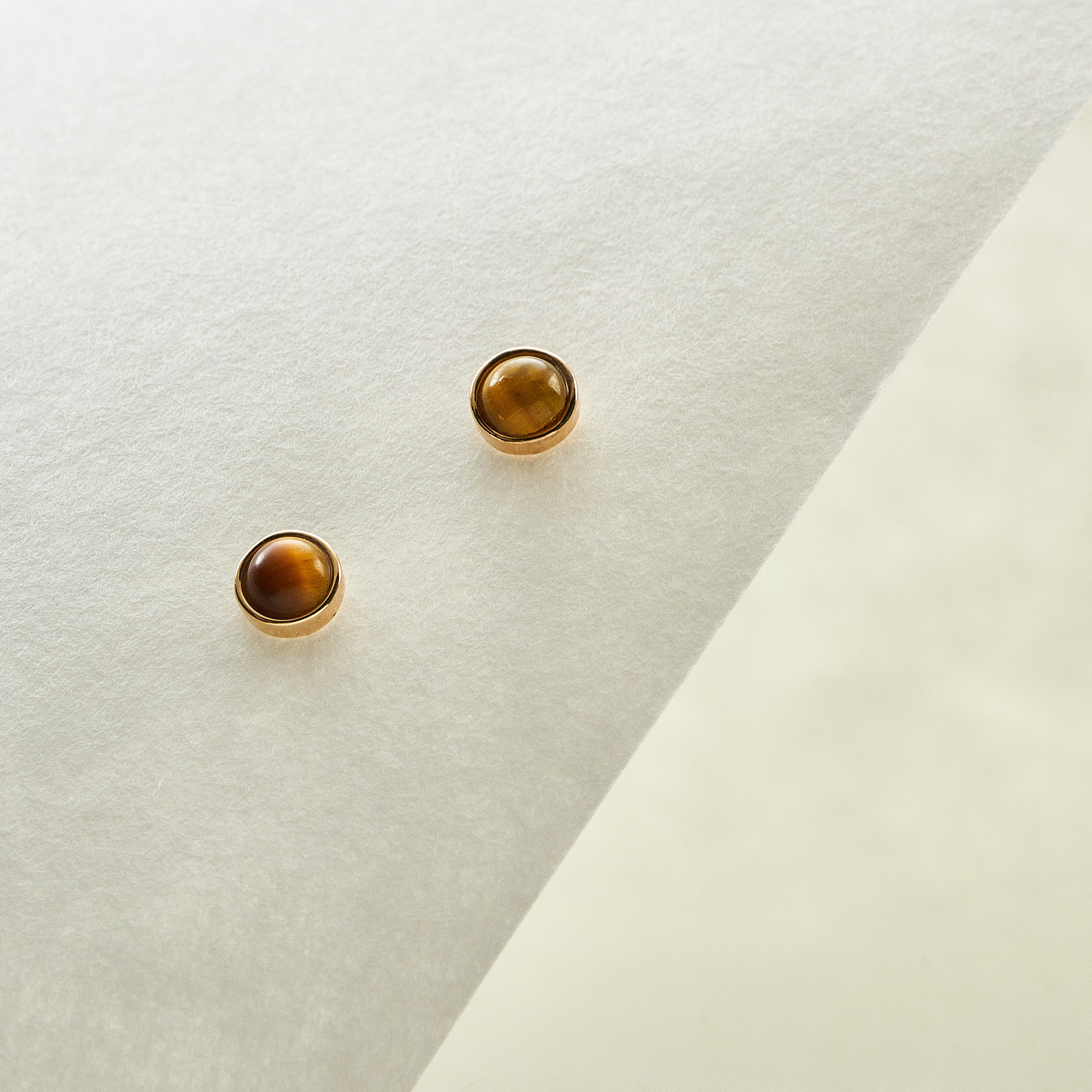 O diferencial do brinco Tâmara é a pedra de olho de tigre, que dá um toque de sofisticação para a peça, use sozinho na orelha ou então combine com outras peças para um diferencial. Tarraxas personalizadas (Una - Ps 139:14). Banhado em ouro 18k, com verniz antialérgico e níquel free.