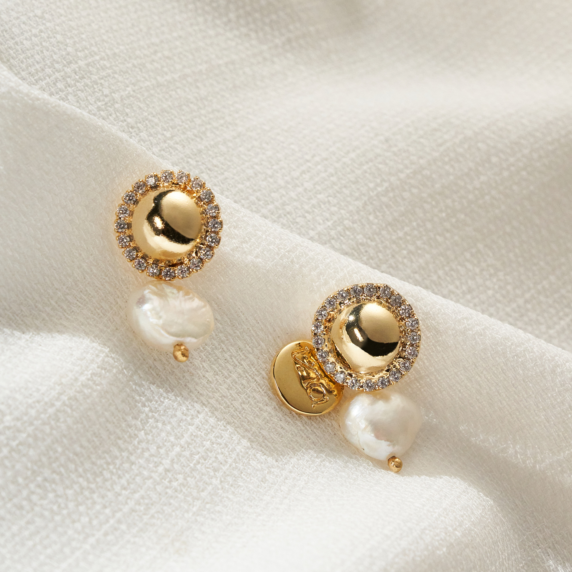 Brinco Teresa clássico com base redonda cravejada de zircônias e pingente de pérola barroca irregular. Mini placa redonda (Ps 139:14). Tarraxa borboleta. Banhado em ouro 18k, com verniz antialérgico e níquel free.Pode ter variação no formato e cor das pérolas.