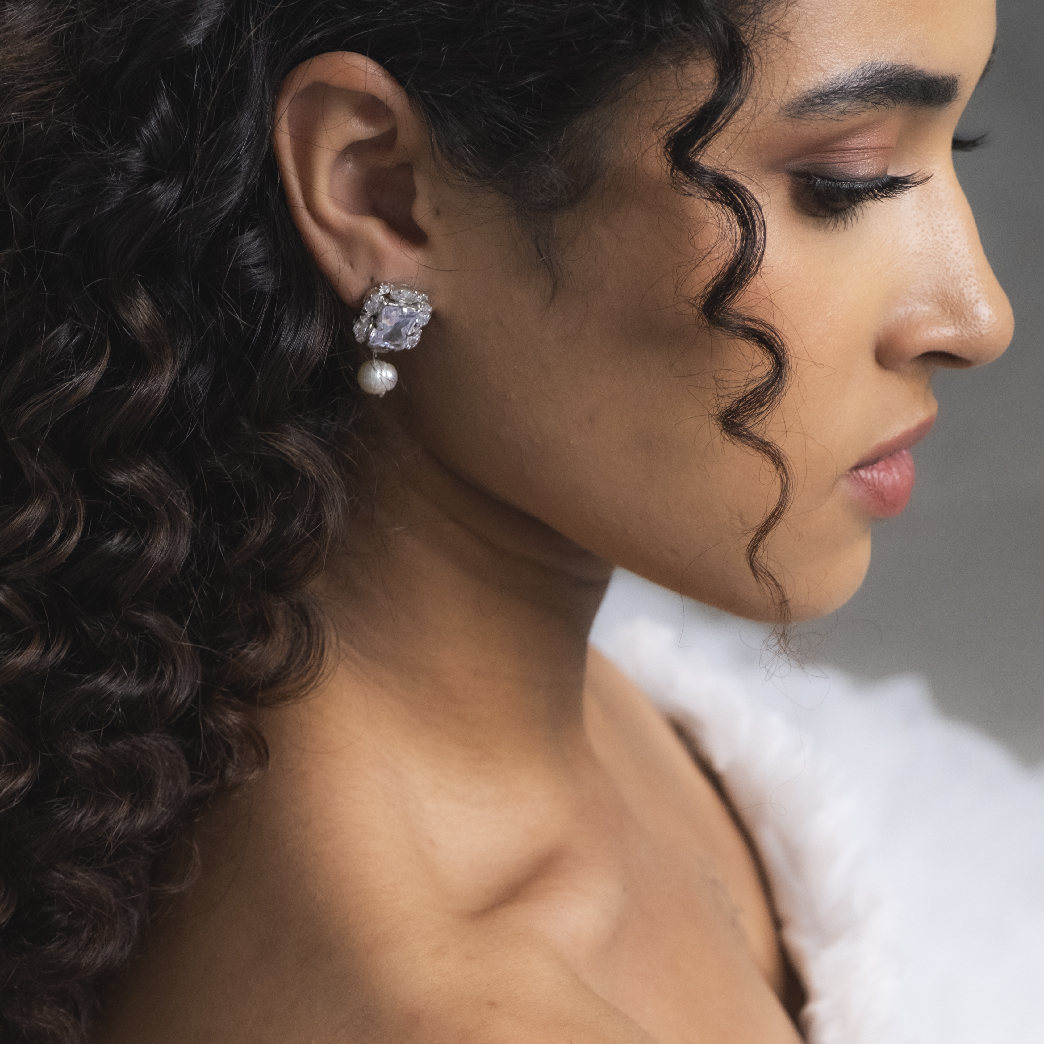 Brinco Venice charmoso com base central de zircônia lapidada em formato retangular, e ao redor zircônias em formato navete complementam a peça. Detalhe pérola barroca pão. Tarraxa personalizada (Una - Ps 139:14). Banhado em ródio branco, com verniz antialérgico e níquel free.