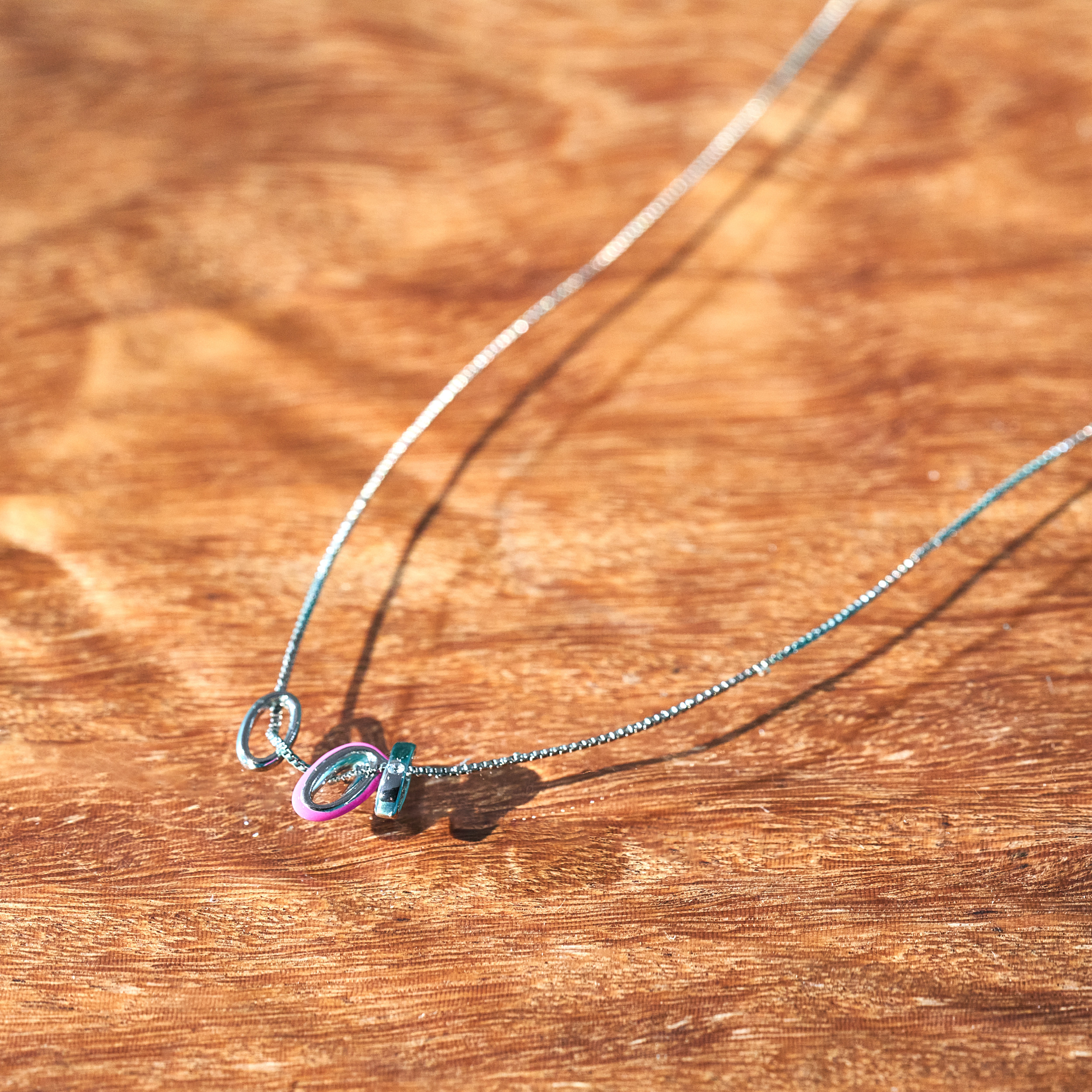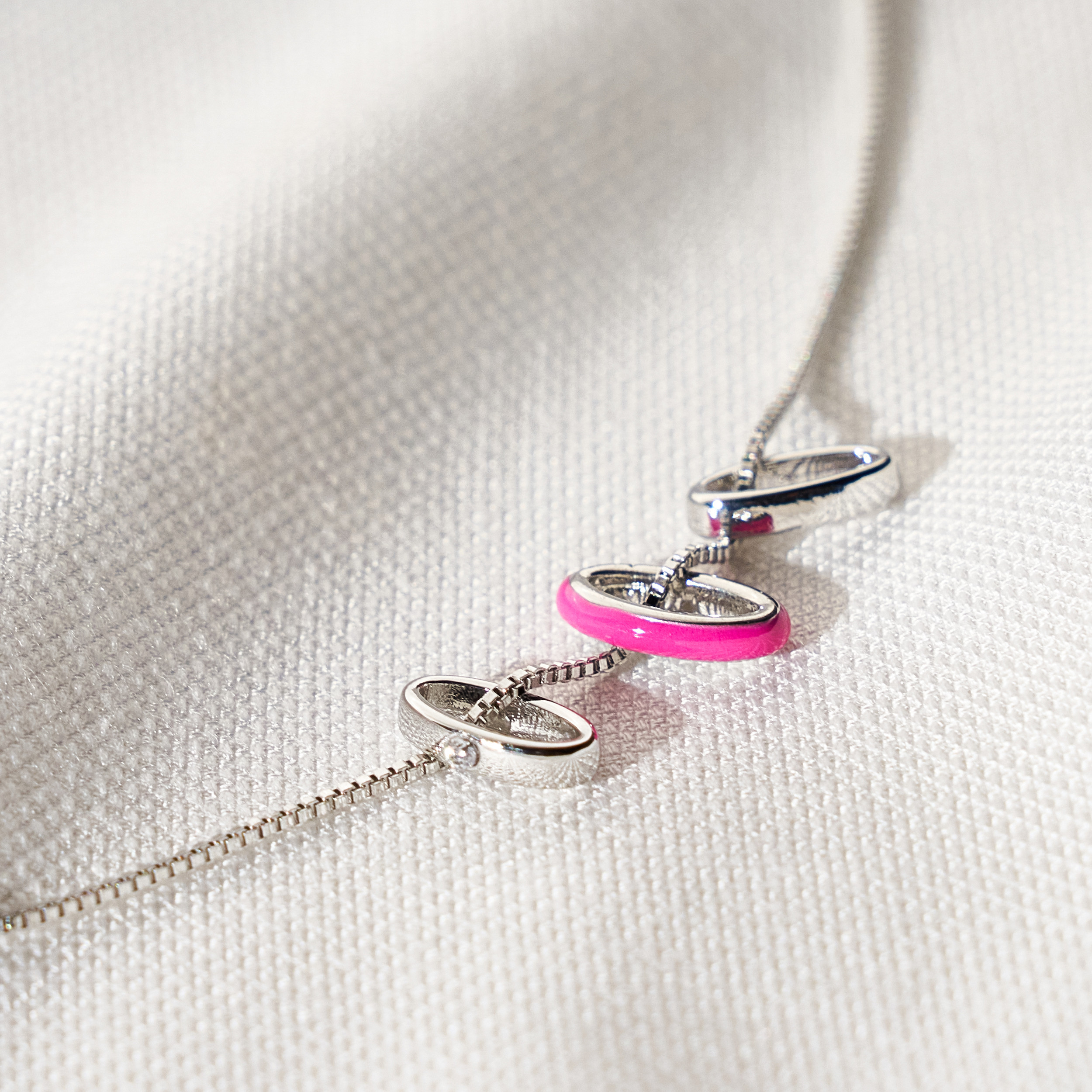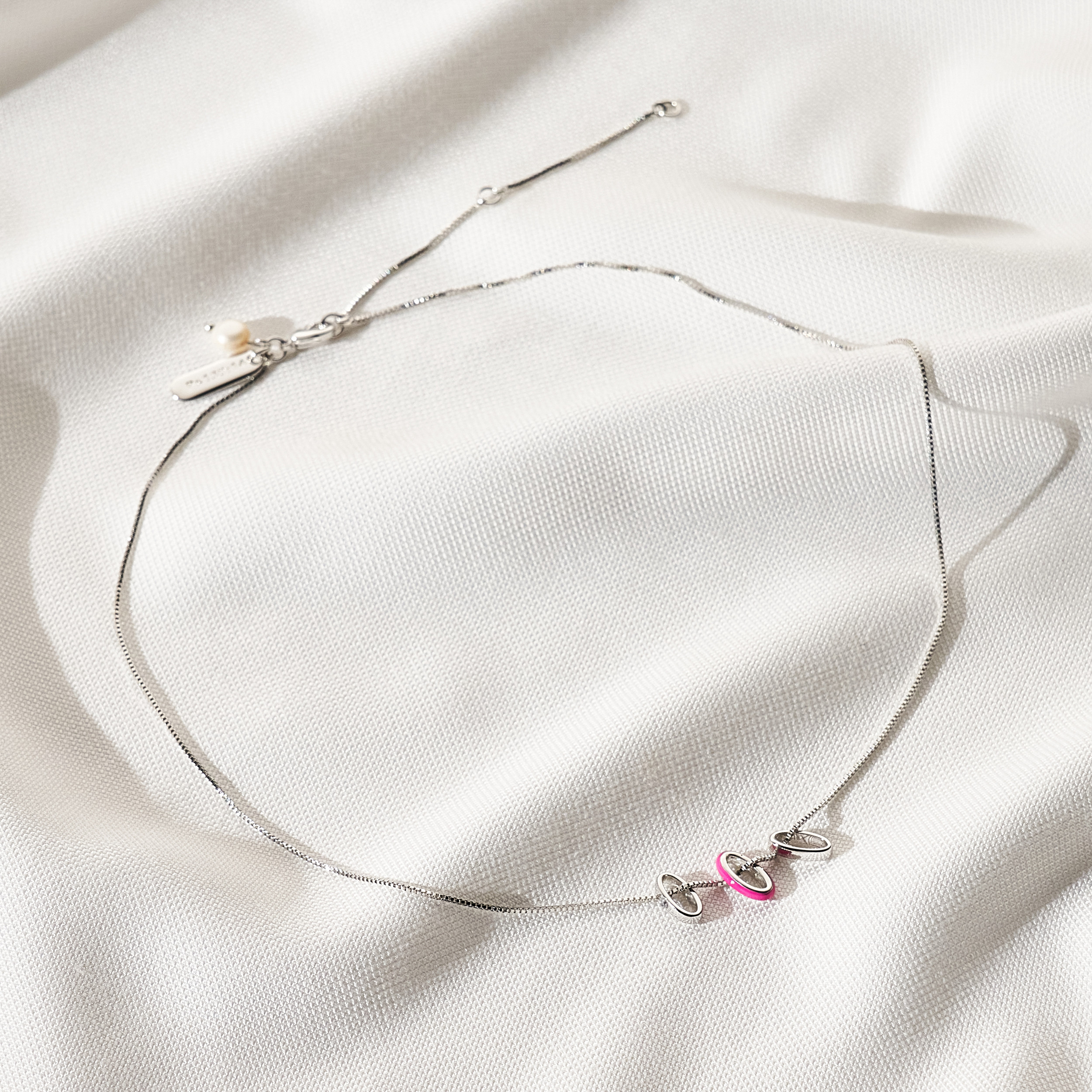 Colar Abby maravilhoso de corrente veneziana com 3 pingentes de elos. Detalhe de ponto de luz de zircônia e resina pink. Mini placa Una e Ps 139:14. Fecho lagosta com detalhe de pérola natural de água doce com extensor em 3 medidas. Banhado em ródio branco, com verniz antialérgico e níquel free. Pode ter variações no formato e cor da pérola.