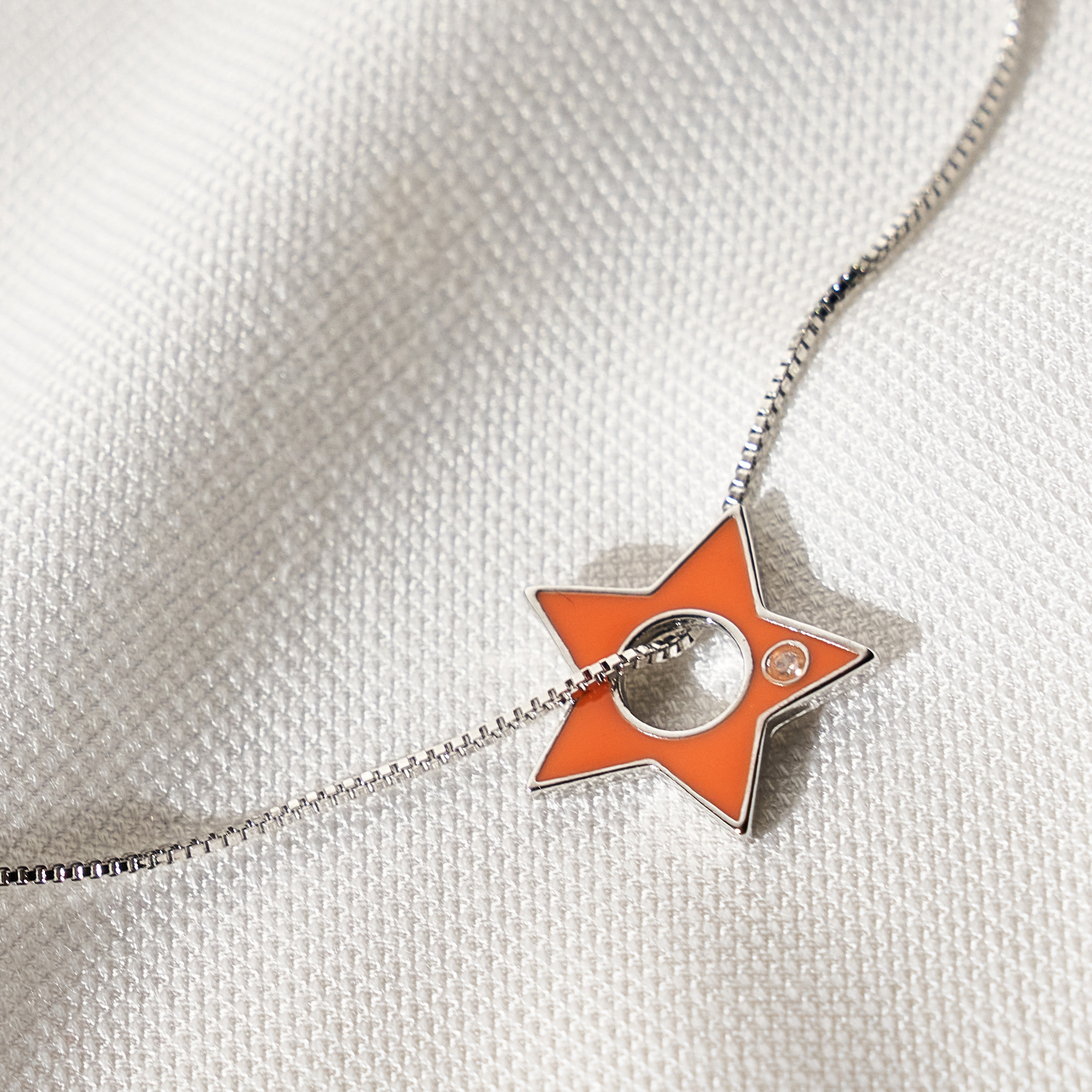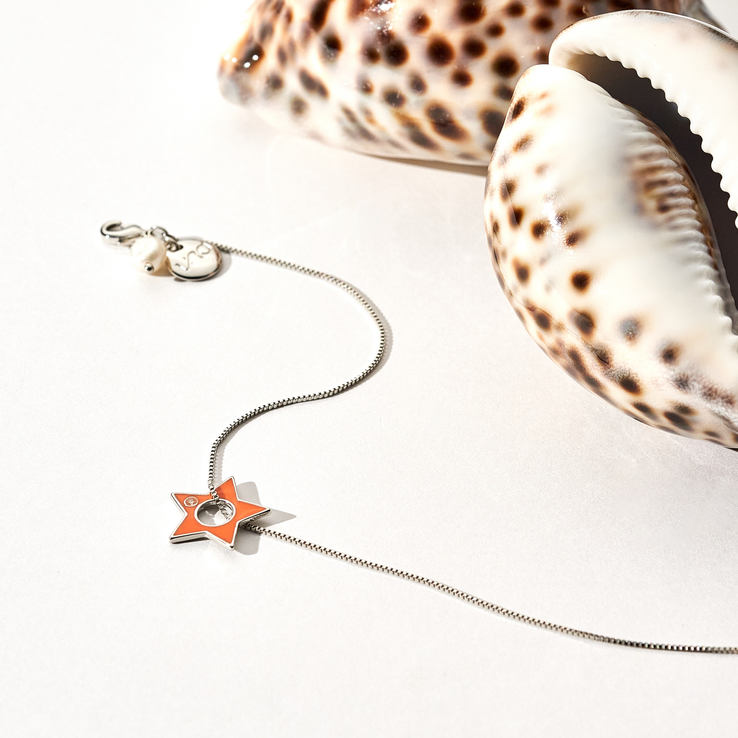 Colar Berta moderno de corrente veneziana com pingente de estrela com resina laranja com detalhe de ponto de luz de zircônia. Mini placa Una e Ps 139:14. Fecho lagosta com detalhe de pérola natural de água doce com extensor em 3 medidas. Banhado em ródio branco, com verniz antialérgico e níquel free. Pode ter variações no formato e cor da pérola.