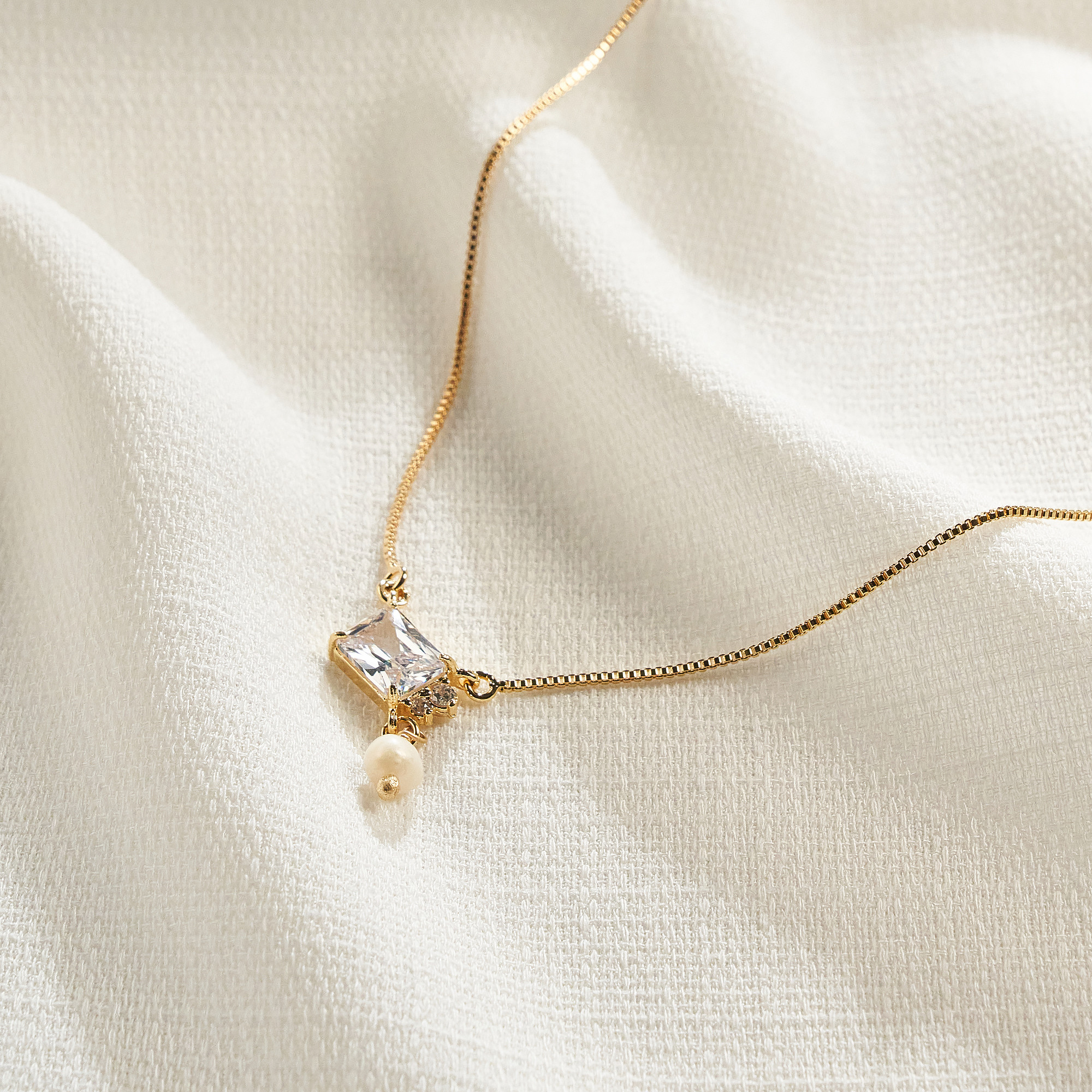 Colar Cássia marcante de corrente veneziana com pingente de zircônias central com detalhe de pérola arroz no balanço. Extensor em 3 medidas com mini placa oval (Ps 139:14). Banhado em ouro 18k, com verniz antialérgico e níquel free. Podem ter variações no formato e cor das pérolas.