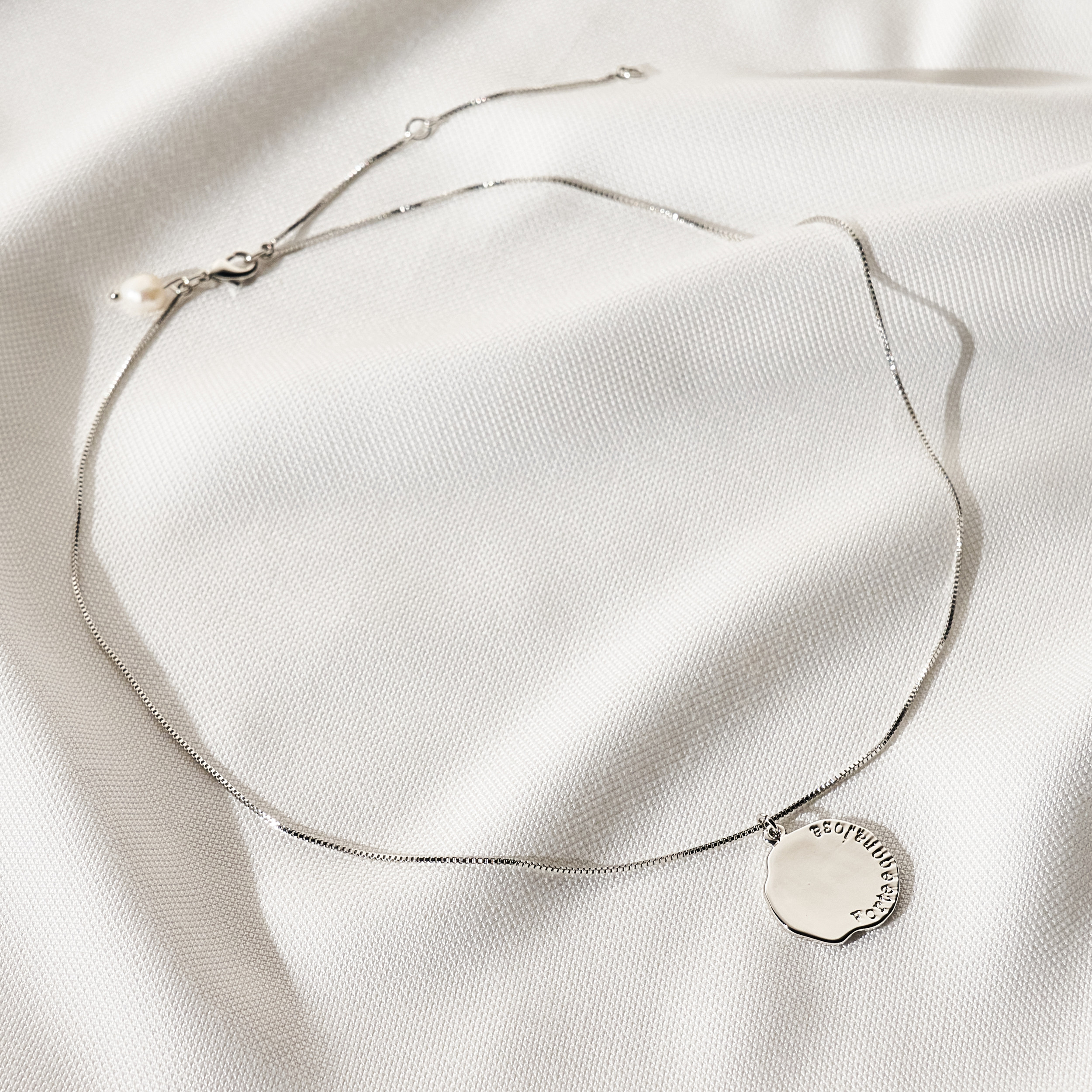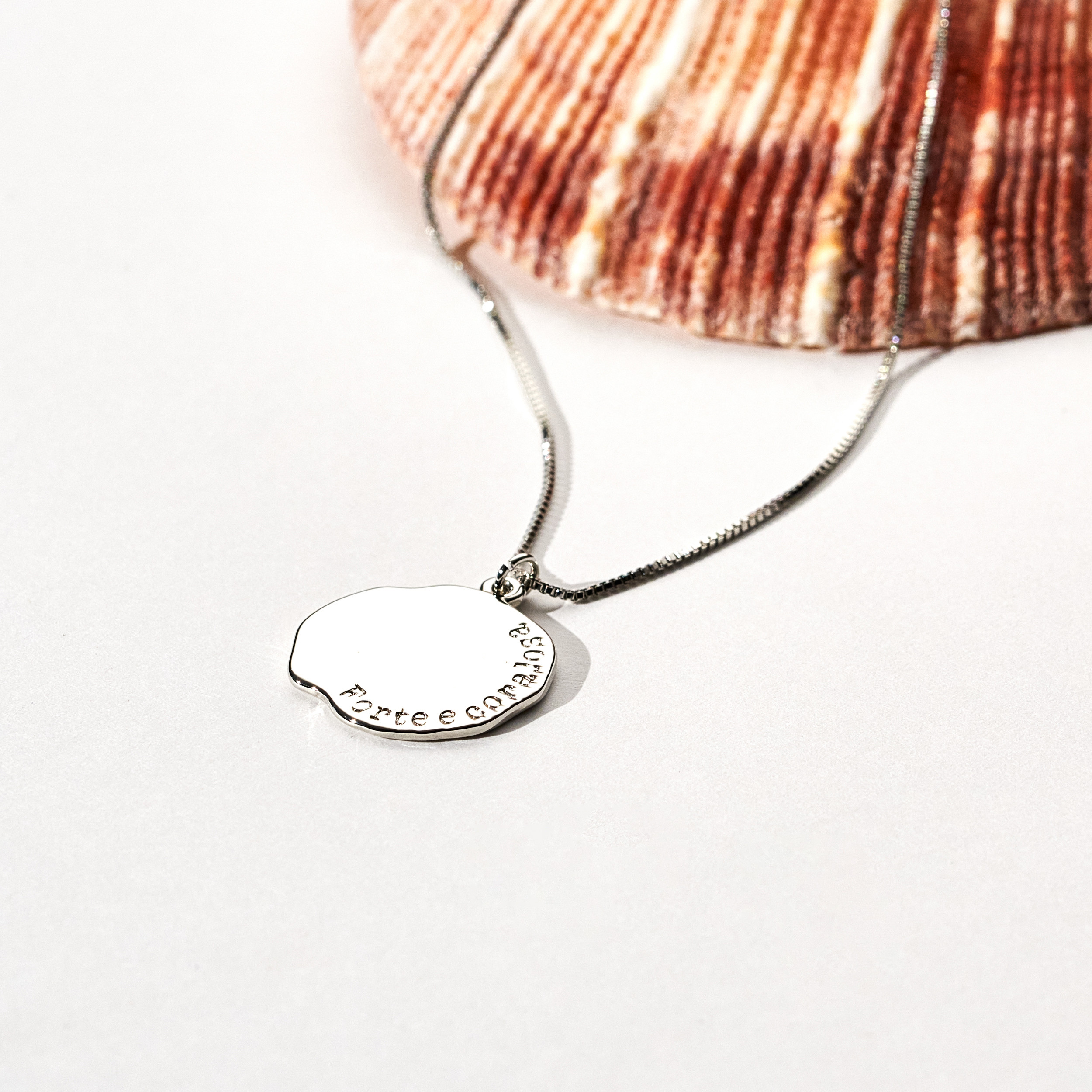 Colar Caterina lindo de corrente veneziana com pingente de forma orgânica escrito: Forte e corajosa. Detalhe do verso da placa Una e Ps 139:14. Fecho lagosta com detalhe de pérola natural de água doce com extensor em 3 medidas. Banhado em ródio branco, com verniz antialérgico e níquel free. Pode ter variações no formato e cor da pérola.