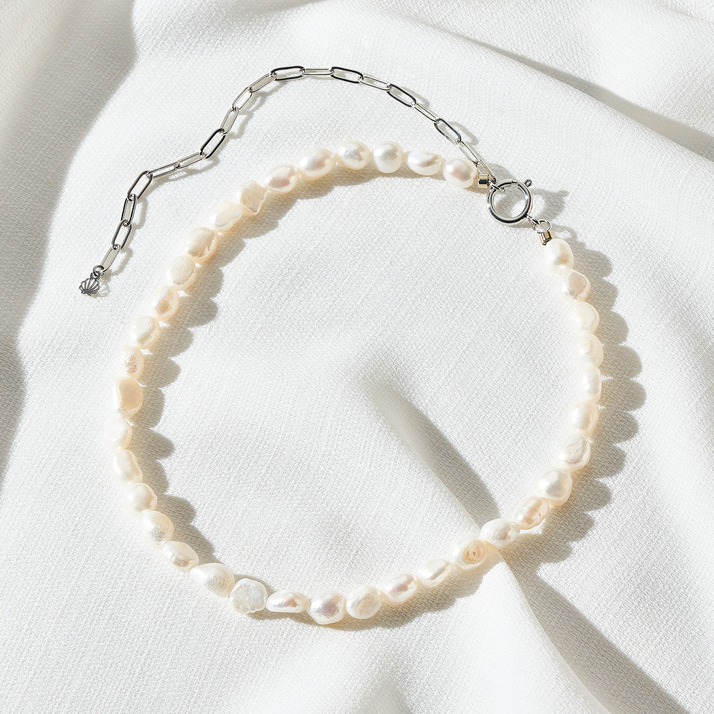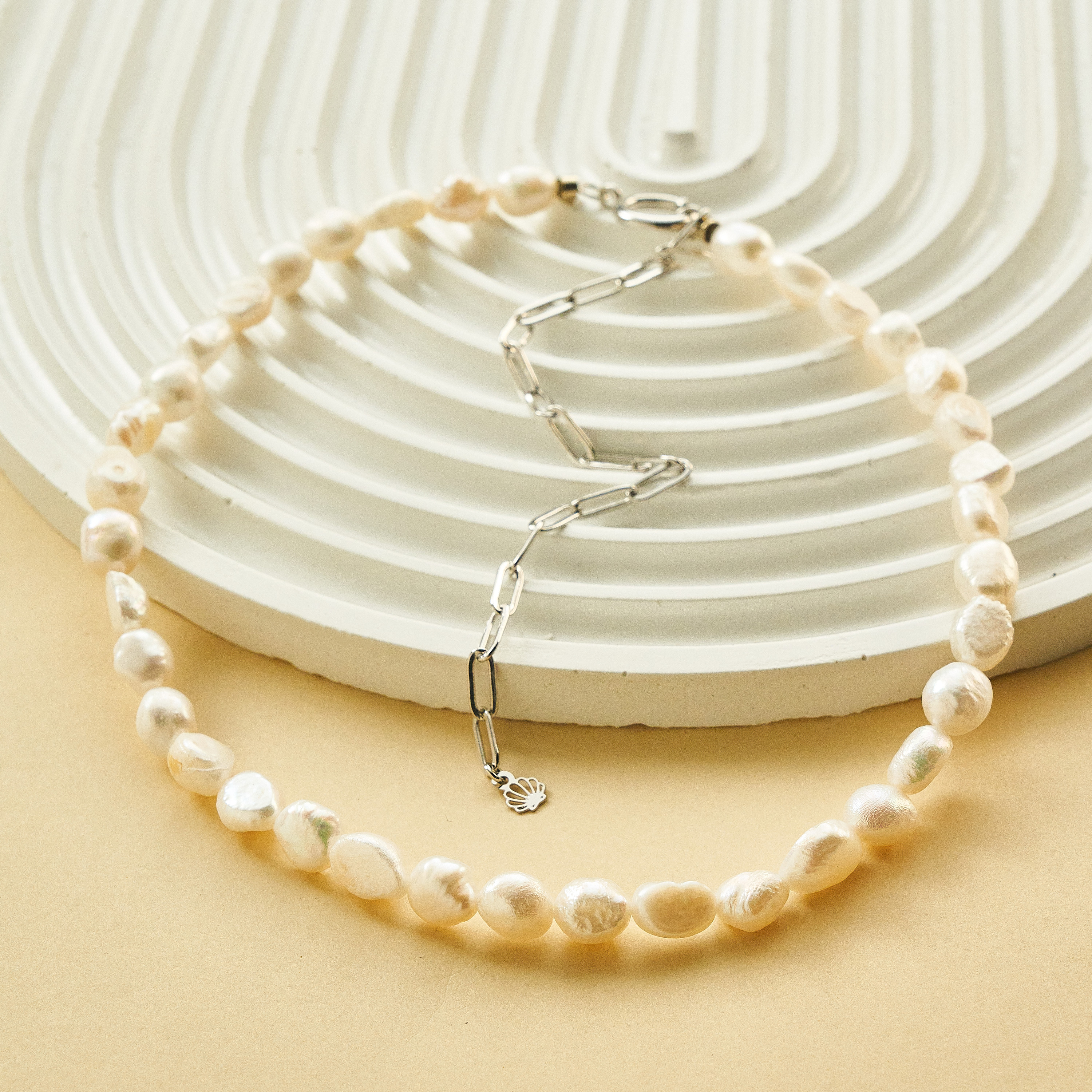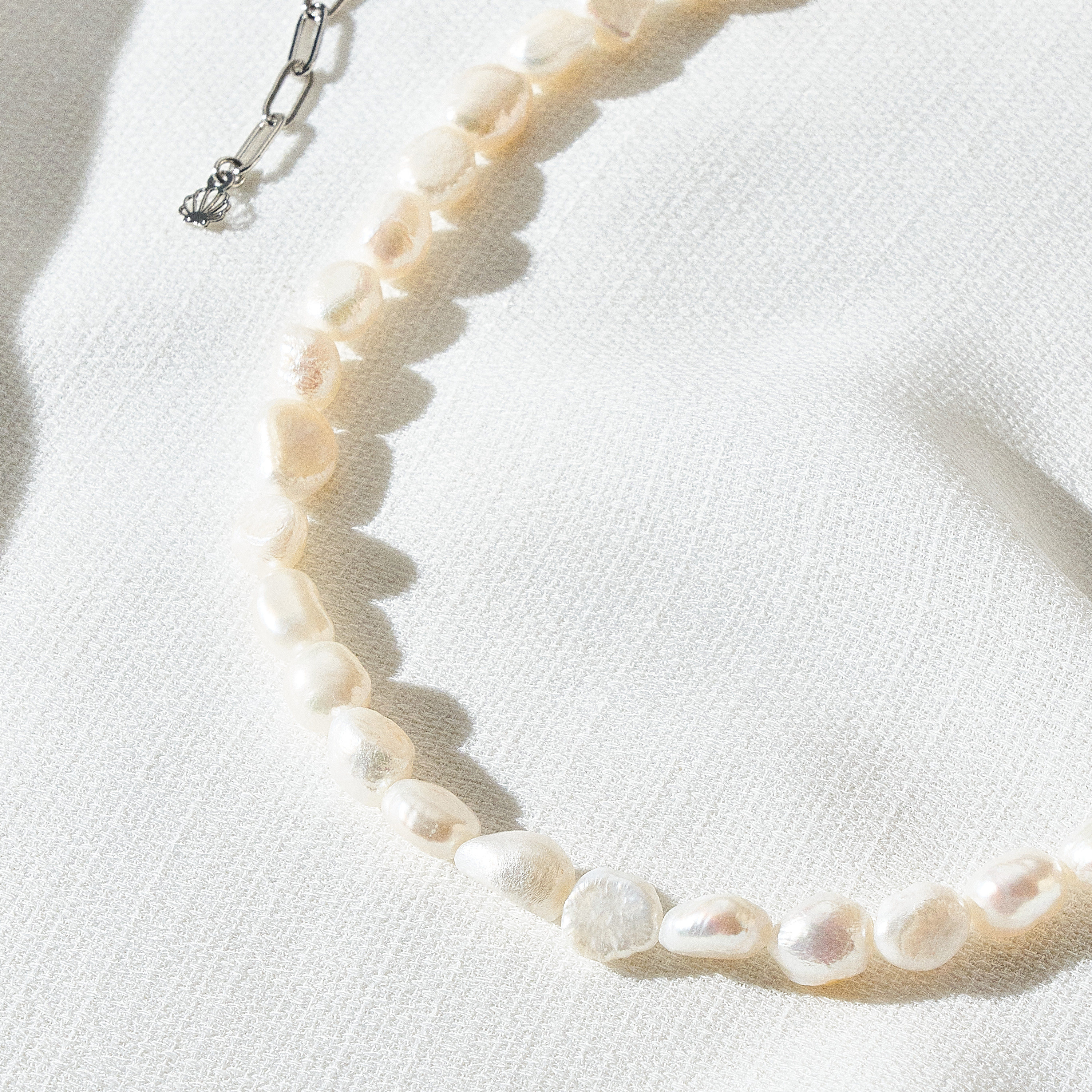 Colar Kaia atemporal feito com pérolas barrocas pão, traz um toque clássico no look sem tirar a delicadeza. Possui extensor de corrente cartier com a nossa concha Una e fecho boia. Peça banhada em ródio branco, com verniz antialérgico e níquel free. As pérolas podem ter variações em seus formatos e tamanhos.