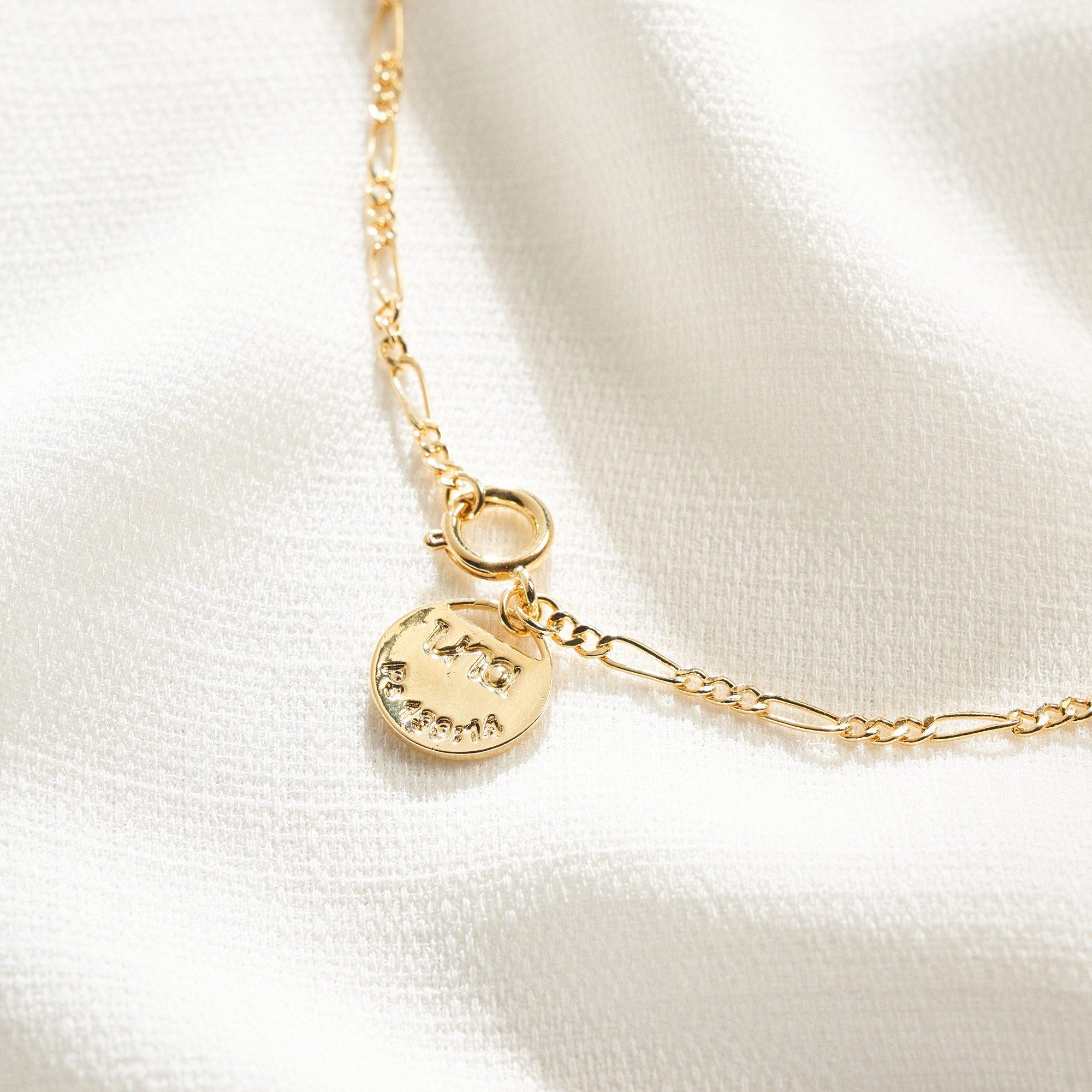 Colar Kelly suave de corrente fígaro com pingente fixo de placa redonda vazada no topo e gravação no verso (Ps 139:4) . Detalhe de pérola barroca na metade da corrente. Fecho frontal tipo bóia médio. Banhado em ouro 18k, com verniz antialérgico e níquel free. Pode ter variação no formato e cor da pérola.