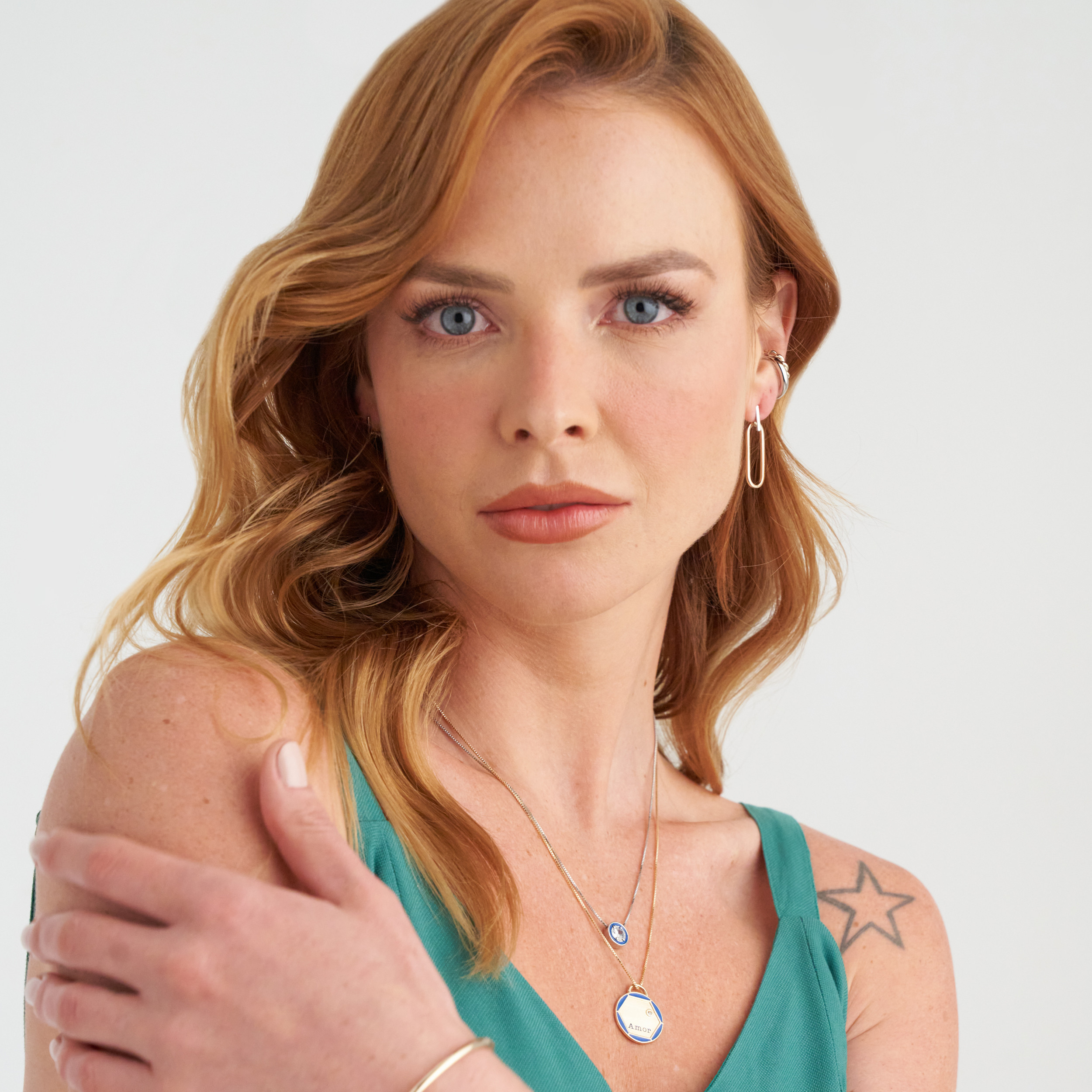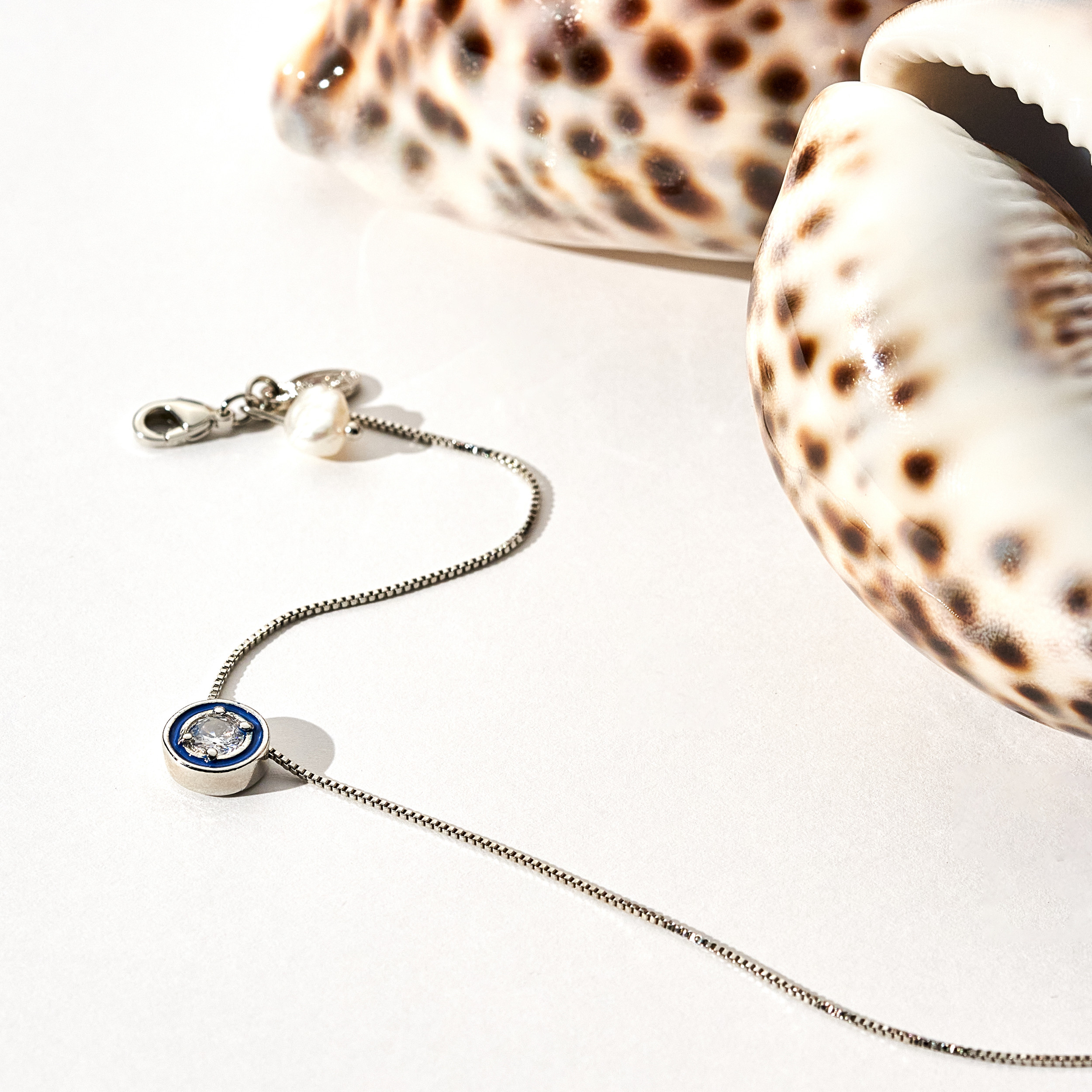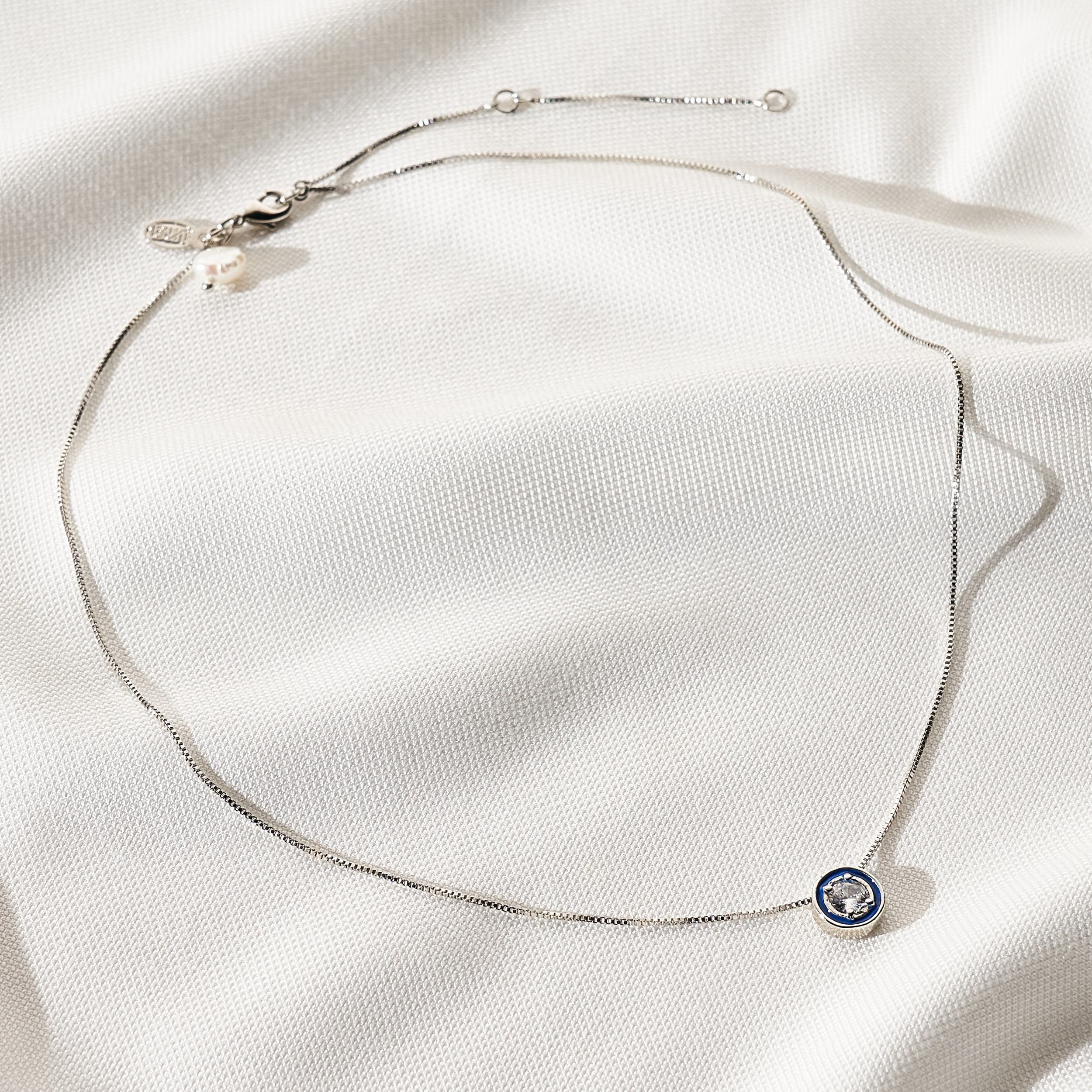 Colar Lici moderno de corrente veneziana com pingente central de ponto de luz de zircônia e detalhe de resina azul. Mini placa Una e Ps 139:14. Fecho lagosta com detalhe de pérola natural de água doce com extensor em 3 medidas. Banhado em ródio branco, com verniz antialérgico e níquel free. Pode ter variações no formato e cor da pérola.