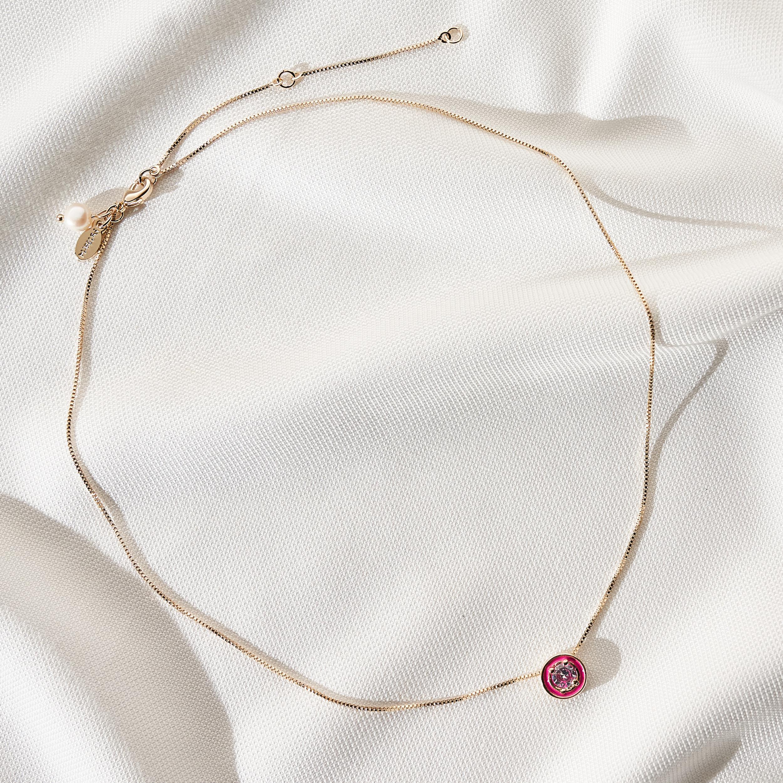Colar Lici moderno de corrente veneziana com pingente central de ponto de luz de zircônia e detalhe de resina pink. Mini placa Una e Ps 139:14. Fecho lagosta com detalhe de pérola natural de água doce com extensor em 3 medidas. Banhado em ouro 18k, com verniz antialérgico e níquel free. Pode ter variações no formato e cor da pérola.