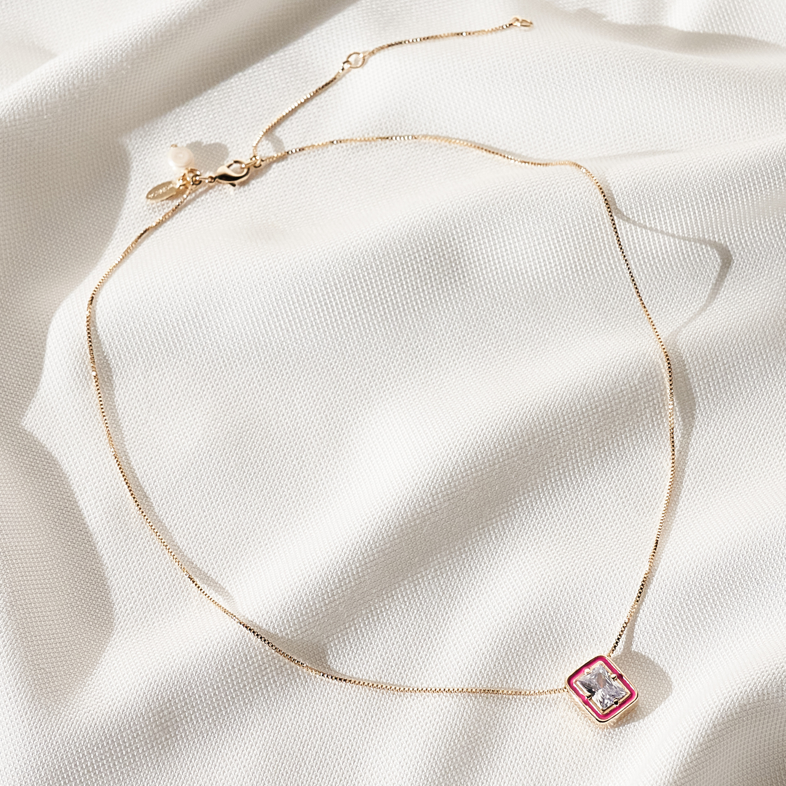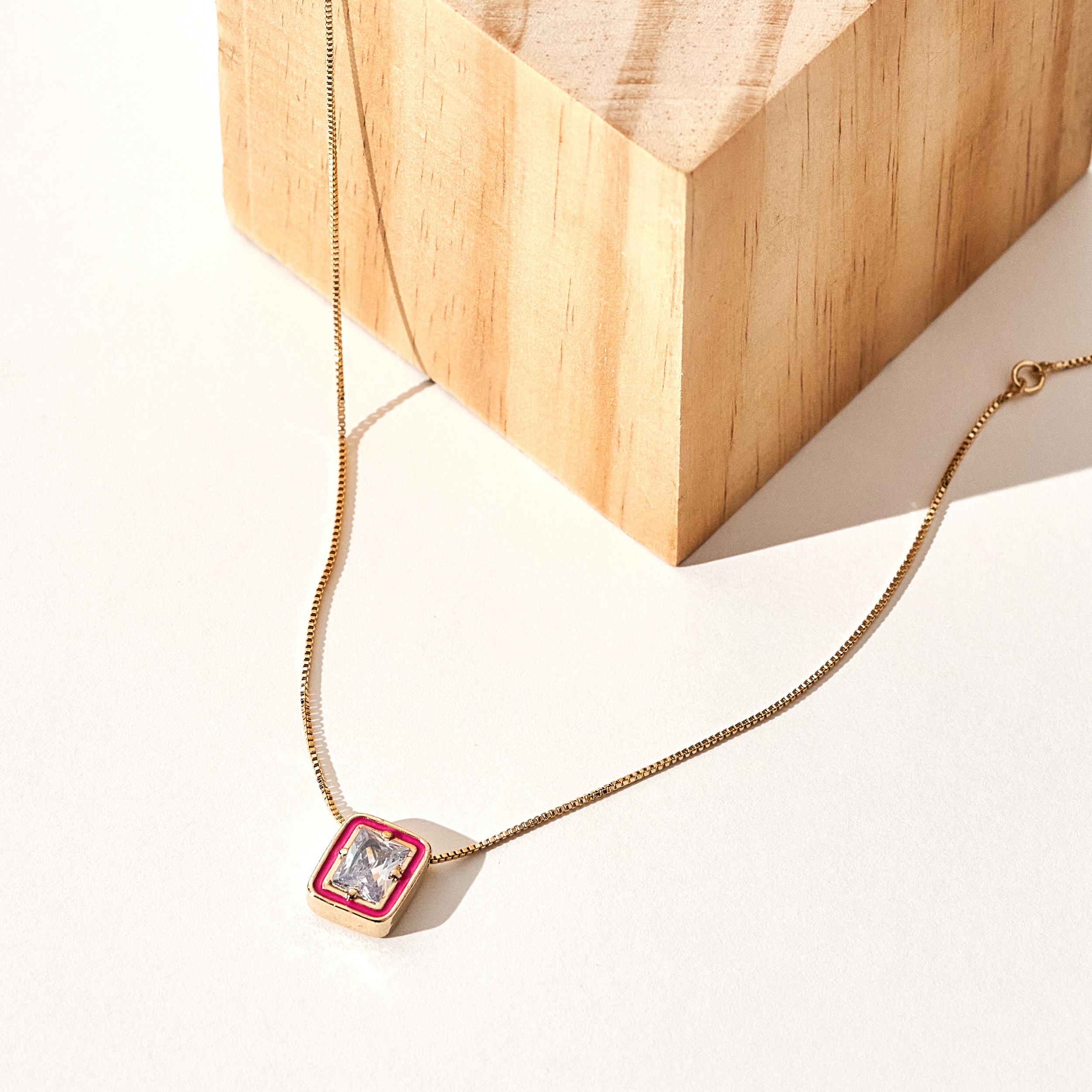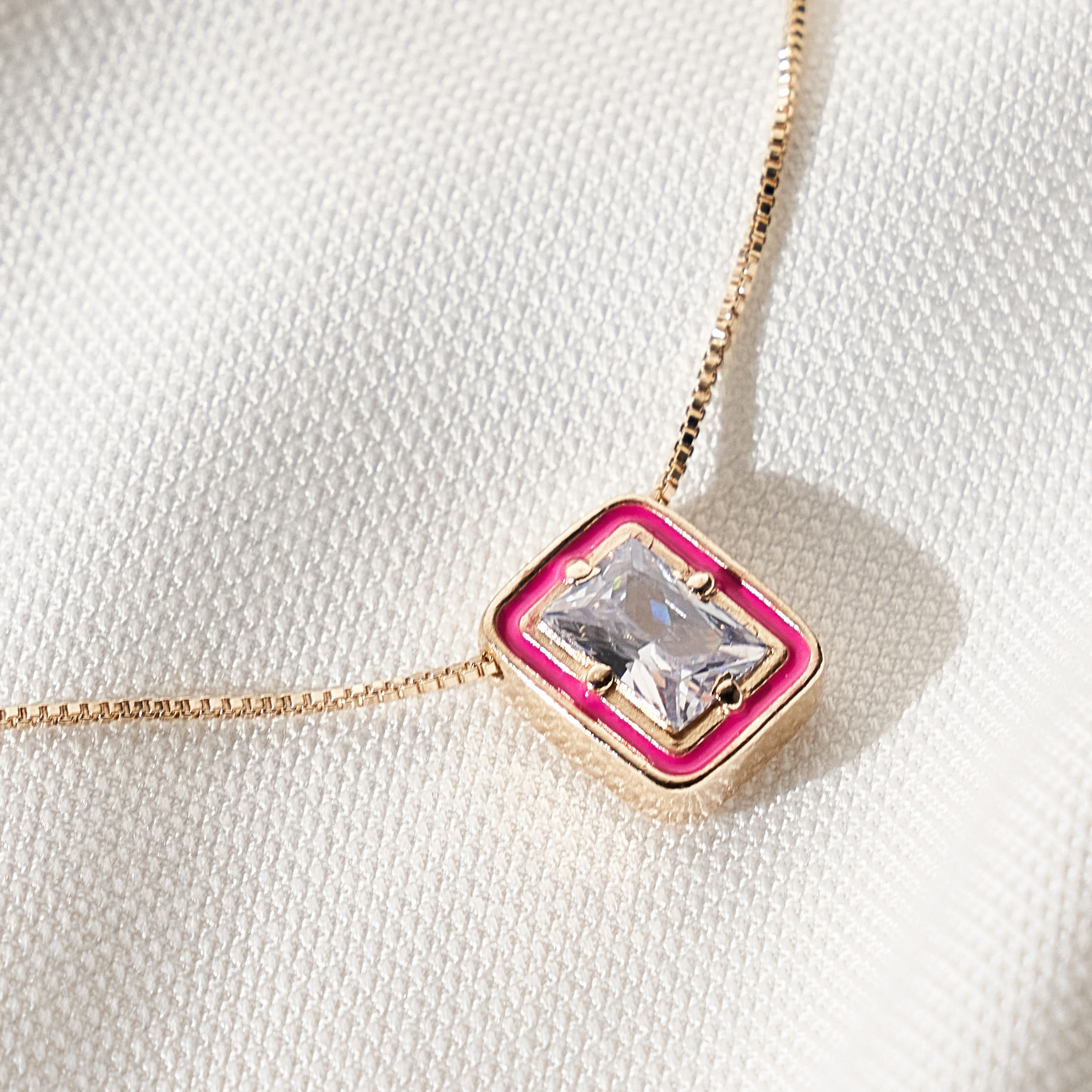 Colar May moderno de corrente veneziana com pingente central de baguete de zircônia e detalhe de resina pink. Mini placa Una e Ps 139:14. Fecho lagosta com detalhe de pérola natural de água doce com extensor em 3 medidas. Banhado em ouro 18k, com verniz antialérgico e níquel free. Pode ter variações no formato e cor da pérola.