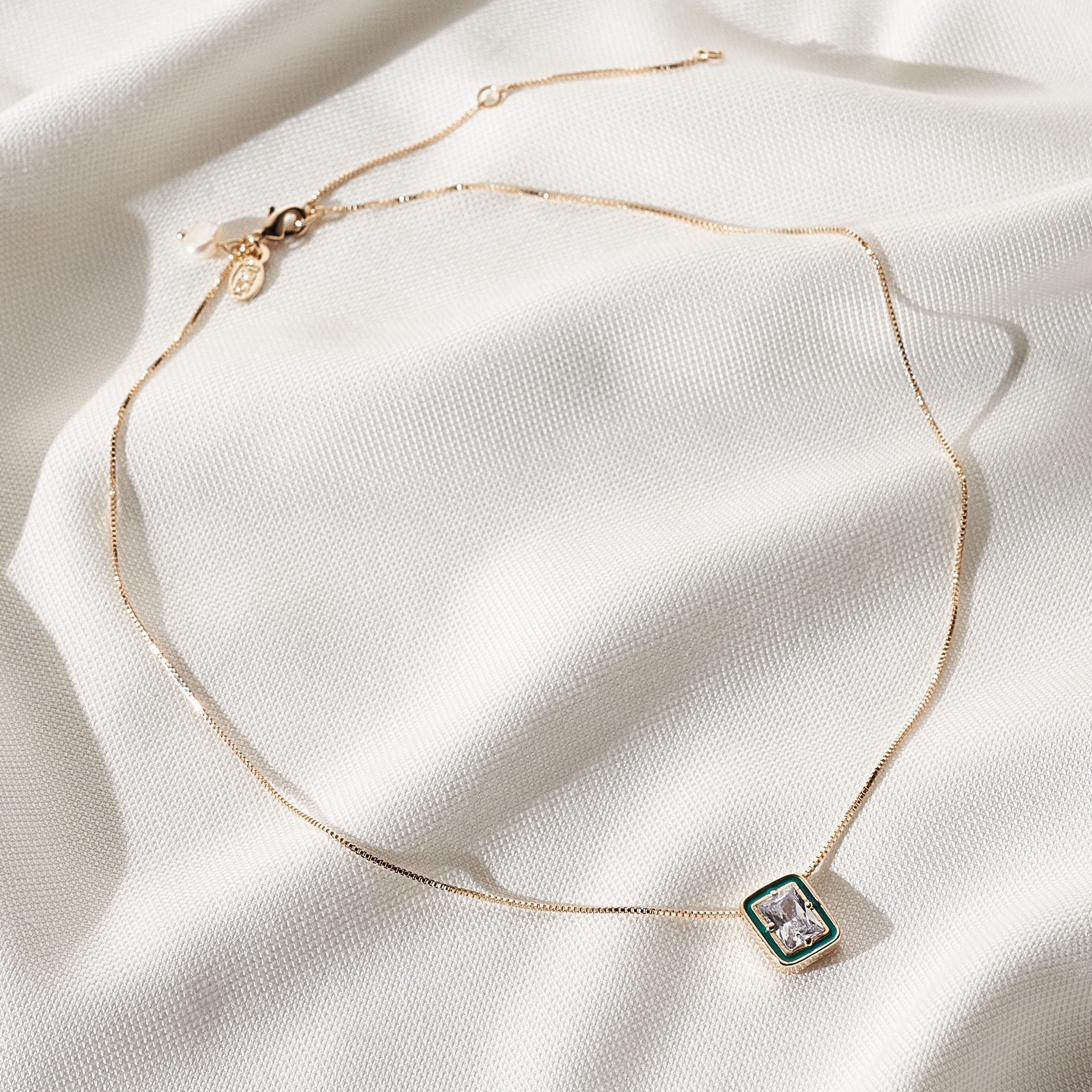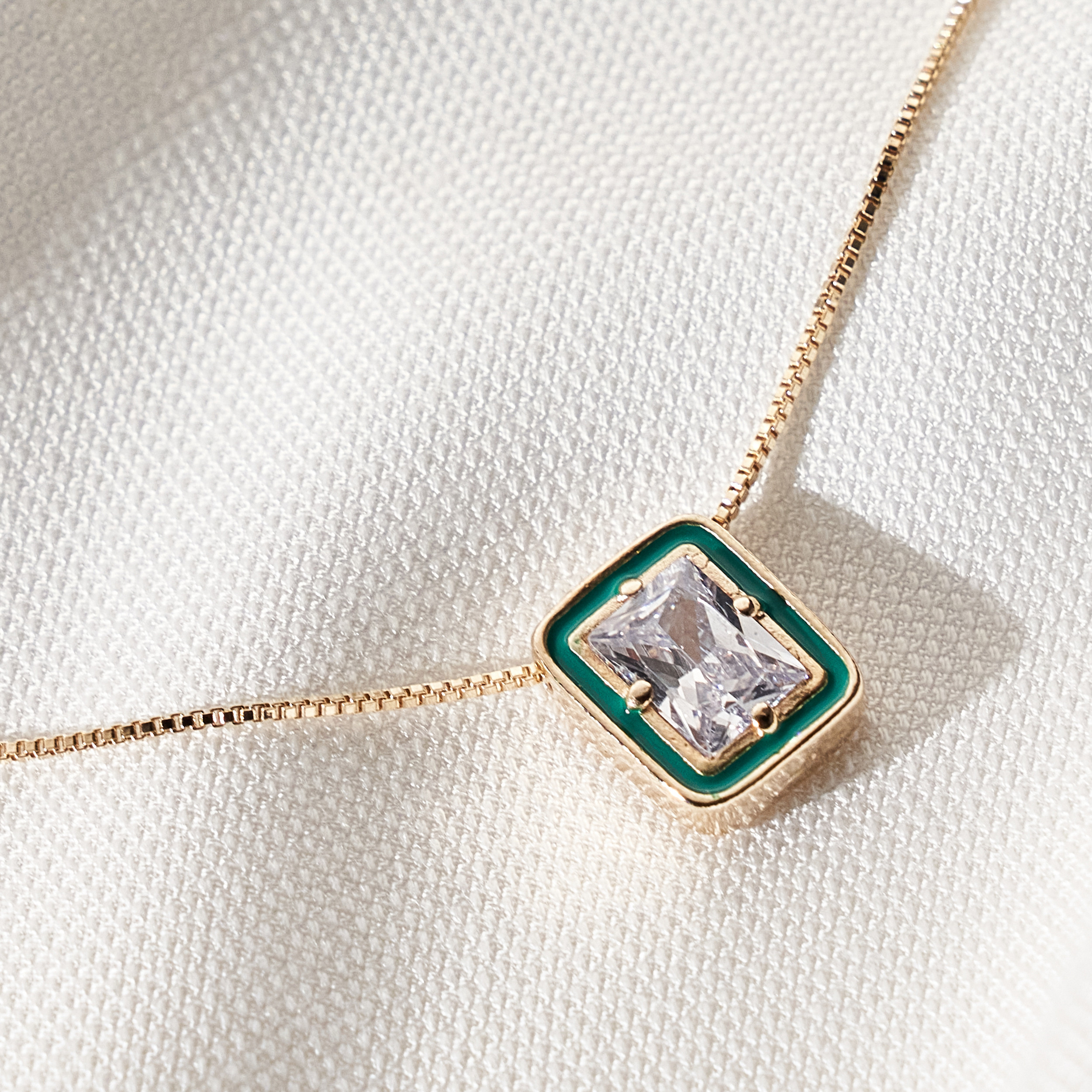 Colar May moderno de corrente veneziana com pingente central de baguete de zircônia e detalhe de resina verde. Mini placa Una e Ps 139:14. Fecho lagosta com detalhe de pérola natural de água doce com extensor em 3 medidas. Banhado em ouro 18k, com verniz antialérgico e níquel free. Pode ter variações no formato e cor da pérola.