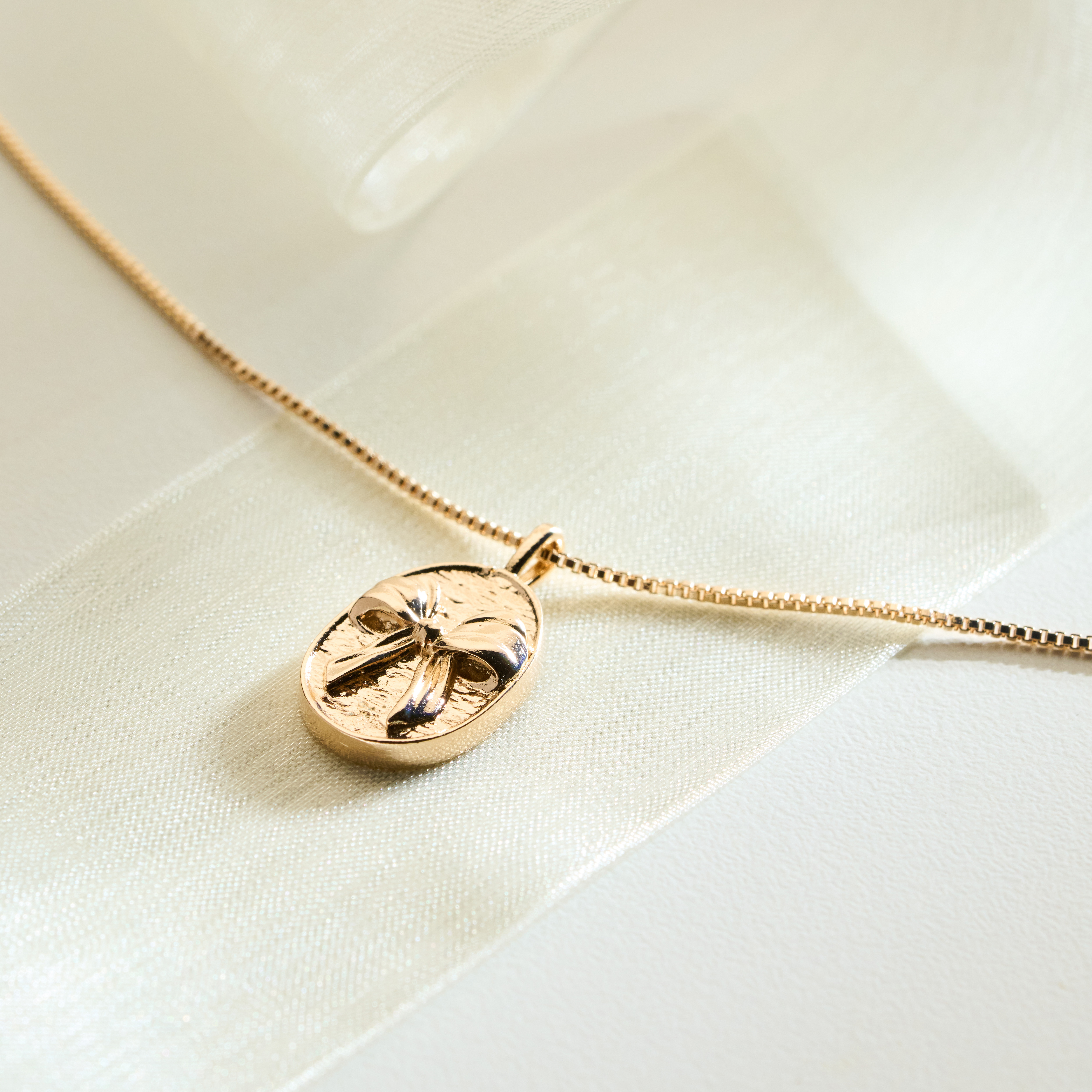 Com um toque delicado e romântico, o colar Niara tem como protagonista o pingente oval texturizado, com um laço em relevo. A corrente veneziana traz leveza ao modelo. Possui extensor em três medidas com fecho lagosta e gravação interna da nossa concha Una. Peça banhada em ouro 18k, com verniz antialérgico e níquel free.