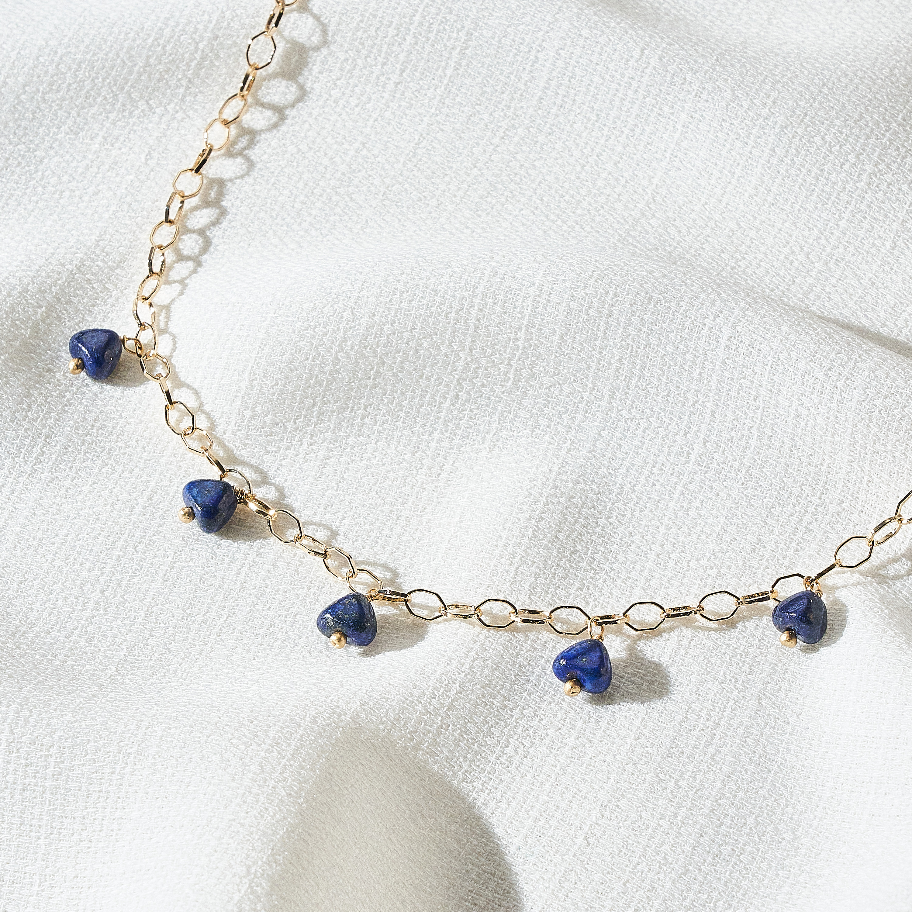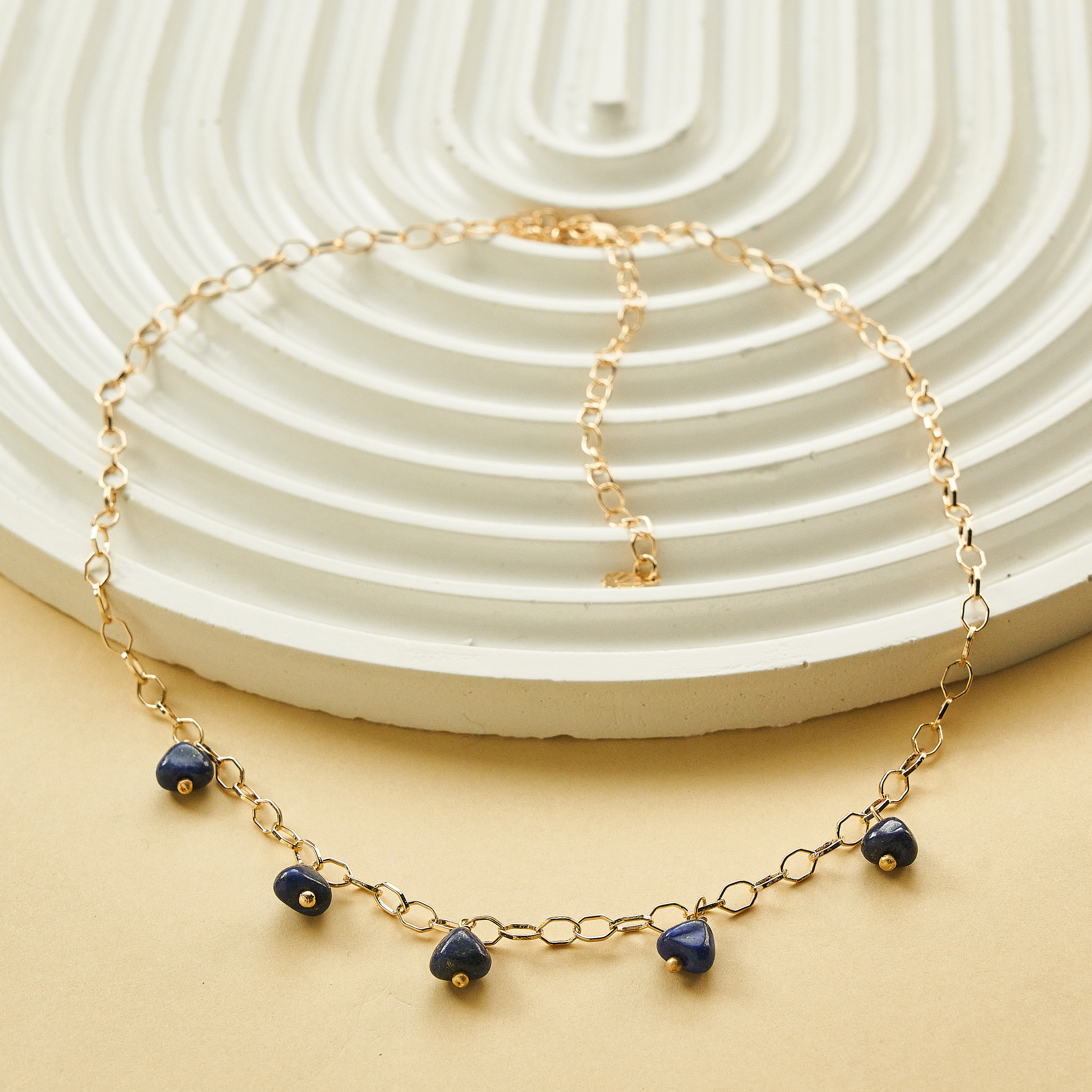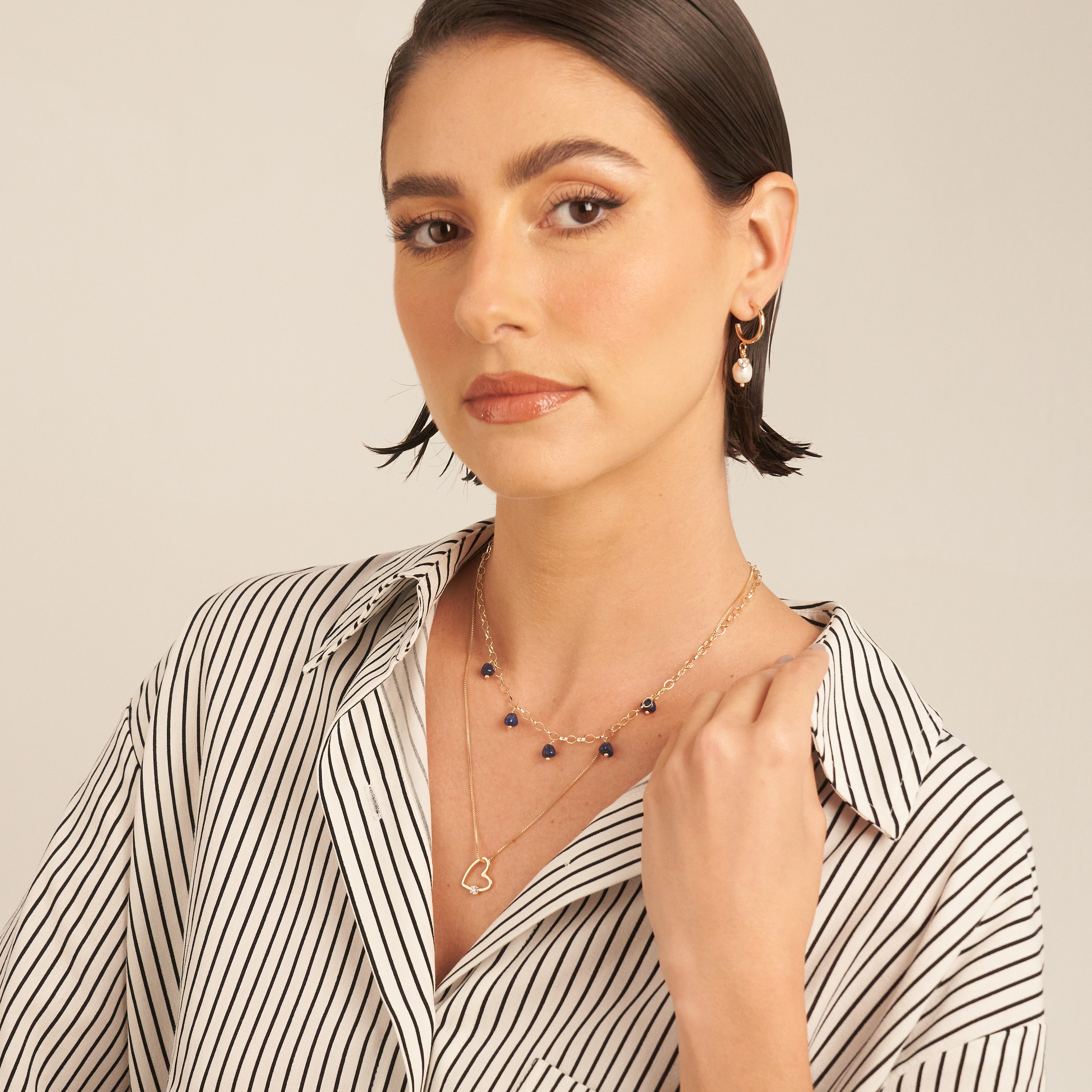 Colar Quenia é uma peça coringa e versátil, de corrente cadeado e pingentes de pedra lápis Lazúli, é perfeito para dar um toque sofisticado no look. Possui extensor de corrente com a nossa concha Una e fecho italiano. Peça banhada em ouro 18k, com verniz antialérgico e níquel free.