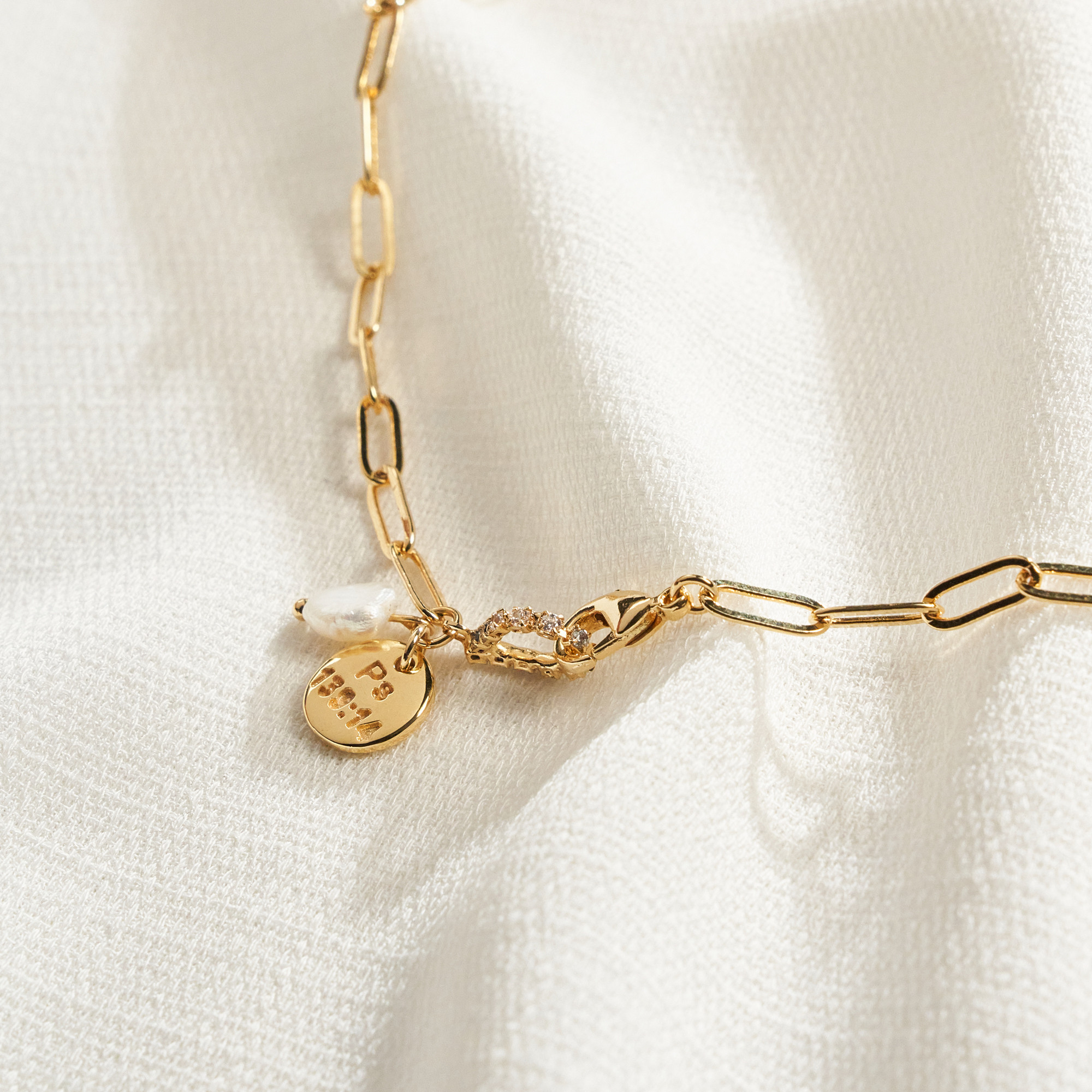 Colar Vivien charmoso corrente cartier. Fecho lagosta com pingente gota cravejado de zircônias, pérola barroca pão. Mini placa oval (Ps 139:14). Banhado em ouro 18k, com verniz antialérgico e níquel free. Pode ter variação no formato e cor da pérola.