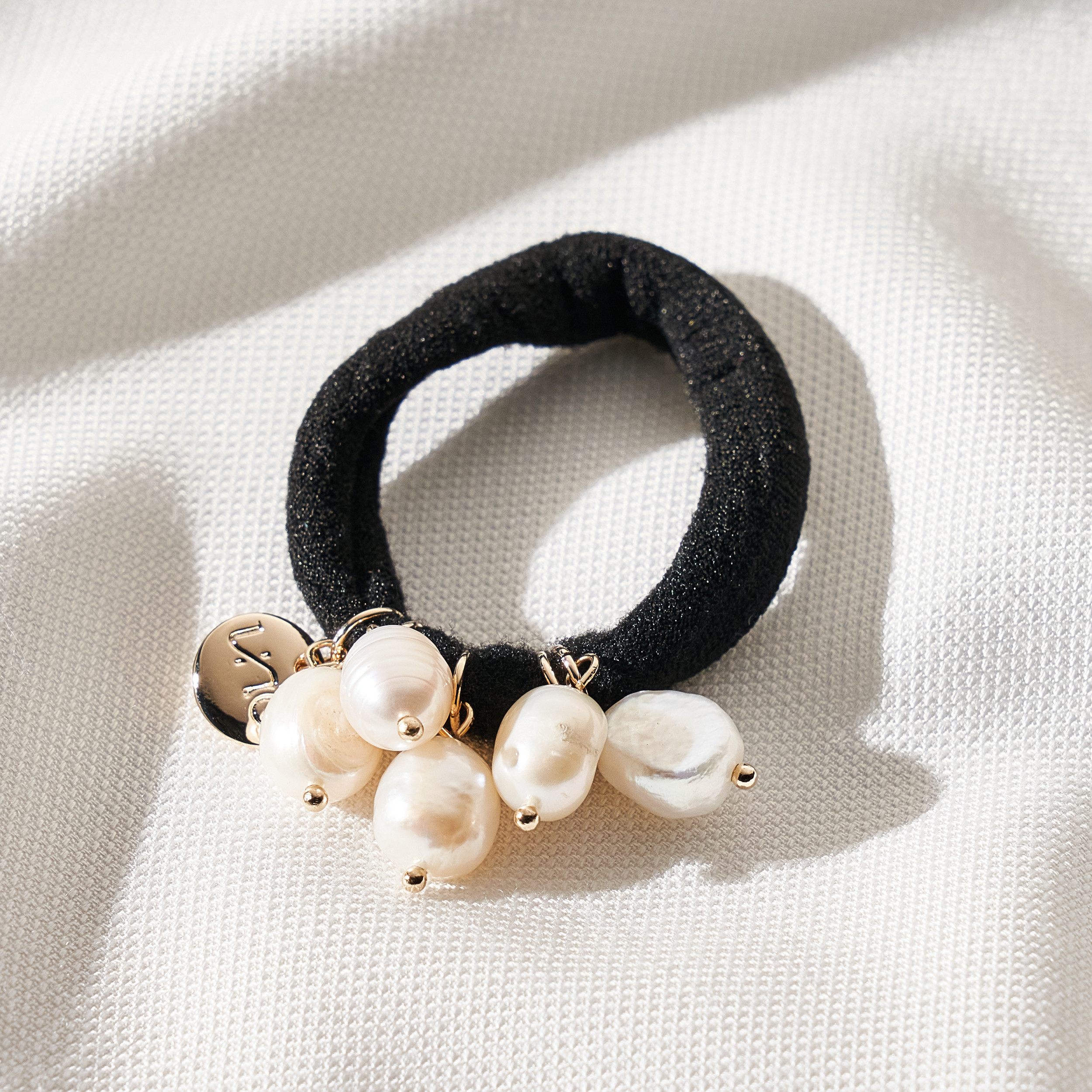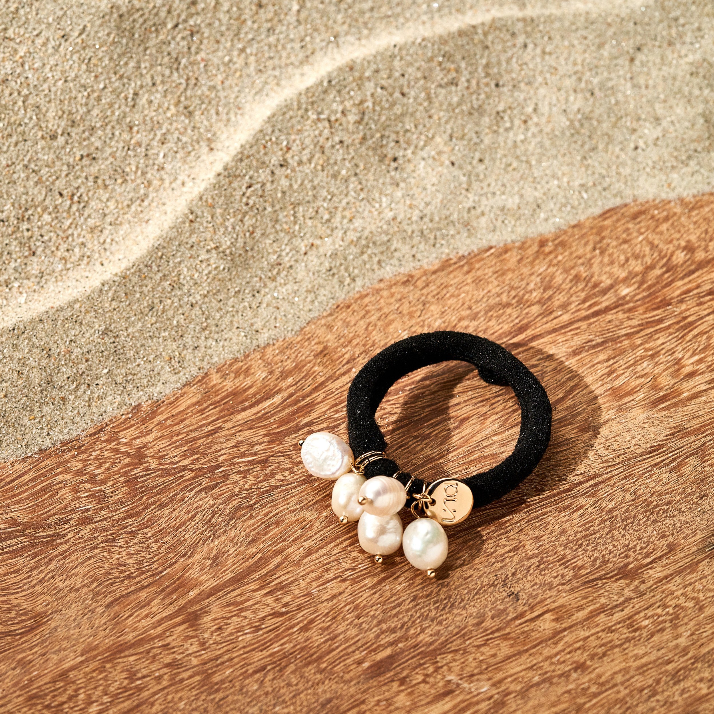 Elástico de cabelo Gaela com detalhe de cinco pérolas naturais de água doce. Mini placa Una e Ps 139:14. Banhado em ouro, com verniz antialérgico e níquel free. Pode ter variações no formato e cor das pérolas.