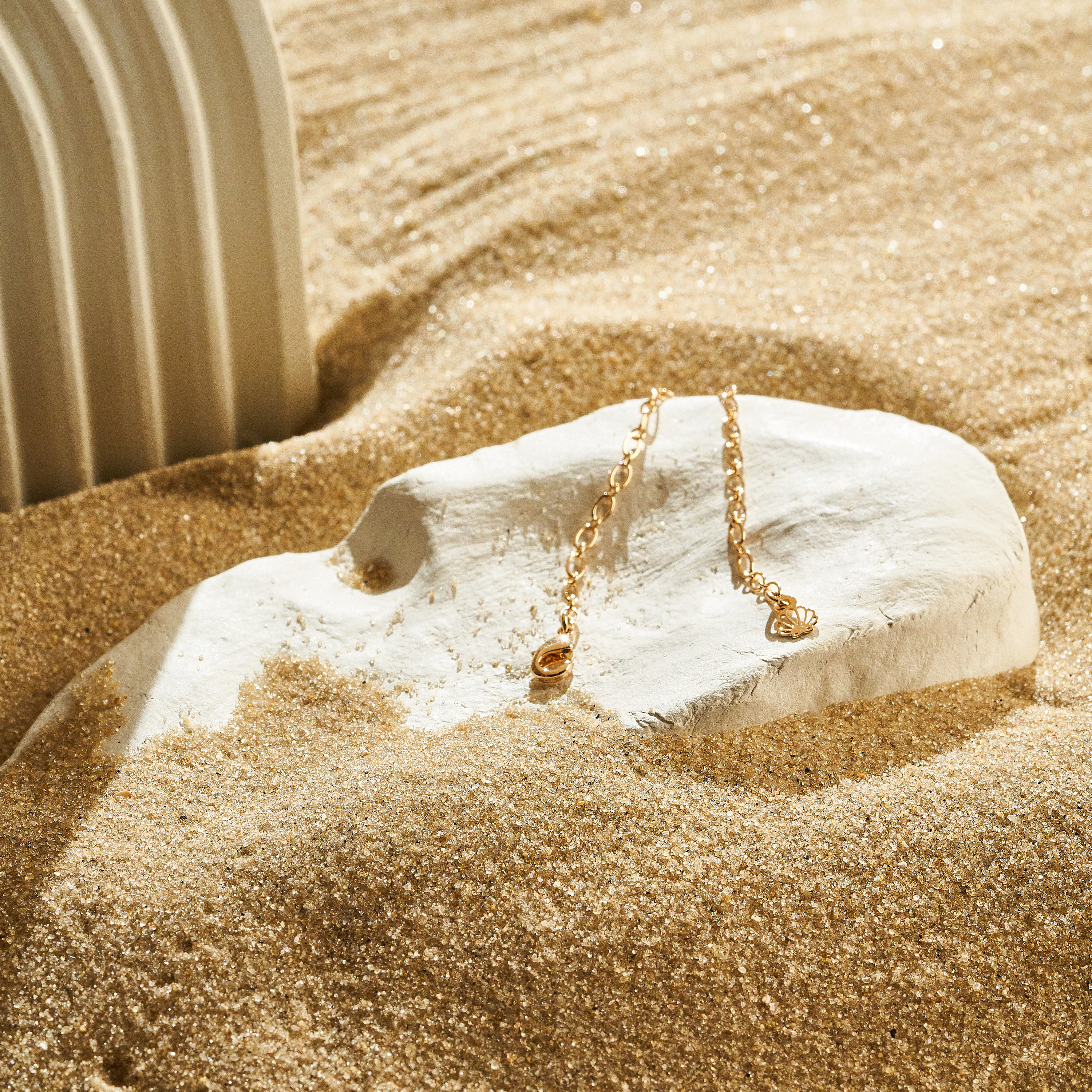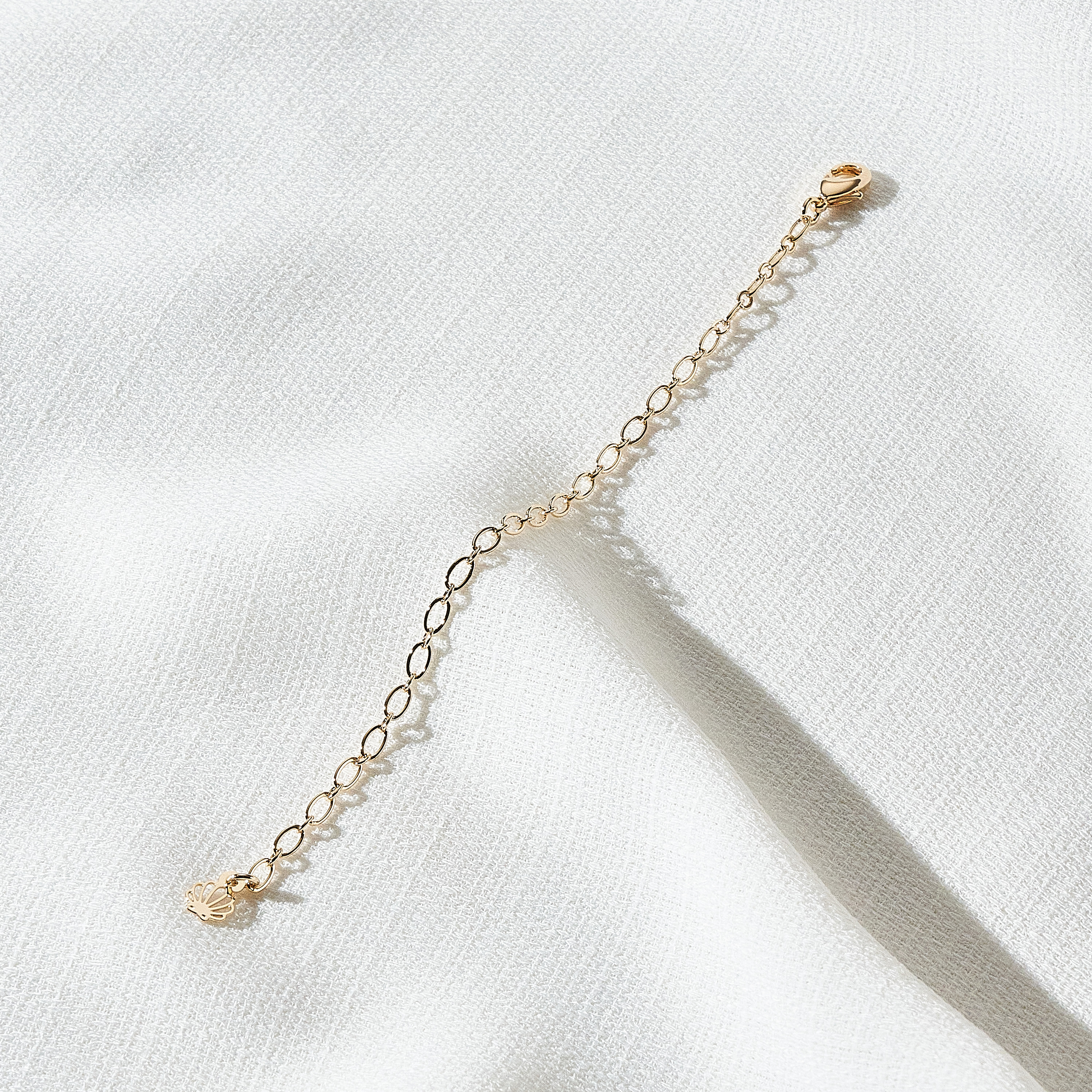 O extensor Adalia é composto por uma corrente trabalhada de elos elípticos e circulares intercalados. O extensor permite aumentar o comprimento de colares, pulseiras, e tornozeleiras. A peça possui fecho lagosta e pingente em formato da concha da Una. Extensor banhado em ouro 18k, recebeu camada de verniz antialérgico e não possui níquel na composição.